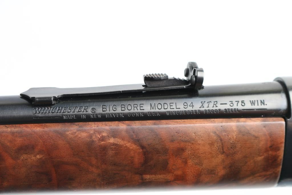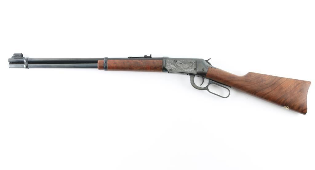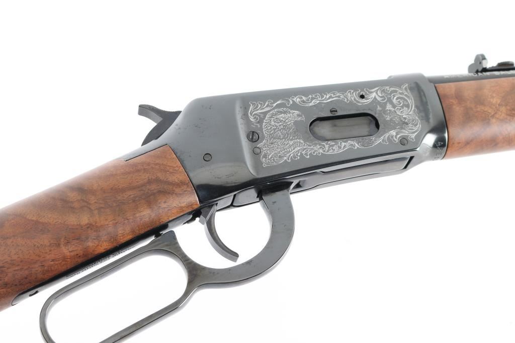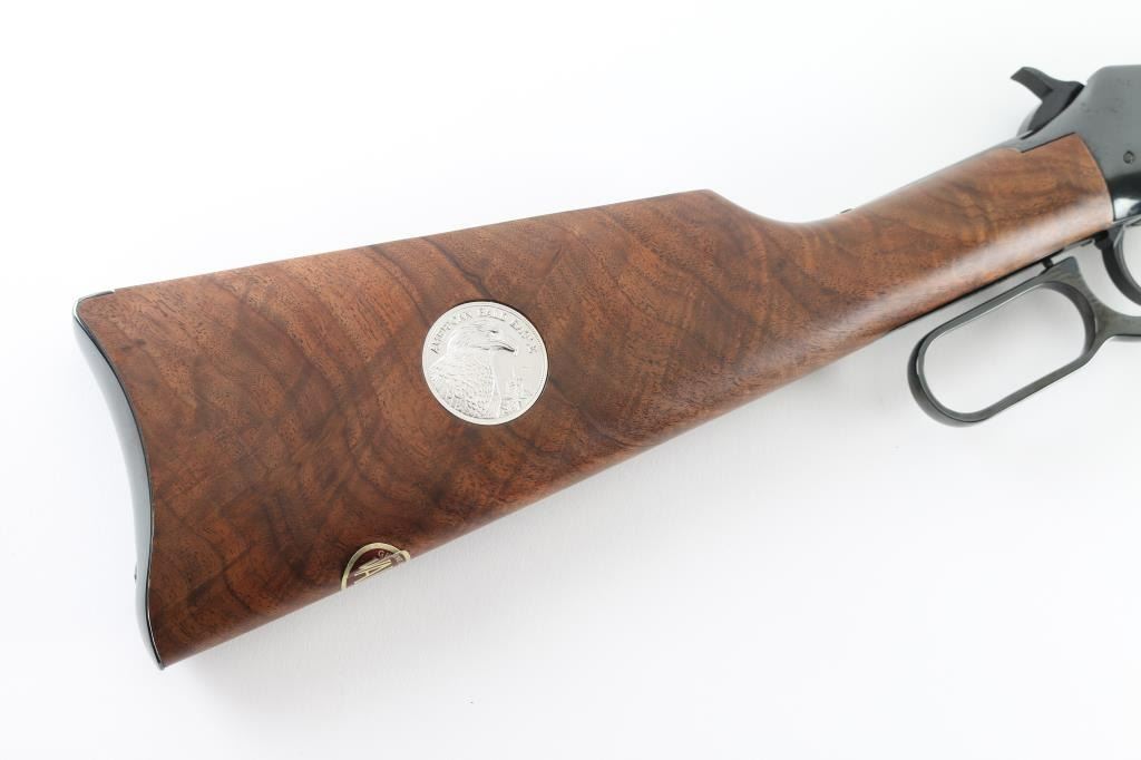 375 Winchester SN: ABE1118 Silver Edition commemorative lever action rifle celebrating the American Bald Eagle, manufactured with a "Big Bore 94" receiver circa 1982. Reportedly limited to 2800 rifles. Features blued finish, smooth extra fancy walnut stocks with straight wrist, 20" barrel, blade front sight (on ramp, with hood), sporting rear sight, carbine butt with smooth metal buttplate, receiver has thicker reinforced section at the rear. Barrel is engraved "AMERICAN BALD EAGLE" in block letter with silver color inlay. Sides of receiver are engraved with 75% coverage, scenes of bald eagles in flight or in portrait, with pine trees, surrounded by floral scrolls. Silver finish coin in buttstock continues the motif. Bore is very good. Retains 98% finish with minor handling marks, small area of distressed finish at front right bottom of receiver. Wood is excellent with fiddle grain, contrasting dark and lighter colors, some burl in the forend. Condition is near NRA Excellent *** Modern Firearm ***