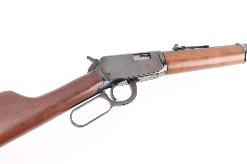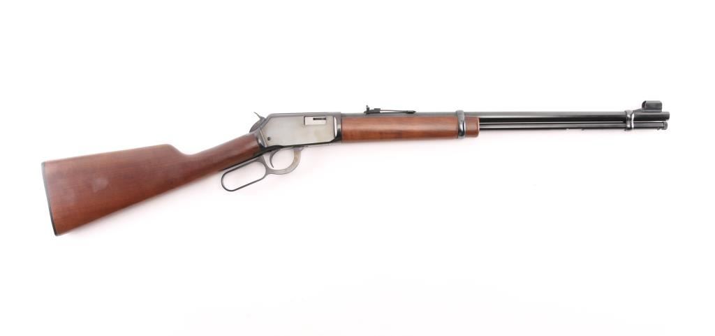 Lever action rimfire rifle features blued finish, nicely figured smooth walnut forend & stock, flat plastic buttplate, 20" barrel, full length magazine tube under barrel, hooded blade front & sporting rear sights. Bore is excellent bright condition. Overall condition is excellent with few handling marks. Wood is very good condition with few minor blemishes. Condition is NRA Excellent *** Modern Firearm ***