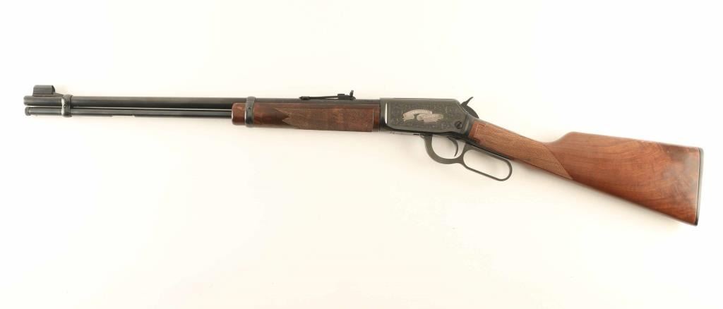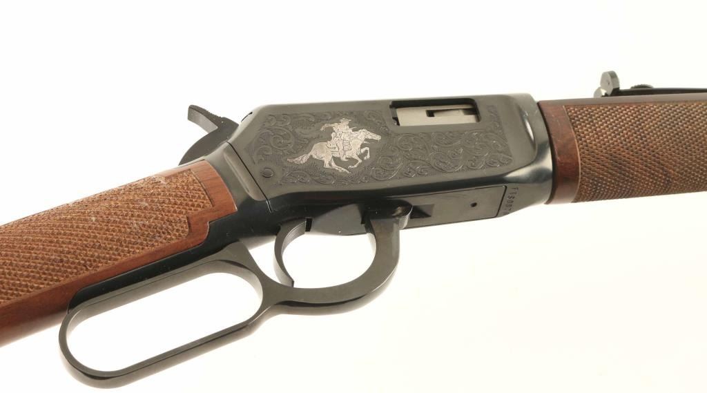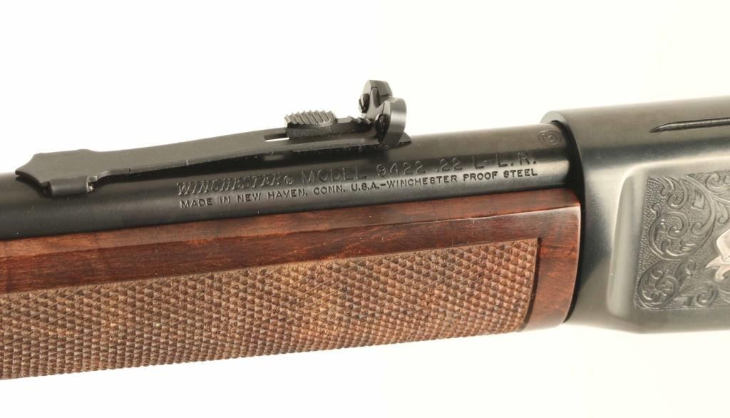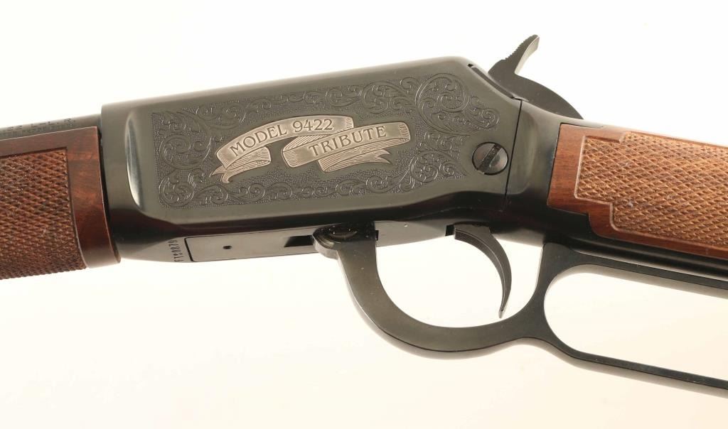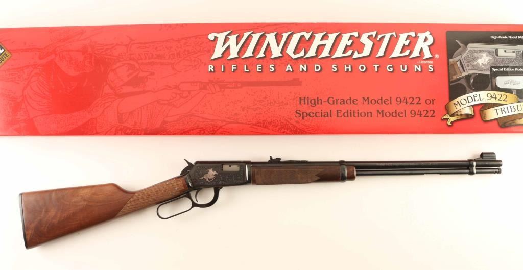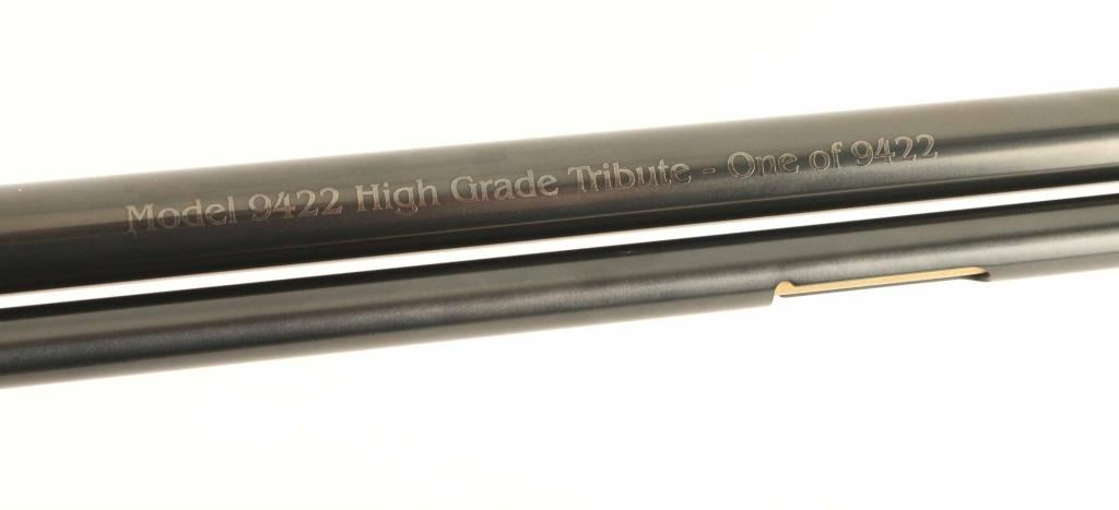 "High Grade Tribute" Lever action rifle features blued finish, engraved receiver, fancy figured walnut forend & stock, checkered panels at wrist & forend, flat plastic buttplate, 20" barrel, full length magazine tube under barrel, buckhorn sights with blade front & protective hood. Bore is excellent. Overall condition is like new with few signs of handling. Sides of receiver feature majority coverage of floral scroll engraving surrounding an image: right side has Winchester Pony Express Rider logo, left side has a banner "MODEL 9422 TRIBUTE". Right side of barrel bears a silver colored inlay "Model 9422 High Grade Tribute - One of 9422", inlay has dulled and appears subdued. Includes original box & manual inside brightly colored sleeve for the 9422 tribute rifle, with outer shipping box. Condition is NRA Excellent - like new *** Modern Firearm ***
