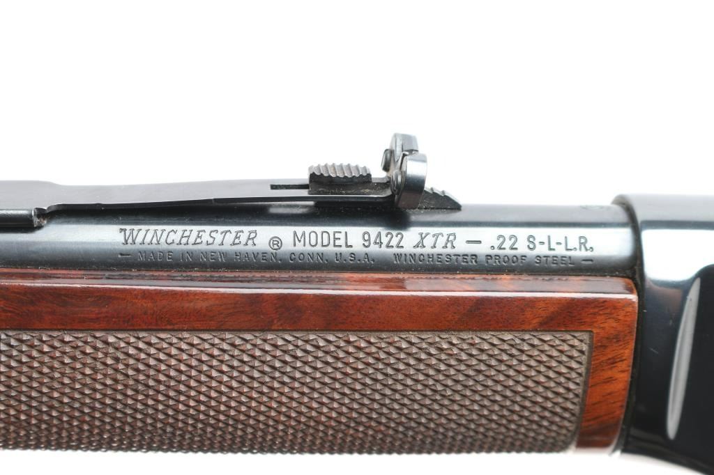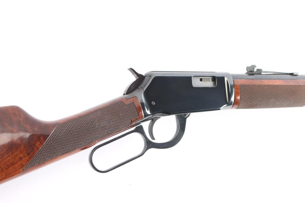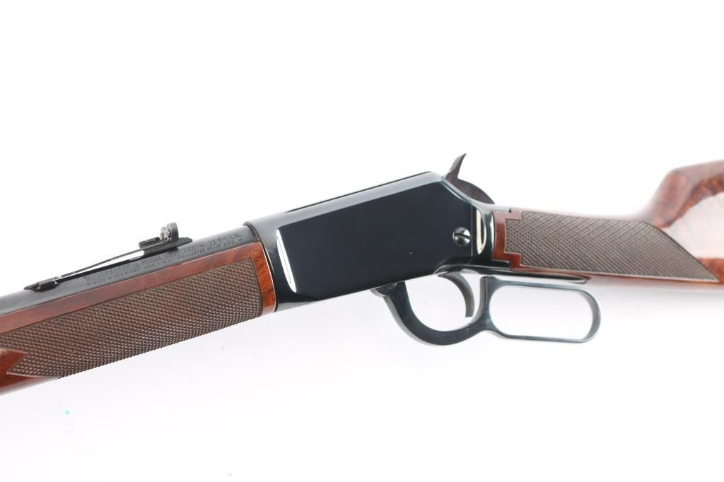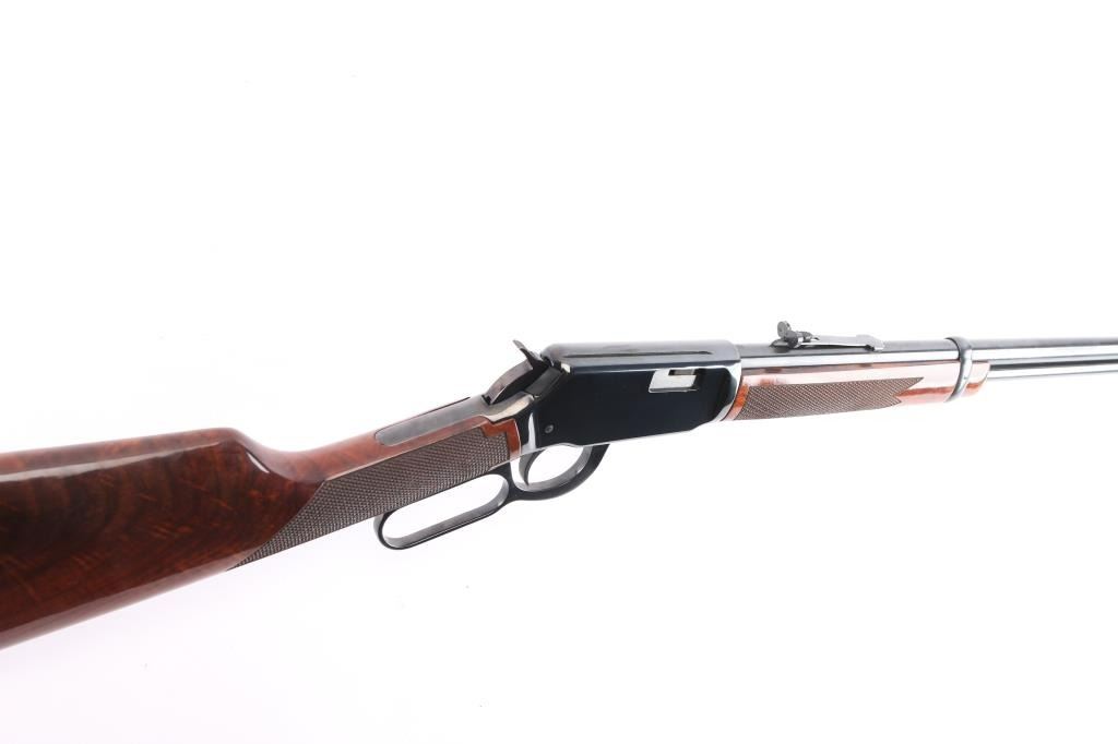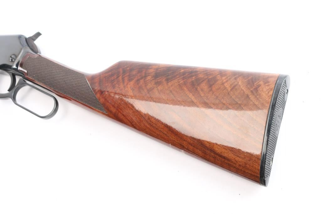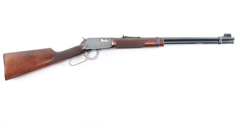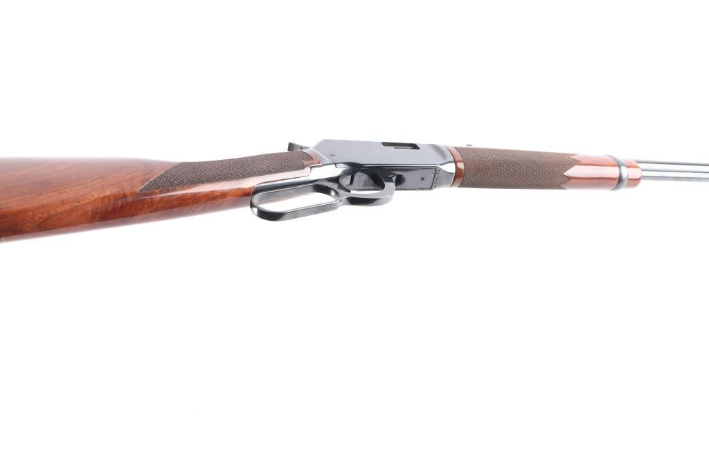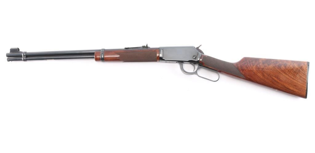 Desirable lever action rimfire rifle manufactured in New Haven, CT. Features a high polish blued finish, fancy figured checkered walnut forend & stock, factory buttplate, 20" barrel, full length magazine tube under barrel, adjustable buckhorn sights with blade front & protective hood. Bore is excellent/bright. Retains 99% finish with few signs of handling. Wood is excellent and the action is smooth. Manufactured 1985.