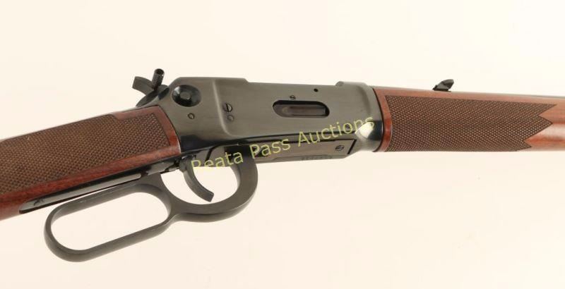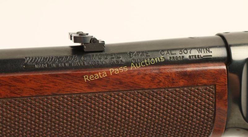'Angle Eject' Lever-action repeating rifle chambered in the scare .307 Winchester caliber. Features a blued finish, 20" barrel, ramped & hooded blade front sight, adjustable flip-up rear sight, full-length magazine tube with removable swivel stud, drilled & tapped receiver, beveled trigger, checkered hammer spur extension, push button safety, grip safety, checkered walnut forend and straight grip shoulder stock with swivel stud & thin factory recoil pad. Rifle exhibits approximately 98% of it's original finish showing a few superficial scratches/handling marks with no major wear observed. Action is smooth, bore is pristine and wood stocks are fine. Condition is excellent. ***Modern Firearm***