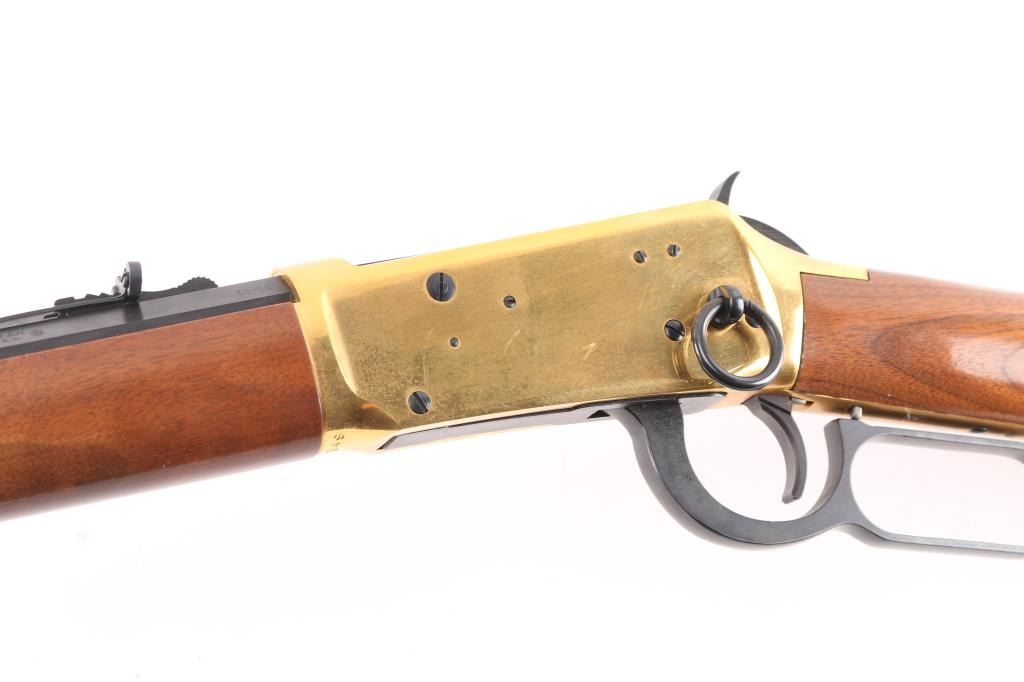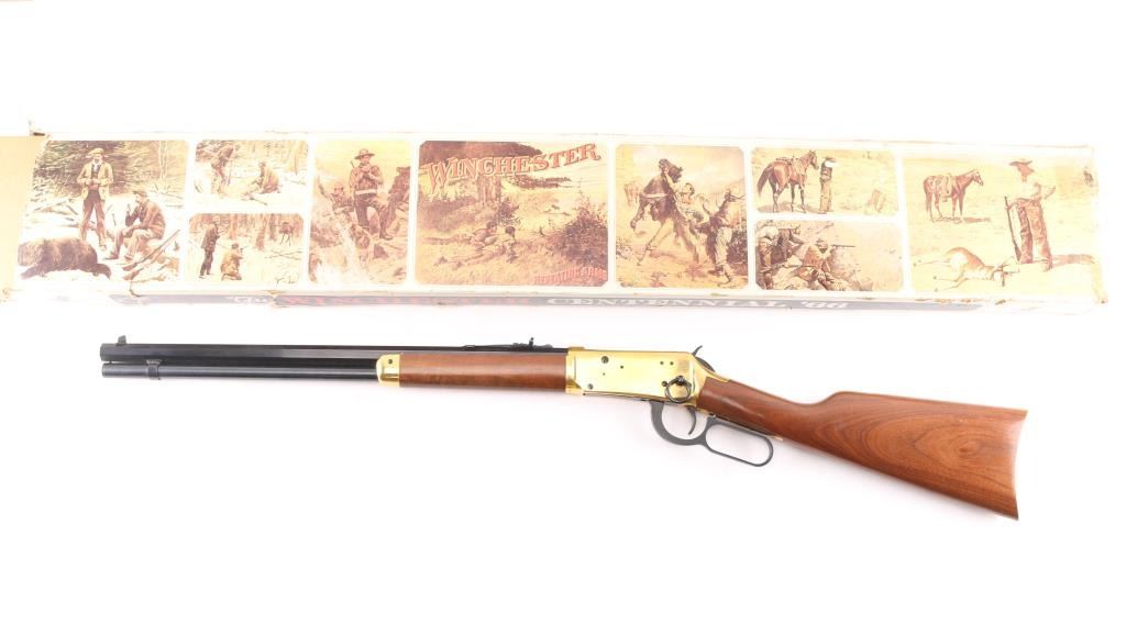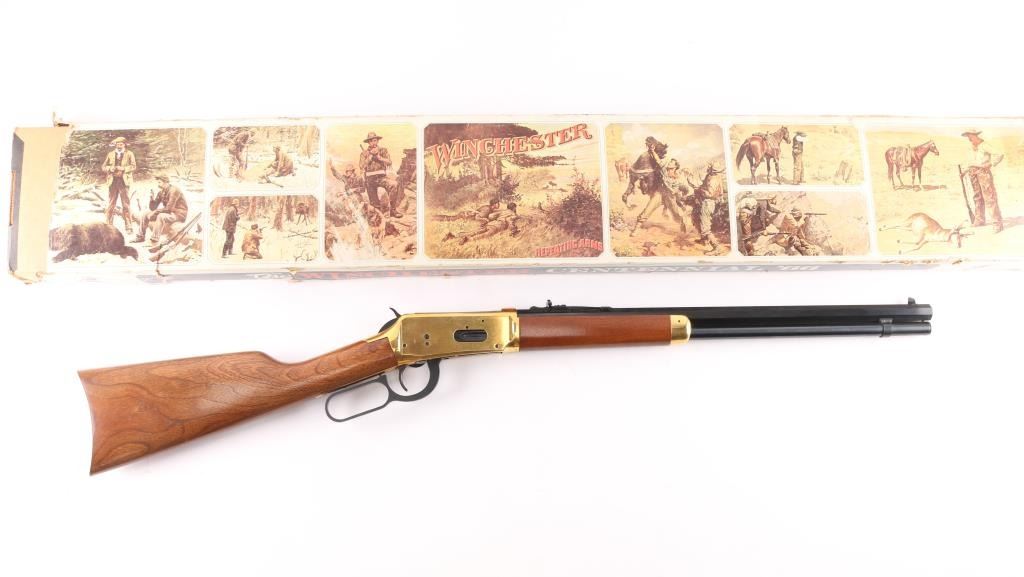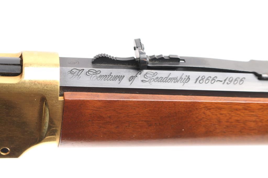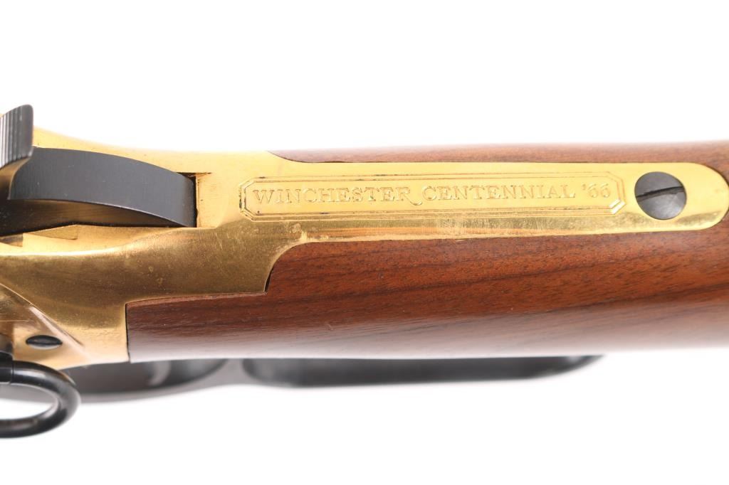 Made in America circa 1966 as one of only 102,309 reported to have been produced. This is a very nice commemorative lever action repeating carbine celebrating 100 years of the Winchester company. “A Century of Leadership 1866-1966” is roll stamped on the right side of the barrel. Features a blued 20" octagonal barrel, full length magazine tube, dovetailed blade front sight, adjustable rear sporting sight, smooth trigger with beveled edges, serrated hammer spur, grip safety, blue saddle ring, brass colored receiver, smooth walnut forend with glossy finish & brass colored metal cap and select grade straight grip shoulder stock with brass colored smooth metal buttplate. The tang reads "Winchester Centennial 66". The metal finish looks great with only a few very minor spots on the barrel and magazine tube. The receiver looks good with some surface scratches and handling marks. The buttplate has an area of patina. The wood stocks are excellent with almost no sign of use or handling. The bore is excellent/bright. Lever action is smooth/crisp. NRA Condition-Excellent. C&R Firearm.