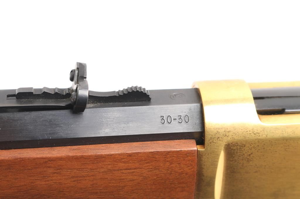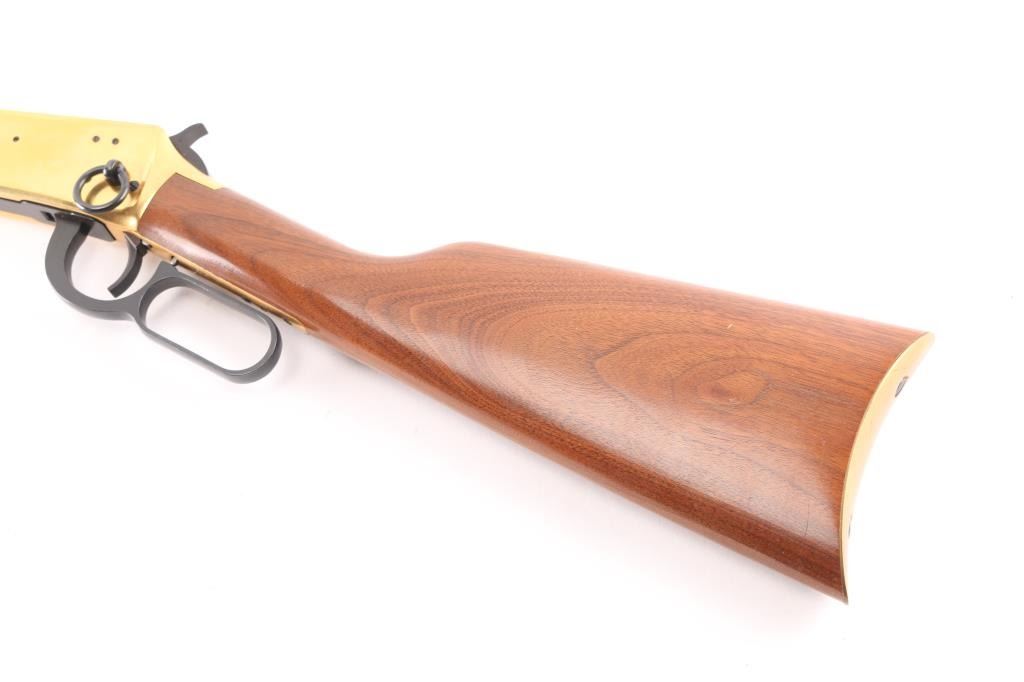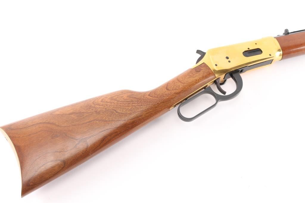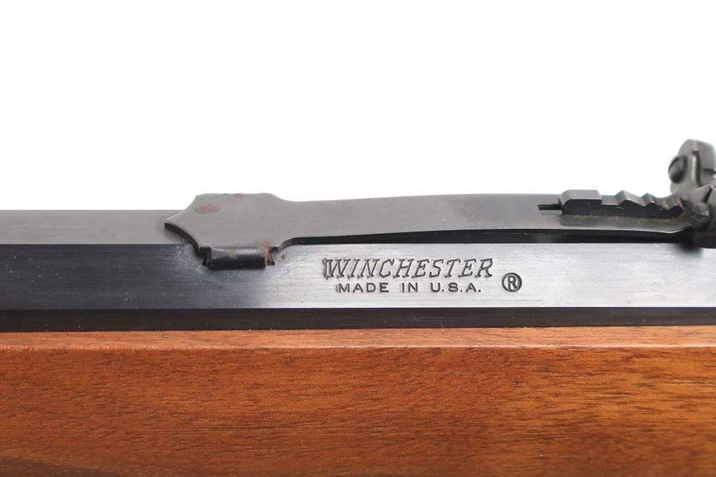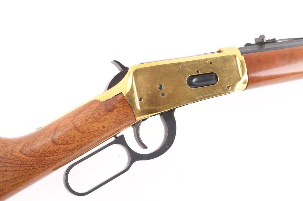 Made in America circa 1966 as one of only 102,309 reported to have been produced. This is a very nice commemorative lever action repeating carbine celebrating 100 years of the Winchester company. “A Century of Leadership 1866-1966” is roll stamped on the right side of the barrel. Features a blued 20" octagonal barrel, full length magazine tube, dovetailed blade front sight, adjustable rear sporting sight, smooth trigger with beveled edges, serrated hammer spur, grip safety, blue saddle ring, brass colored receiver, smooth walnut forend with glossy finish & brass colored metal cap and select grade straight grip shoulder stock with brass colored smooth metal buttplate. The tang reads "Winchester Centennial 66". The metal finish looks great with only a few very minor spots on the barrel and magazine tube. The receiver looks good with some surface scratches and handling marks. The buttplate has an area of patina. The wood stocks are excellent with almost no sign of use or handling. The bore is excellent/bright. Lever action is smooth/crisp. NRA Condition-Excellent. C&R Firearm.