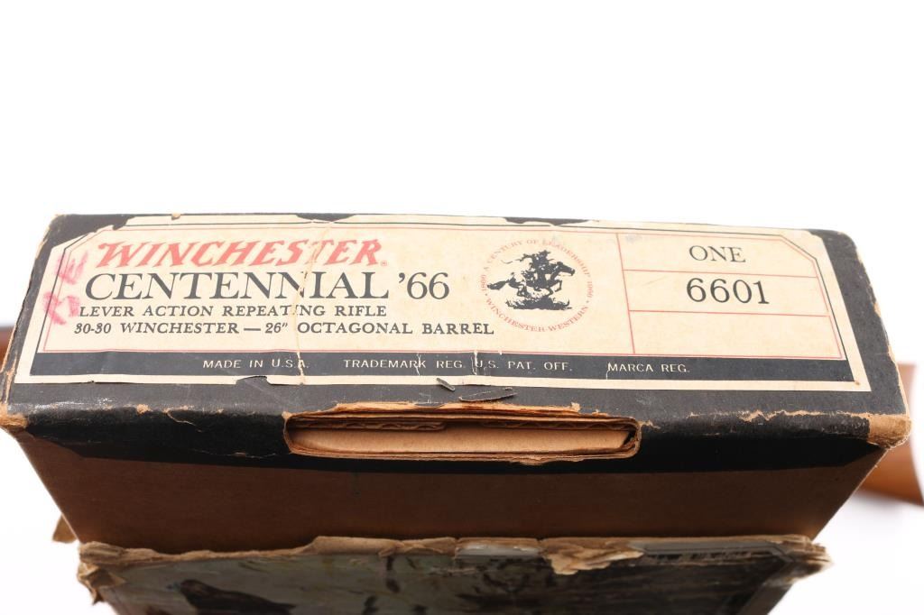 Made in America circa 1966 as one of only 102,309 reported to have been produced. This is a very nice commemorative lever action repeating rifle celebrating 100 years of the Winchester company. “A Century of Leadership 1866-1966” is roll stamped on the right side of the barrel. Features a blued 26" octagonal barrel, full length magazine tube, dovetailed blade front sight, adjustable rear sporting sight, smooth trigger with beveled edges, serrated hammer spur, grip safety, saddle ring, brass colored receiver, smooth walnut forend with glossy finish & brass colored metal cap and select grade straight grip shoulder stock with brass colored smooth metal buttplate. The tang reads "Winchester Centennial '66". The metal finish looks great. The receiver looks good with some surface scratches and handling marks. The wood stocks look excellent with almost no sign of use or handling. The bore is excellent/bright. The action is smooth. LOP is 13 3/4". Comes with the factory box and original colorful sleeve, with manual, documents. Sleeve has some loss, tears. Condition is NRA Excellent. Modern Firearm.