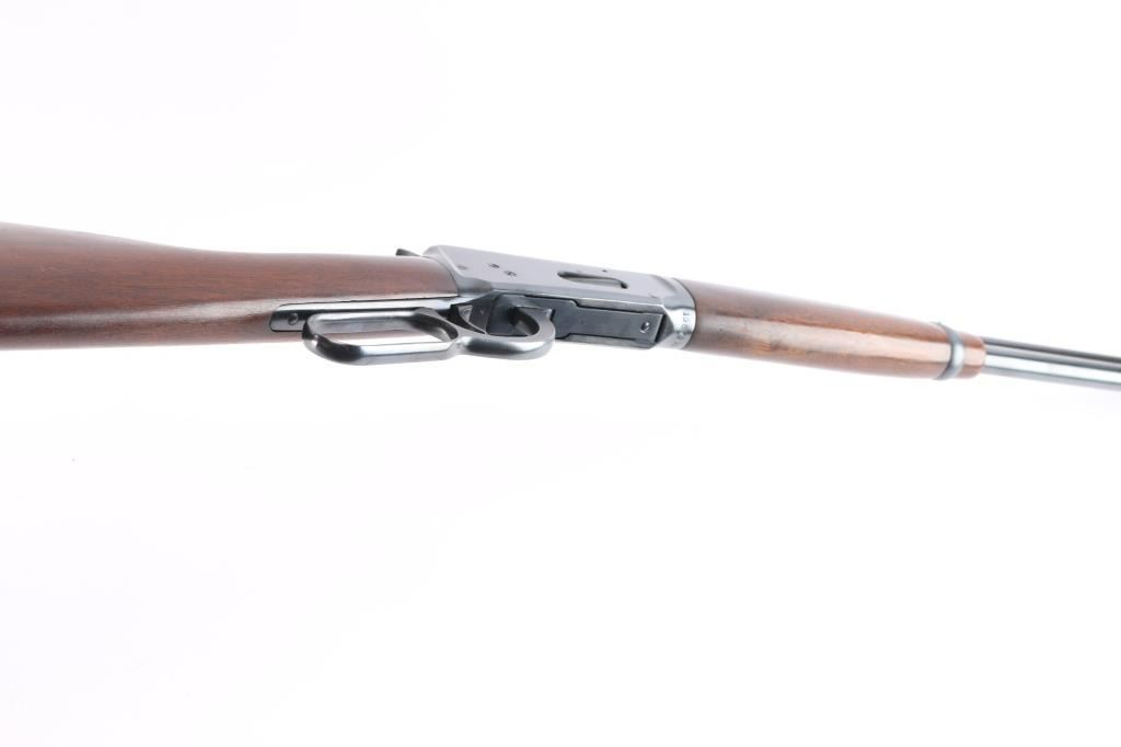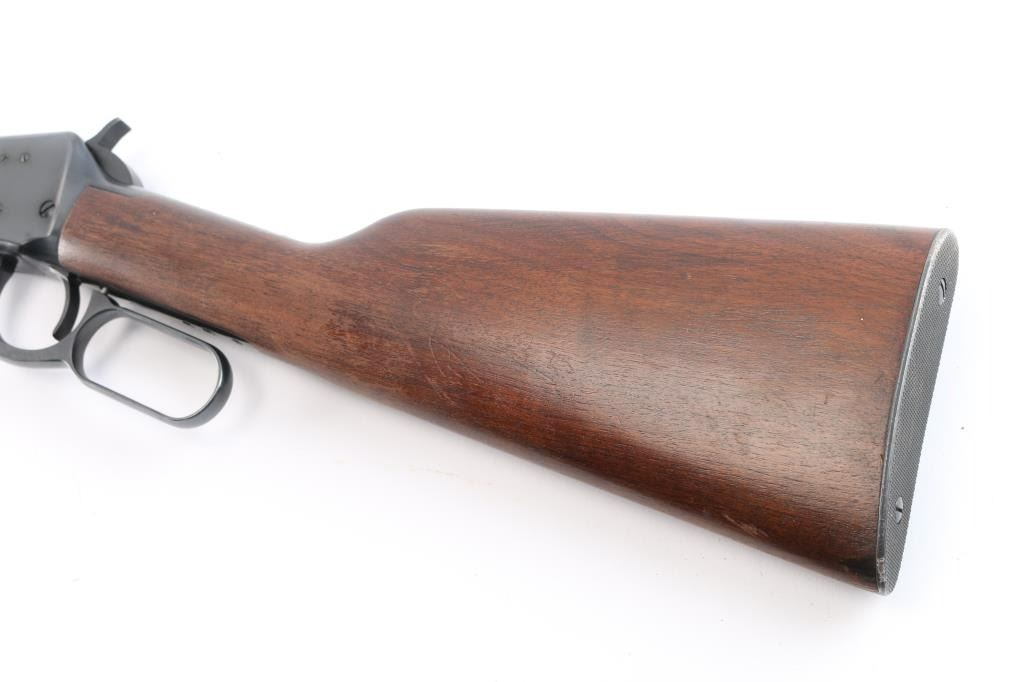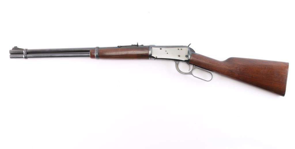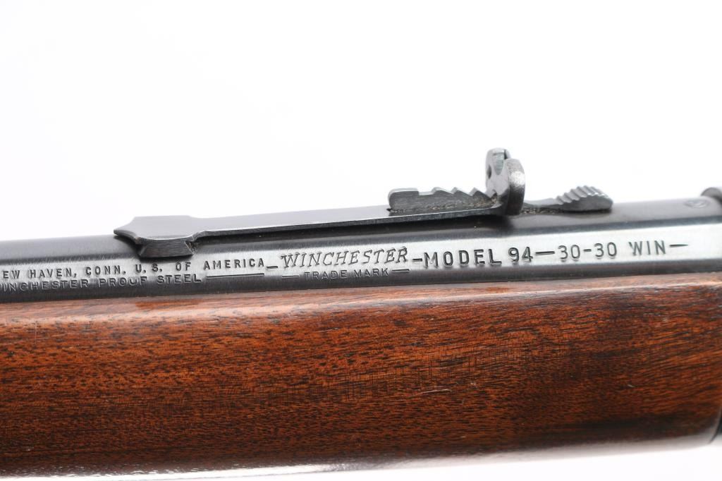 'Pre-64 Eastern Carbine' Vintage lever action repeating rifle chambered in .30-30 Winchester, manufactured in New Haven, CT circa 1952. Features a blued finish, 20" tapered barrel, full-length tube magazine, ramped blade/bead front sight, semi-buckhorn rear sight with elevator, smooth trigger, serrated hammer spur, steel receiver, two barrel bands, smooth walnut forend and straight grip shoulder stock with knurled steel buttplate. Bore is very good, slightly dirty. Retains approx. 95% finish with slight edge wear. Wood is very good with some light scratches. Action is smooth. Winchester markings are crisp/clear. Condition is NRA Excellent. ***C&R Firearm***.