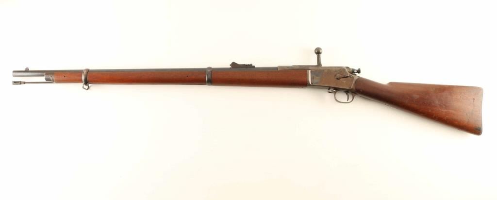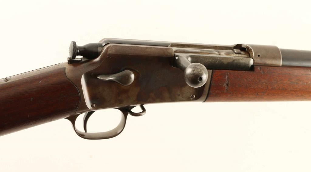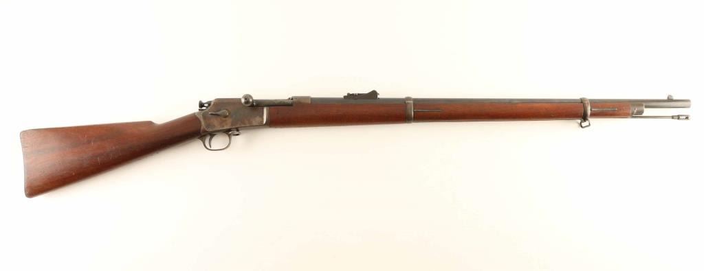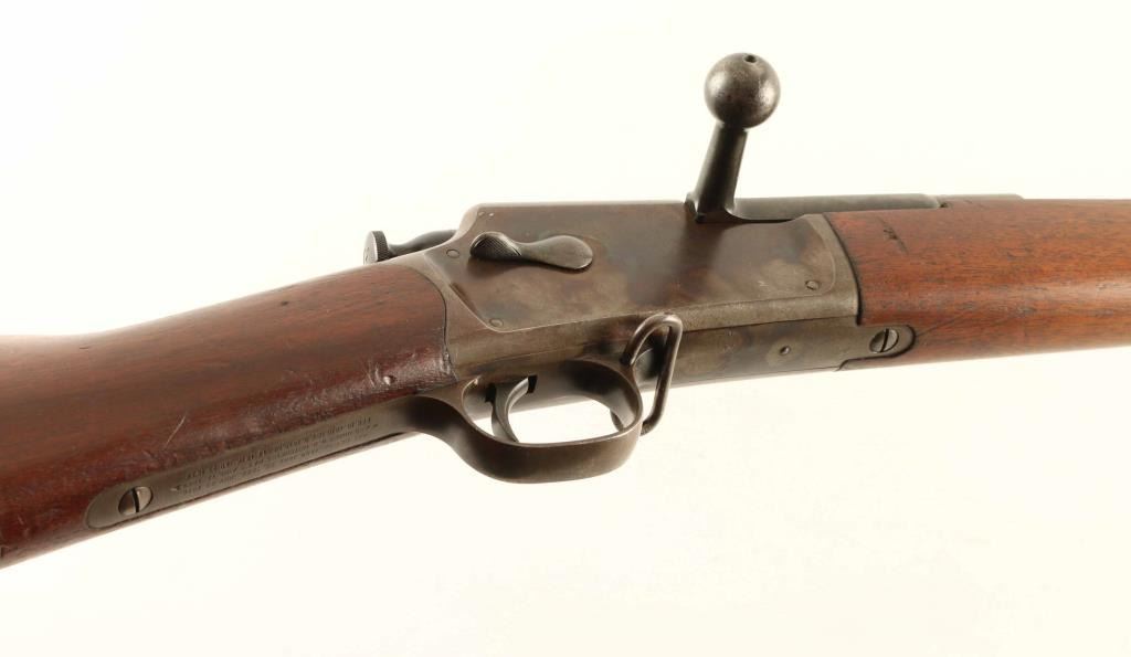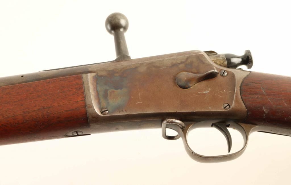 "Third Model" Bolt action rifle features blued finish on barrel & bands, case color receiver, two piece wood stock with straight grip, slightly curved steel buttplate, 28" barrel, cleaning rod under barrel, blade front sight, flip up ladder type rear sight, sling swivels, tubular magazine in butt loads thru receiver, manual safety, magazine cut-off. Bore is very good bright condition. Barrel retains 80% dark blue with scratches, scuffs, several cleaned areas between the bands. Bluing on bands has turned brown, with some original color preserved at edges, some bare metal exposed from rubbing. Blued portions of bolt are very good. Case color on receiver is very good overall with bold contrasts, with small scratches or scuffs showing spots of bare metal. Bolt handle appears case colored, now dulled and mottled gray. Wood is very good condition, clean and with crisp edges on barrel line, with dents and creases. Buttplate is in very good condition. Observed markings are crisp. Condition is NRA Fine *** Antique Firearm ***