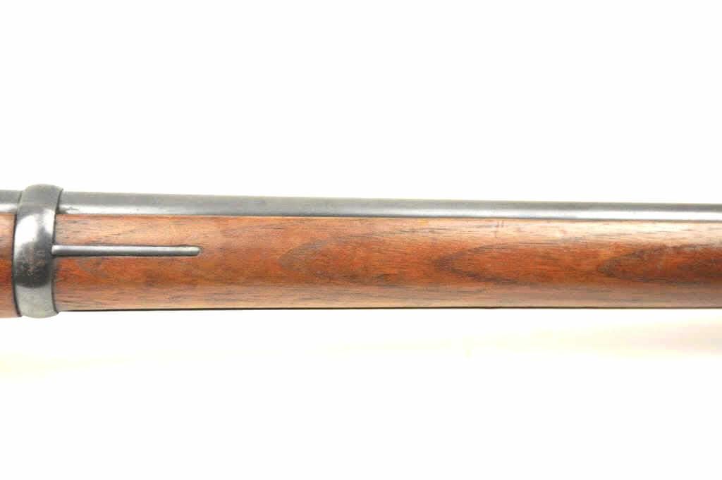 Winchester-Hotchkiss Model 1883 bolt action military musket, .45-70 caliber, Serial #82050. The gun is in fine overall condition with a 28” barrel with a ramped blade front and ladder style rear sights. The rearladder sight has original bright niter blue under the ladder. The barrel, bands and correct ram rod show significant blue finish with a sharp Winchester barrel address. The receiver shows muted toning case hardeningwith a straight bolt handle. The smooth wood stock is in very good condition with some oil staining, a “19” cartouche behind the trigger guard and a smooth steel carbine butt plate showing traces of case coloring. Thebore is bright, the action is crisp and the markings are sharp on this desirable Winchester-Hotchkiss musket. Est.: $1,250-$2,500. (Antique).