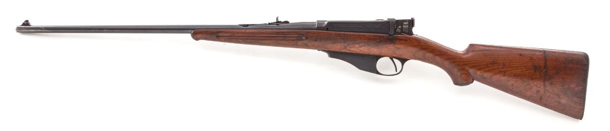 Winchester-Lee Straight-Pull Navy Bolt Action Rifle, #12844, .236 Navy cal., 24'' barrel, blue finish, fingergroove walnut stock. Mfg'd 1898. Condition is very good. Blue surfaces retain approx. 85%-90% finish with most of the wear at high edges and at muzzle. Stock with moderate scuffs, small losses to upper edge left side, and some oil darkening. Action is crisp, bore is good with some frosting in the grooves. Est.: $1,000-$1,500. (Antique)