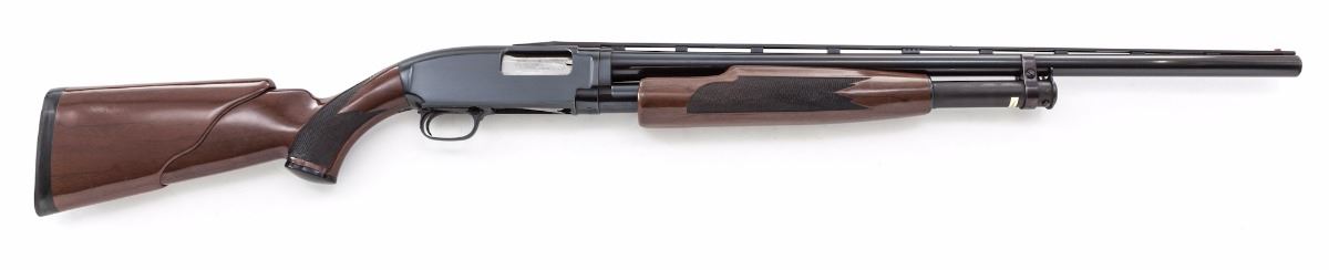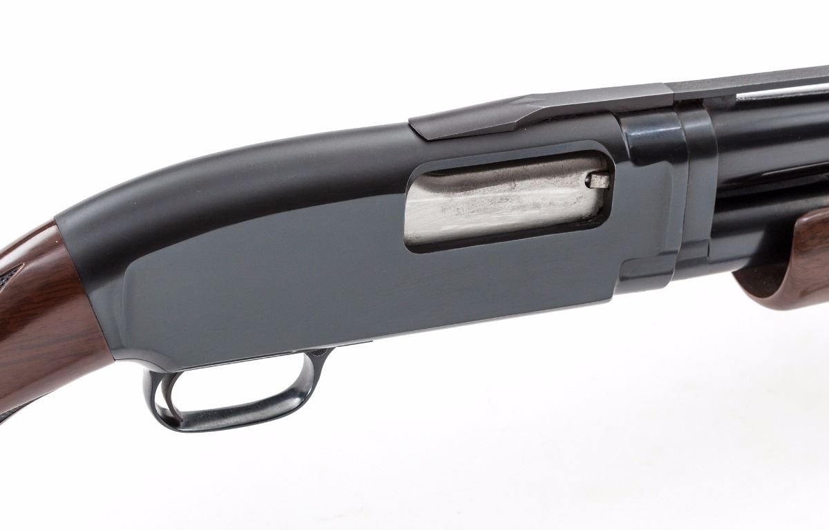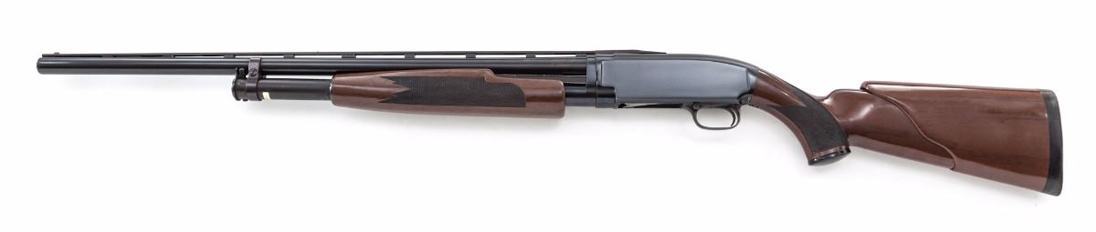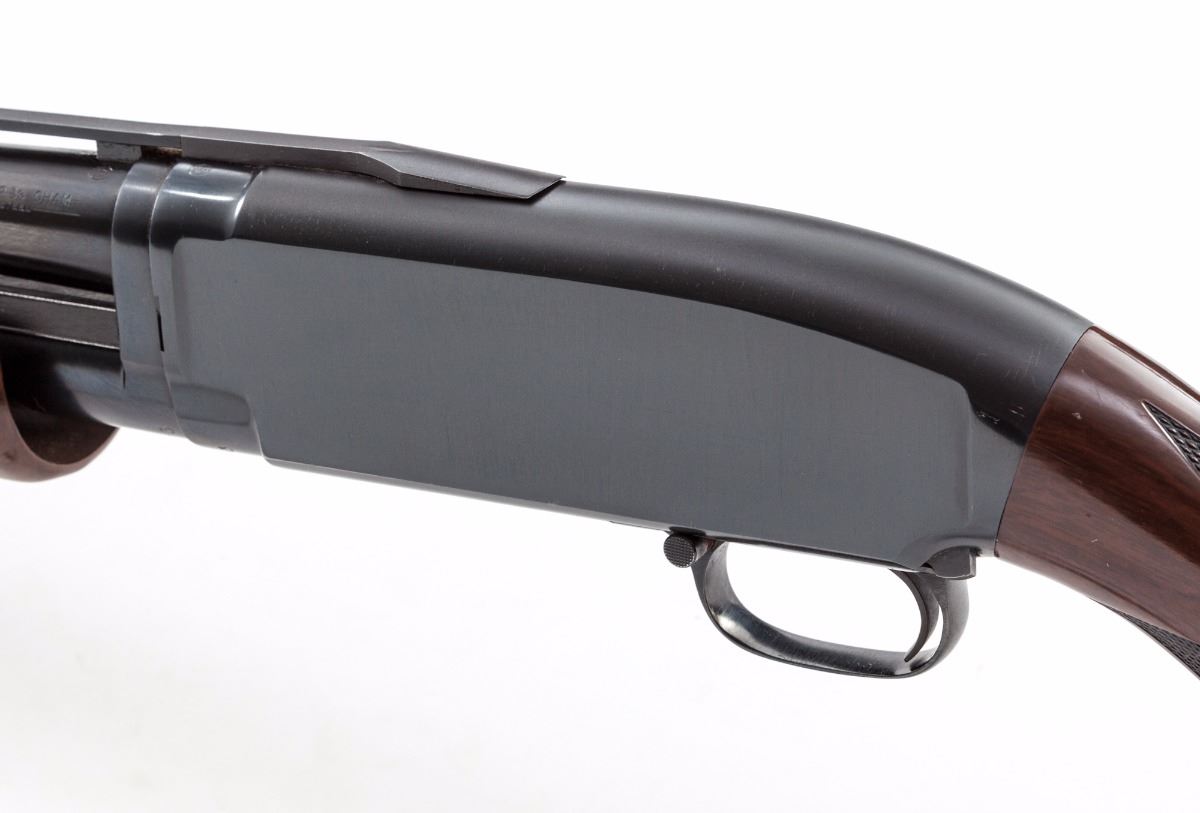 Winchester Model 12 Slide Action Skeet Shotgun, with Hydro-Coil Stock, #1968733, 12 ga., 2-3/4'' ch., 26'' barrel with matted 5/16'' ventilated rib, red Bradley style front sight and middle silver bead; WS-1 choke, triggerguard mounted push-button safety, blue finish. The checkered pistol-grip Hydro-Coil stock and handle have a walnut color and 14'' extended length of pull; weight is 7-3/4 lbs., mfg'd ca. 1964. Overall condition is excellent with the exception of the Hydro-Coil gas cylinders which are inactive. Bore is bright with old residual fouling and muzzle chafing; original blue finish remains 99% with high edgewear and faint hairline scratches that appear to be from a storage case zipper. Magazine band and rib extension have plum discoloration; bolt has cycling scuffs; stock has light handling marks. An uncommon and rarely used Model 12 that would benefit from a little TLC. Est.: $1,200-$1,800. (C&R)
