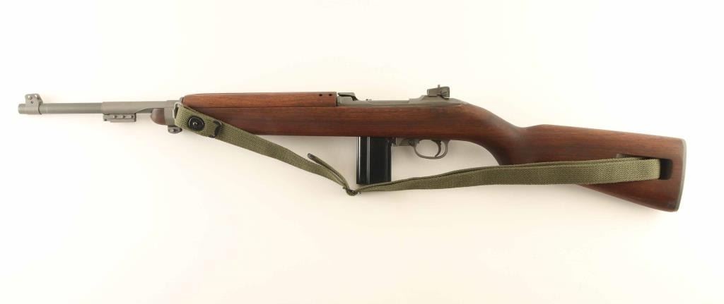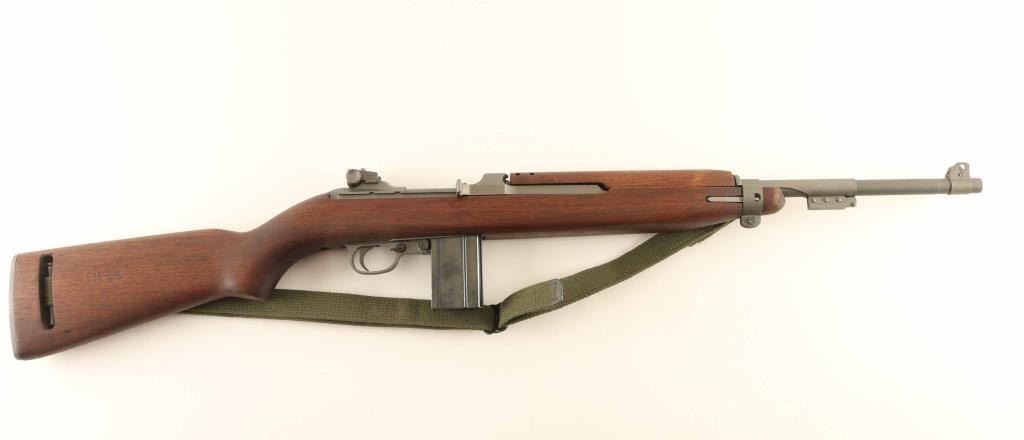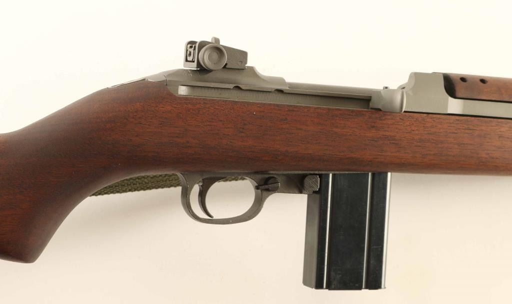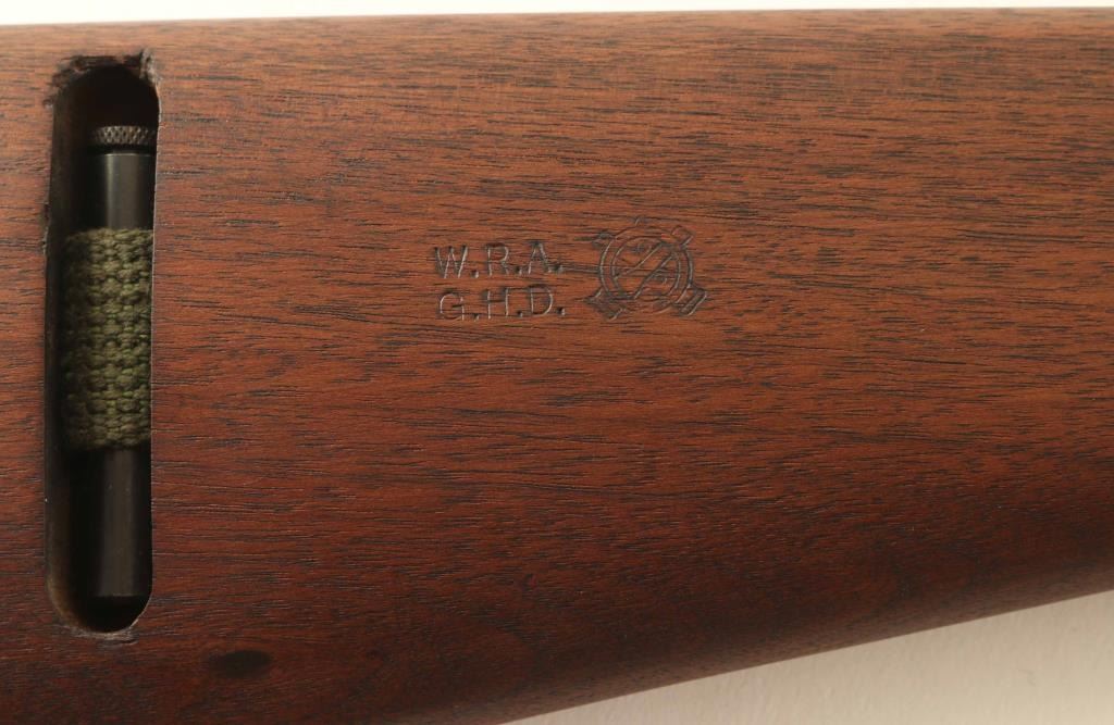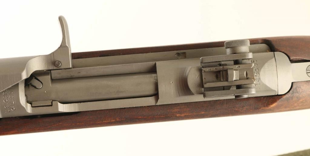 US military semiautomatic rifle. Appears arsenal reworked. Features parkerized finish, some parts blued, walnut stock & handguard, protected blade front sight, adjustable peep rear sight with sliding elevation adjustments, bayonet lug, 18" barrel, manual safety, front sling swivel, sling slot in butt, accepts detachable magazine. Bore is excellent. Retains 95% refinish, most parts parkerized a lighter silvery gray color, barrel is a bit darker color. Safety lever & magazine release are blued. Mostly late WWII part variations, such as round top bolt, M2 mag catch, flipper safety, 4 rivet handguard, M2 slot in stock. Wood is excellent condition. Markings include partial "W" on barrel, circled "P" on stock wrist, "WRA / GHD" and ordnance cannons on right butt. No importer marks observed. Includes one blued steel magazine, proper style green web sling & oil bottle. Condition is NRA Excellent - reworked *** C&R Firearm ***