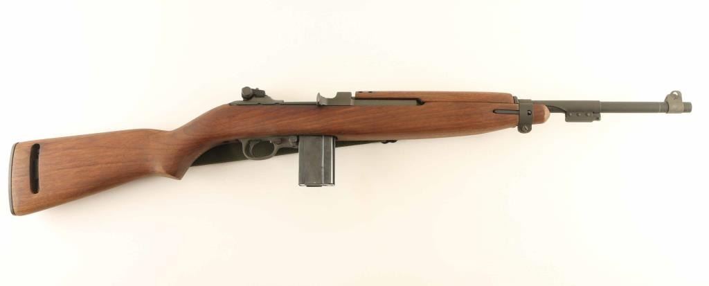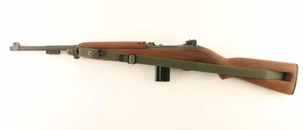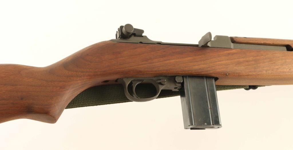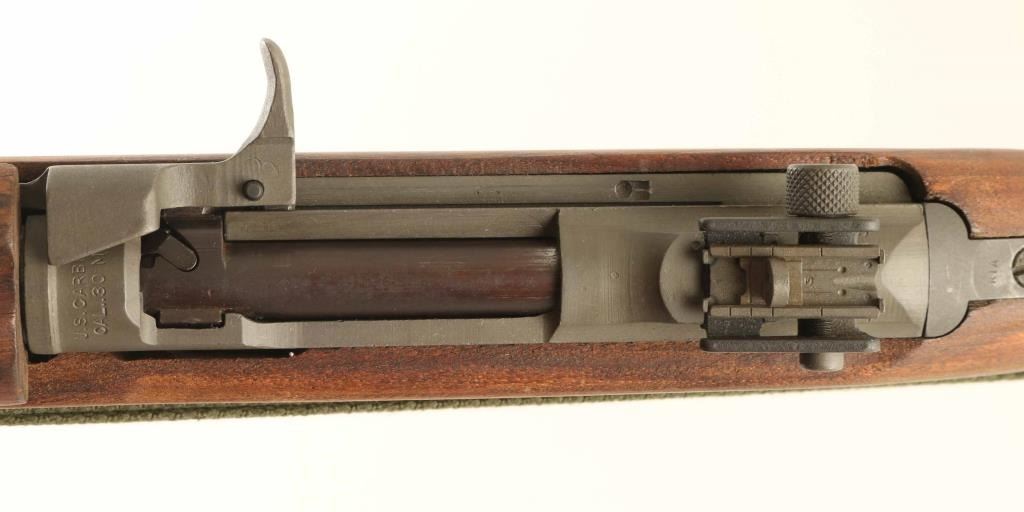 US military semiautomatic rifle. Appears arsenal reworked. Features parkerized finish, some parts blued, walnut stock & handguard, protected blade front sight, adjustable peep rear sight with sliding elevation adjustments, bayonet lug, 18" barrel, manual safety, front sling swivel, sling slot in butt, accepts detachable magazine. Bore is excellent. Retains 95% refinish, most parts parkerized, some parts have slight variation in color or shade. Bolt, safety lever, magazine release are blued. Mostly late WWII part variations, such as round top bolt, M2 mag catch, flipper safety, 4 rivet handguard, M2 slot in stock. Wood is excellent condition. Markings include "W" on barrel, "P" on stock wrist. No importer marks observed. Includes one blued steel magazine, proper style green web sling & oil bottle. Condition is NRA Excellent - reworked *** C&R Firearm ***
