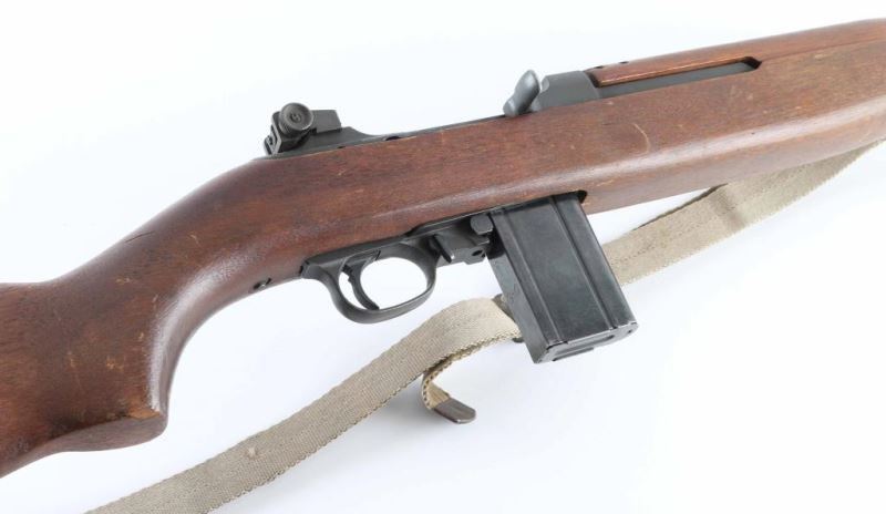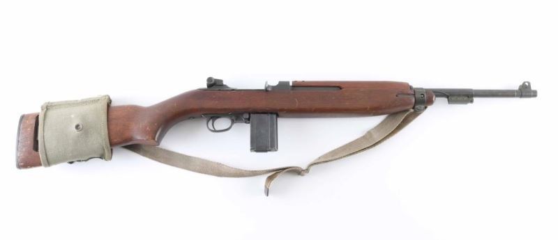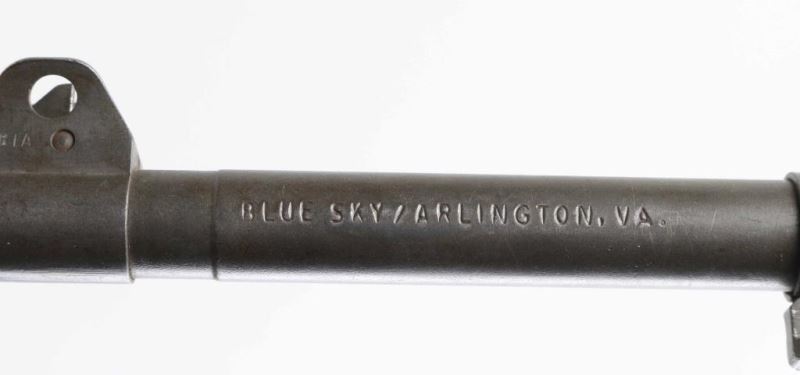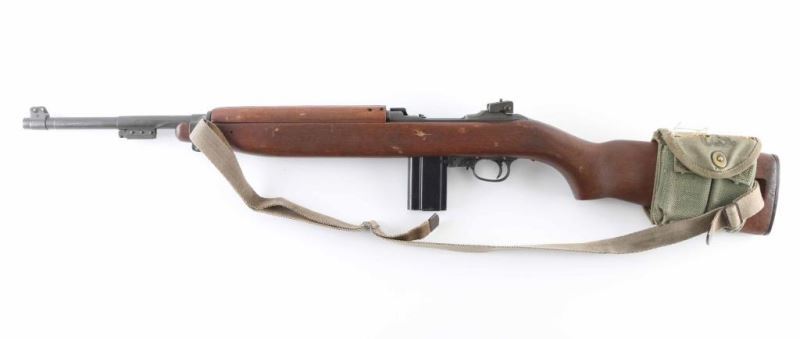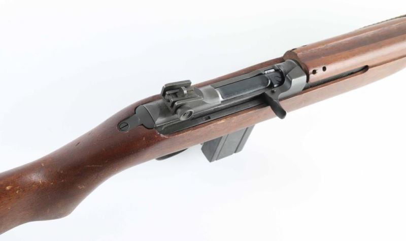 US military semiautomatic rifle (re-imported by Blue Sky, Arlington VA) manufactured circa 1944. Features parkerized finish, wood stock & handguard, protected blade front sight, peep rear sight with sliding elevator, 18" barrel, rotating "flipper" manual safety, front sling swivel, wide front band with bayonet lug, sling slot in butt, accepts detachable magazine. Flat top bolt, four rivet handguard. Bore is very good condition. Retains 90% finish, generally consistent with US military arsenal type finish, slight losses on edges and where moving parts rub. Wood is good serviceable condition, small gouges throughout, slightly rough texture. Markings include "W" on barrel. Includes one good condition blued steel magazine marked "G-Q", green nylon sling & oiler, poor condition mag pouch on butt, "TWN" marked M4 bayonet with scabbard. Condition is NRA Very Good (arsenal rebuild) *** C&R Firearm ***