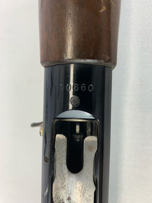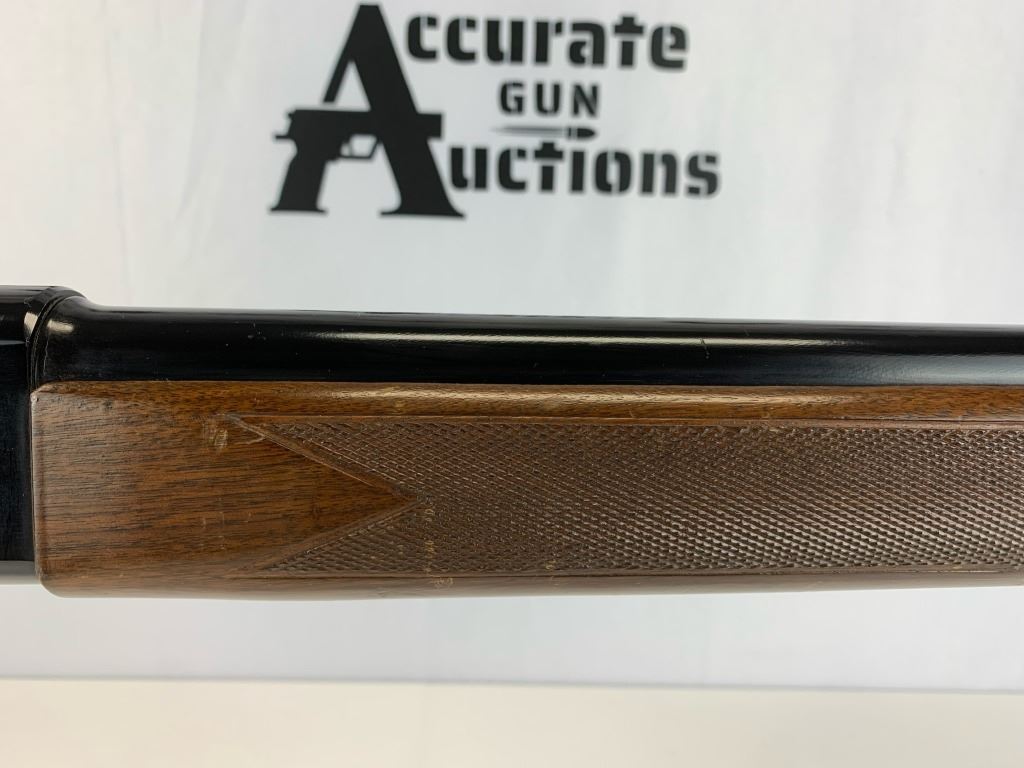With an overall length of 47.5", this shotgun comes with a bead front sight, a rubber buttplate and custom hunting scene engravings on both sides of receiver. Wooden furniture does have a couple imperfections but is