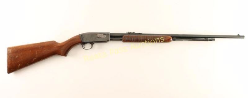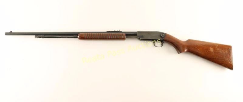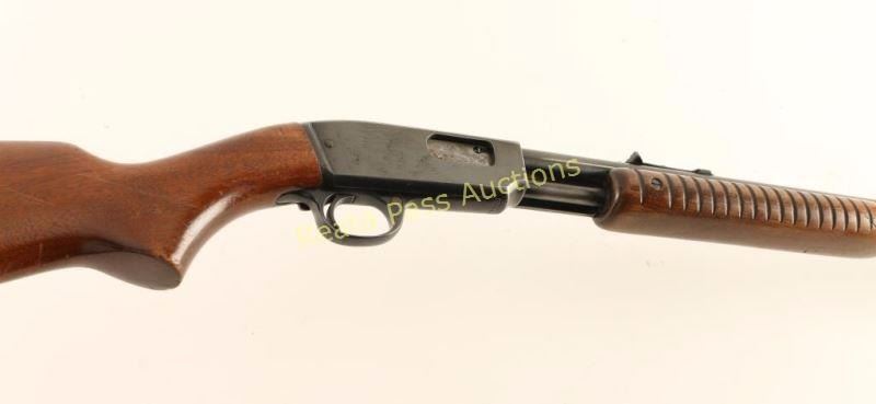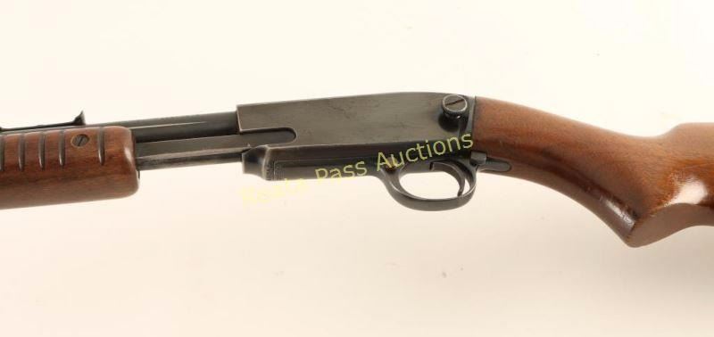 Vintage take-down slide action repeating rifle chambered in .22 Short, Long or Long Rifle, circa 1955. Features a blued finish, 24" barrel, 3/4 length tube magazine, blade front sight, adjustable rear sporting sight, push button safety, serrated trigger, take-down frame, grooved walnut slide handle and smooth pistol grip shoulder stock with checkered metal buttplate. Rifle retains approximately 80% of it's original finish showing edge wear on the receiver along with some dark scattered surface rust, slide wear on the barrel and scattered handling marks/scratches observed on the top of the receiver & on the barrel forward of the slide handle. Action is smooth, bore is pristine, and wood stocks are good+ with numerous dings & some gouges on the buttstock. Condition is good++. ***C&R Firearm*** ***Modern Firearm***