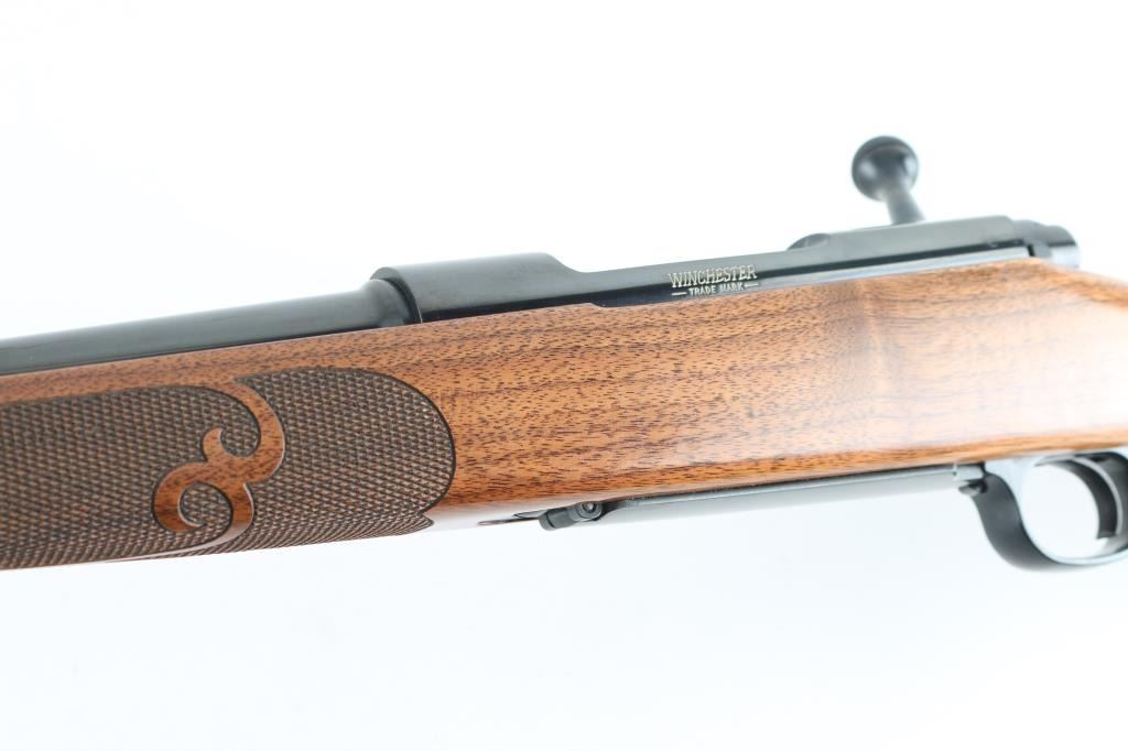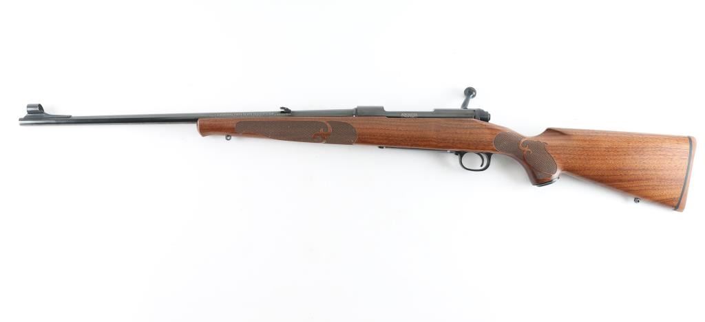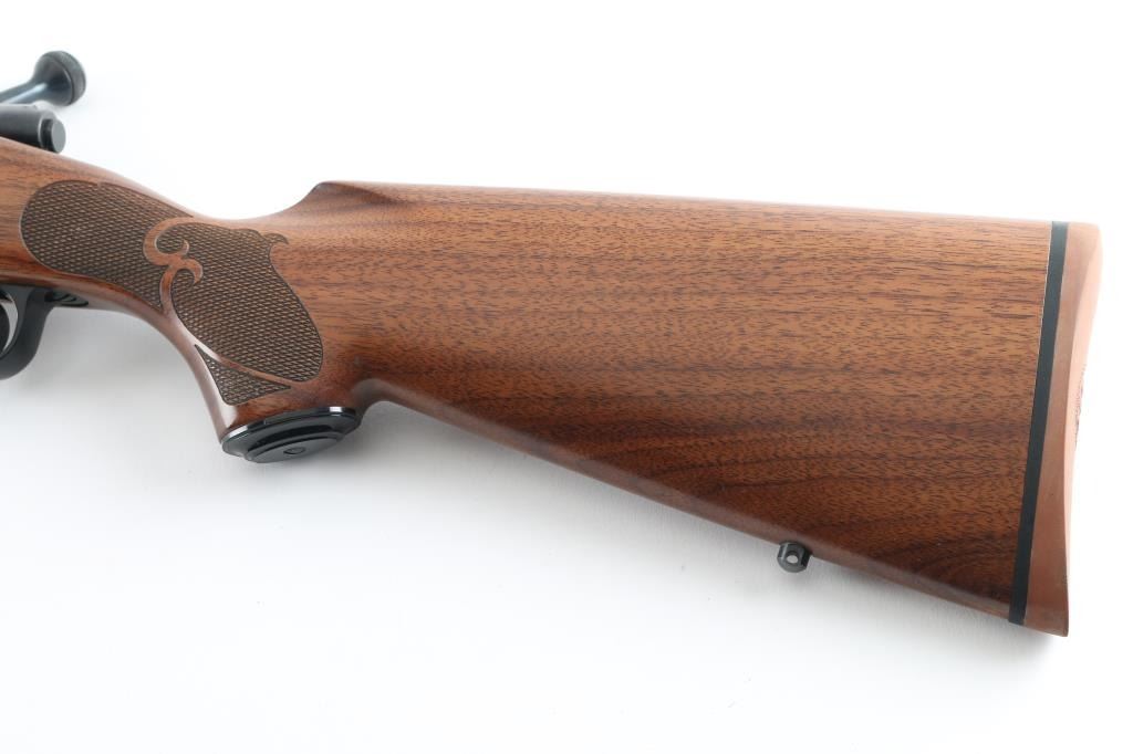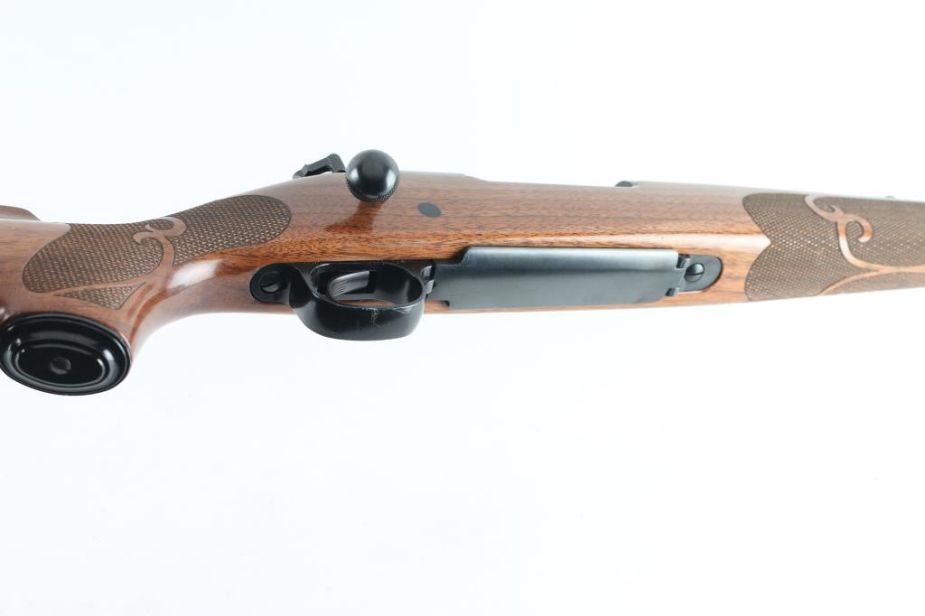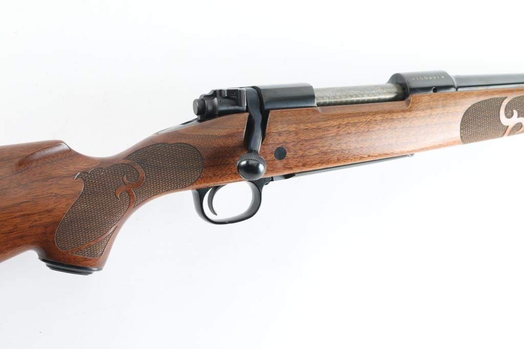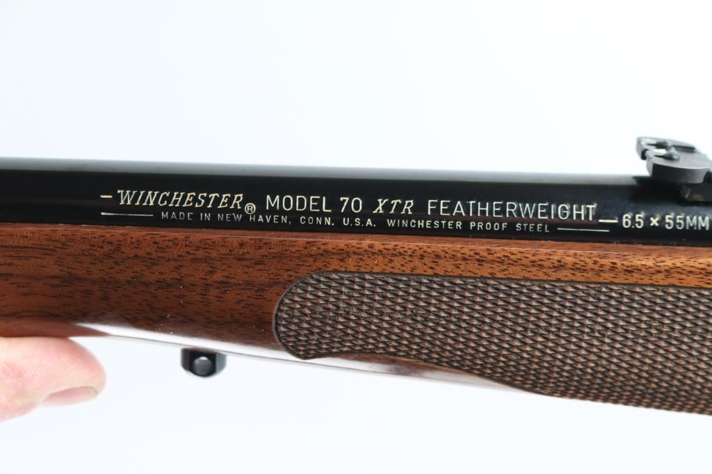 'Featherweight', chambered in 6.5x55mm Swedish. Manufactured in 1986 for one year only. Bolt action rifle features blued finish, wood stock with semi-pistol grip, schnabel forend , factory rubber recoil pad, checkered panels at wrist & forend, black grip cap. 22" barrel, hooded post/bead front sight, folding white triangle rear sight, push feed type jeweled bolt, three position manual safety, hinged floorplate, sling studs. Receiver drilled & tapped for scope mounting and for receiver sight, holes are empty with no plugs. Bore is very good condition. Retains 99% bluing with a couple of very minor scratches. Stock is near excellent with a few very minor dents. Condition is NRA Excellent. Modern Firearm.