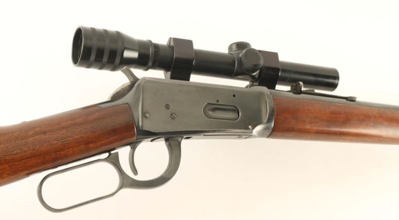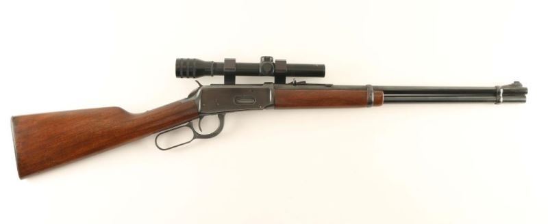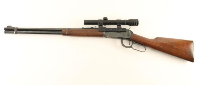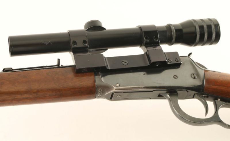 Vintage lever action repeating rifle chambered in .30-30 Winchester, circa 1960. Features a blued finish, 20" tapered barrel, full-length tube magazine, ramped blade front sight. adjustable rear sporting sight, side mounted scope base with a L.M. Dickson 2.5x 20mm scope, two barrel bands, smooth trigger, serrated hammer spur, smooth walnut forend and straight grip shoulder stock with knurled metal buttplate. Rifle exhibits approximately 80% of it's original finish showing edge wear, scattered handling marks/scratches and some oxidation. Action is crisp, bore is excellent and wood stocks are good+ with wear & a small loss on the forend forward of the barrel band. Condition is NRA good++. ***C&R Firearm***