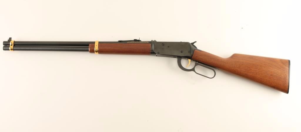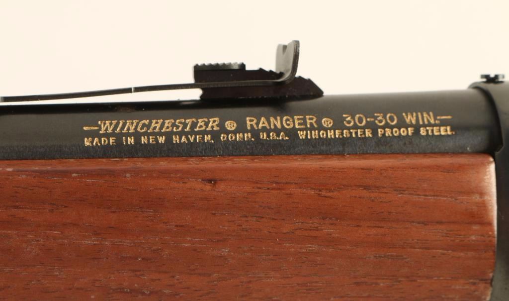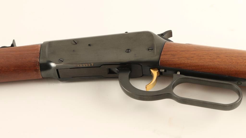Lever action repeating rifle chambered in .30-30 Winchester, circa 1988. Features a blued finish, 20" barrel, blade front sight, adjustable rear sporting sight, full length tube magazine, gold trigger, checkered hammer extension, drilled & tapped receiver, grip safety, gold barrel bands, satin finished smooth walnut forend and straight grip shoulder stock with factory checkered black hard rubber buttplate. Rifle retains approximately 95% of it's original blued finish showing little wear, scattered light oxidation on the receiver and light scattered surface rust emerging on the magazine tube & on the barrel around the rear sight. Action is smooth, bore is pristine, and wood stocks are near fine with light finish loss on the forend, a small repair on the left side of the tang & few blemishes. Condition is very good++. ***Modern Firearm***