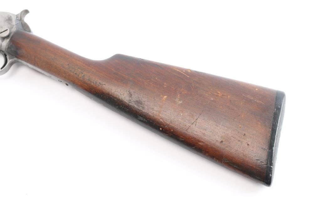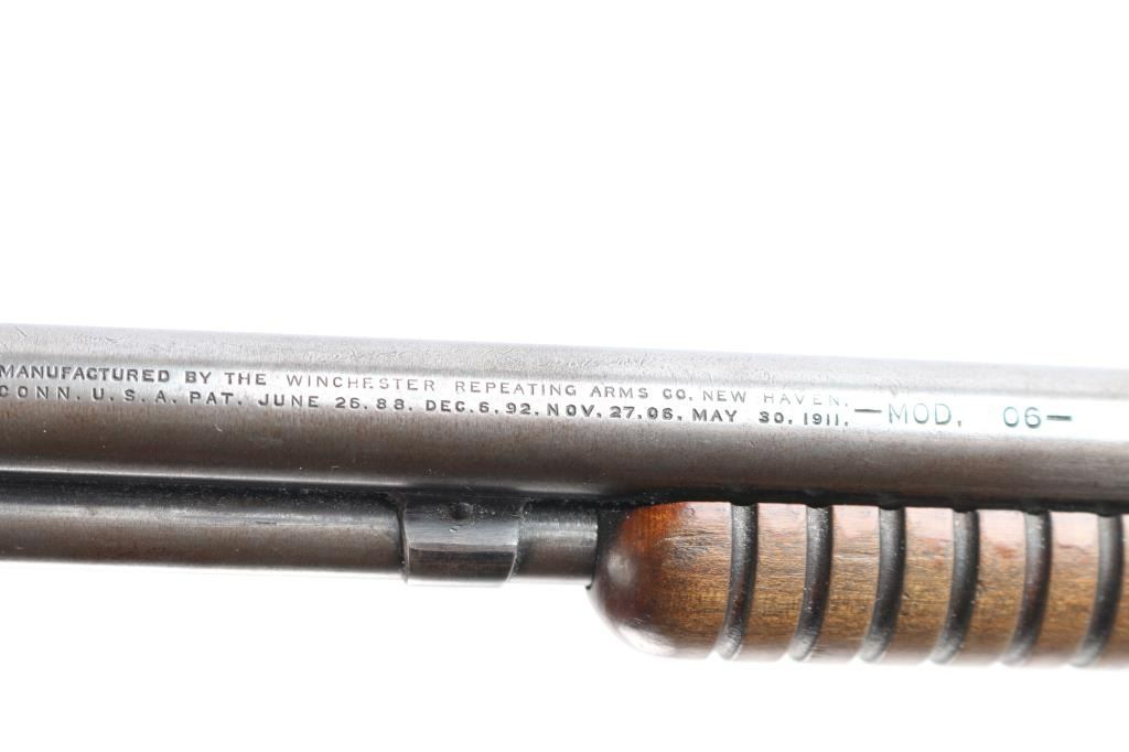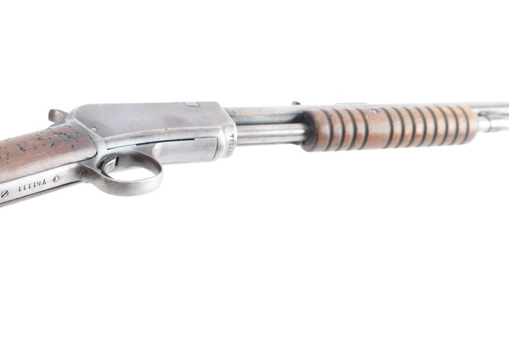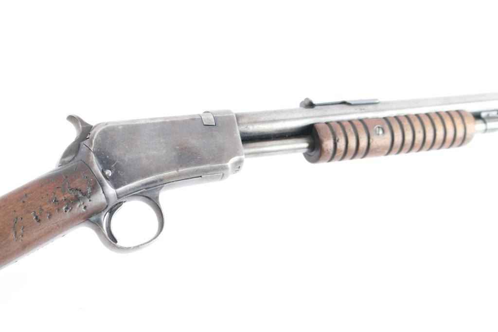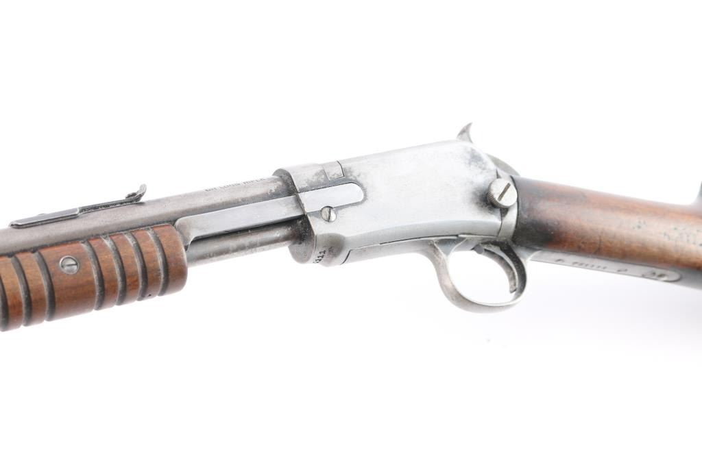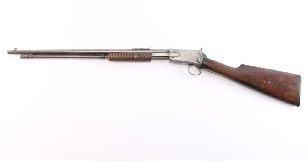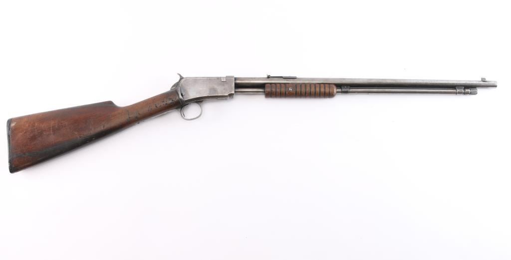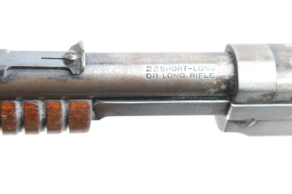 Vintage pump action rimfire rifle manufactured circa 1932. Features blued finish, grooved wood pump handle, wood butt with straight grip area, factory composition buttplate, 20" round barrel, blade front sight, adjustable rear sight, magazine tube under barrel, external hammer, take down screw in receiver. Bore is very good/bright. Blue is about 10% with many scratches & handling wear, the left side of receiver has been cleaned. Wood is sound, dented & scratched the right side of the grip has many small dents. Stock is a bit loose. Lower tang serial number matches receiver. Markings clear/readable.