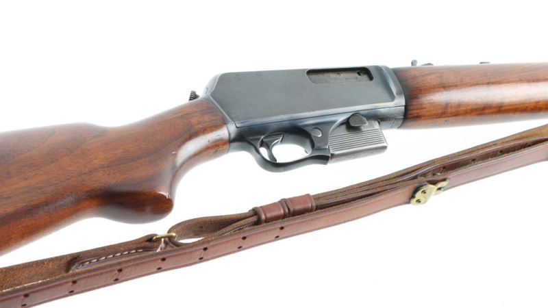 Rifle. Semi-Automatic. 5/10 rd capacity. Take-down. Manufactured 1905-1920. Blowback action, fed from detachable box magazine. Charged by plunger in the forearm. 20" round barrel with post/bead/ U-notch sights. Take-down knob is located on the tang. Standard Winchester stampings on barrel, and tang. Barrel/receiver Winchester proofed. Triggerguard mounted safety. There are 2 screw holes on the tang for peep sight. Steel checkered buttplate. Charging action is smooth. Blued finish is about 80% with edge wear, scratches, and handling loss. Nothing serious. Wood is excellent. Bore is ok with rifling, but has some slight pitting. Comes with one 10-rd magazine. M1907 style brown leather sling attached. NRA condition-Good. C&R Firearm.