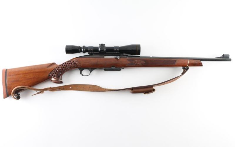 Semiautomatic carbine manufactured in 1967. Features blued finish, wood stock with curved grip, basket weave panels at wrist & forend, rubber recoil pad, 19" barrel, hooded blade front sight, empty dovetail mid-barrel, detachable box magazine, manual safety, sling swivels, Weaver type rail & rings attached to top of receiver. Bore is very good condition. Retains 90% blue, with edge losses. Wood is very good condition with handling marks. Recoil pad is poor fit. Mounts a very good condition Leupold Vari-X IIc 3-9x scope. Includes leather sling, (1) magazine. Condition is NRA Very Good++ *** C&R Firearm ***