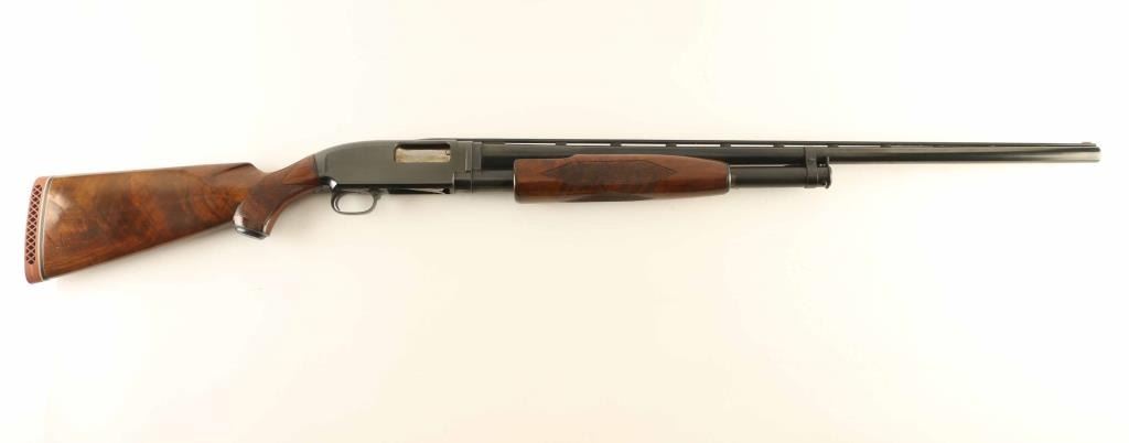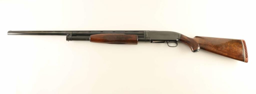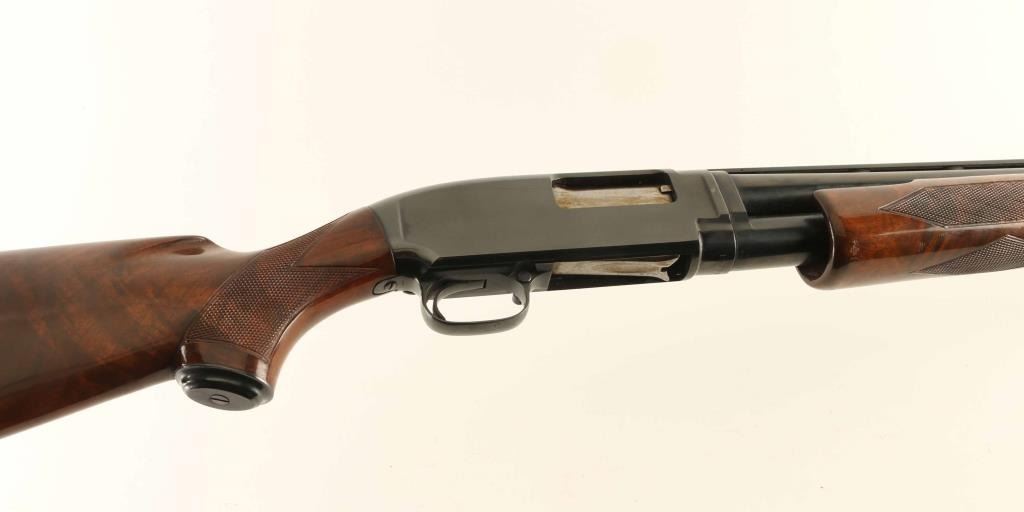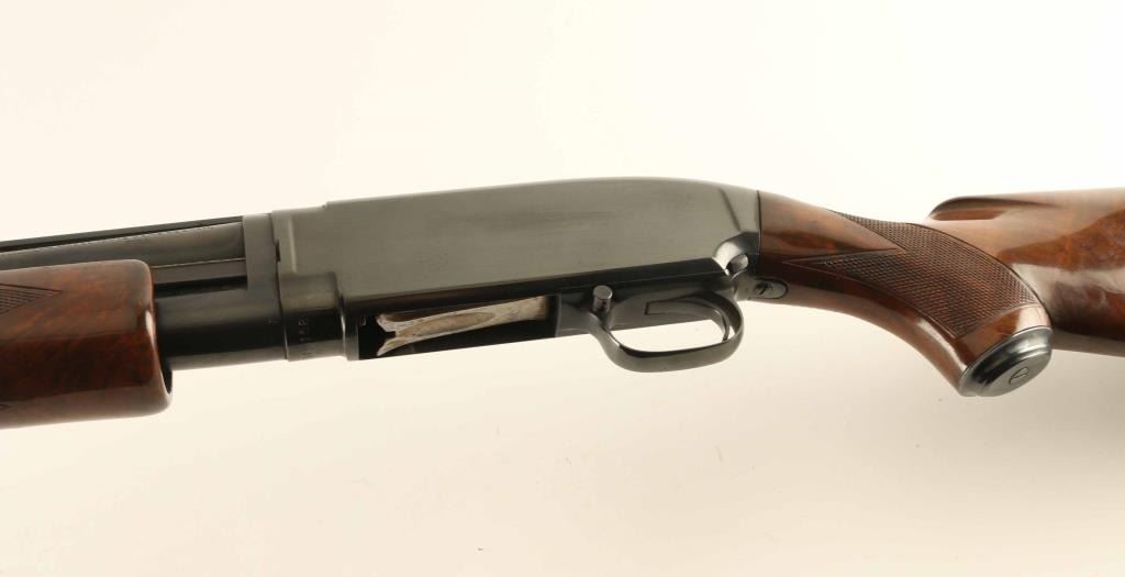 Pump action shotgun features 30" vent rib barrel, choke measures "IM", accepts 2-3/4" shells, Bradley style front bead with red color plastic insert, blued finish, checkered fancy figured deluxe wood stock & pump handle, ventilated rubber recoil pad, manual safety. Bore is very good condition. Retains 90% blue, with bare metal on mag tube, signs of handling and use. Wood is excellent condition with few scratches. Recoil pad is fair condition, slightly hard. Condition is NRA Very Good++ *** C&R Firearm ***