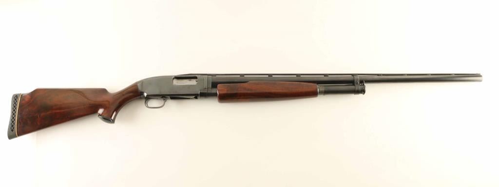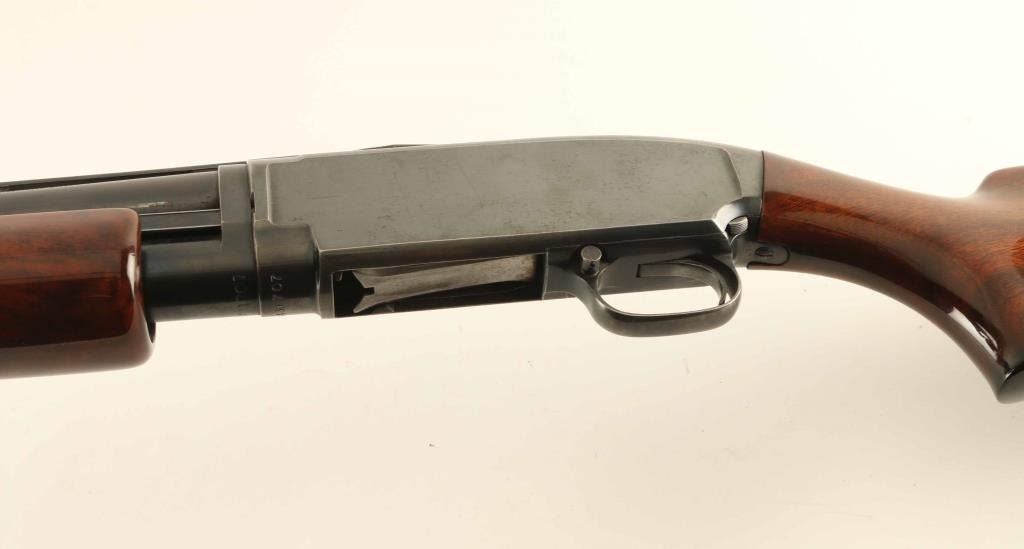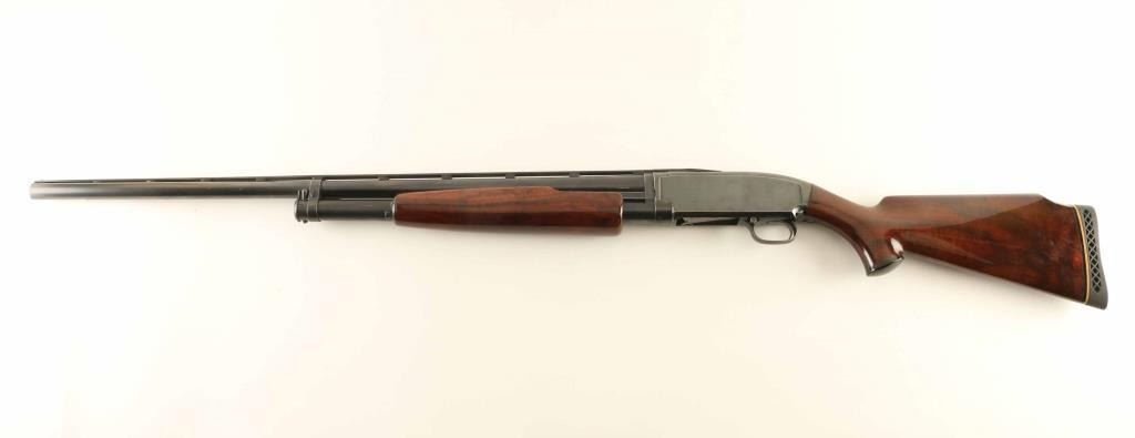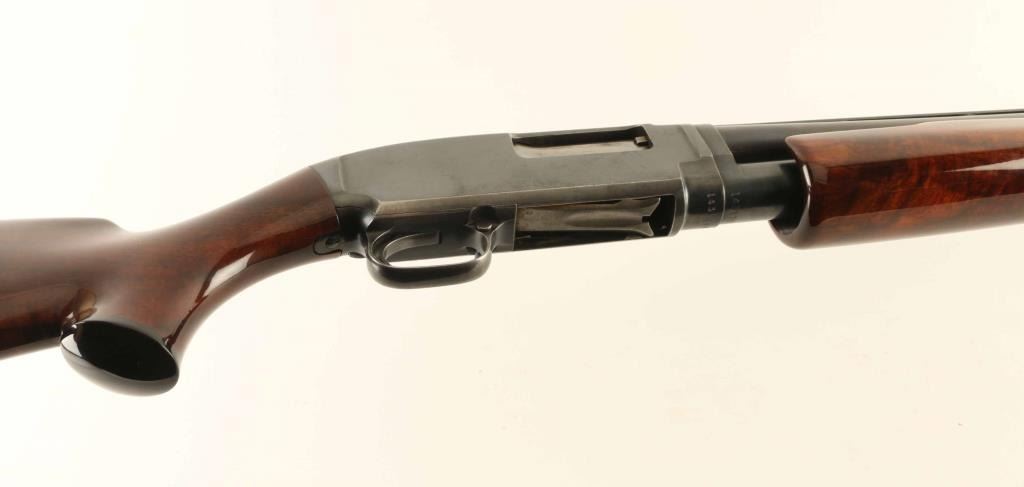 Pump action shotgun features 30" vent rib barrel, labeled "FULL" choke, choke measures "IM", accepts 2-3/4" shells, steel front and mid beads, blued finish, aftermarket fancy figured high gloss wood stock & pump handle, black plastic grip cap, ventilated rubber recoil pad, manual safety. Bore is very good condition. Retains 80% blue, with bare metal on sharp edges, high spots, and on mag tube, signs of handling and use. Wood is excellent condition with few scratches. Recoil pad is good. Condition is NRA Very Good *** C&R Firearm ***
