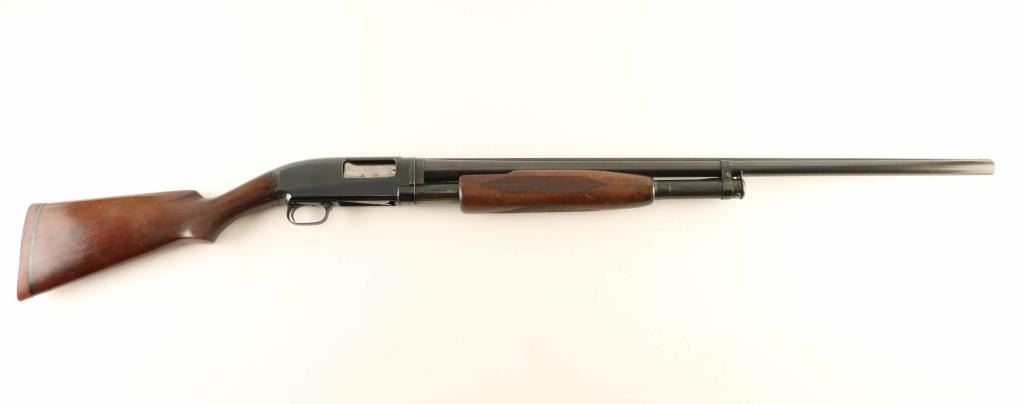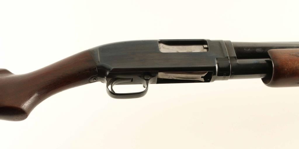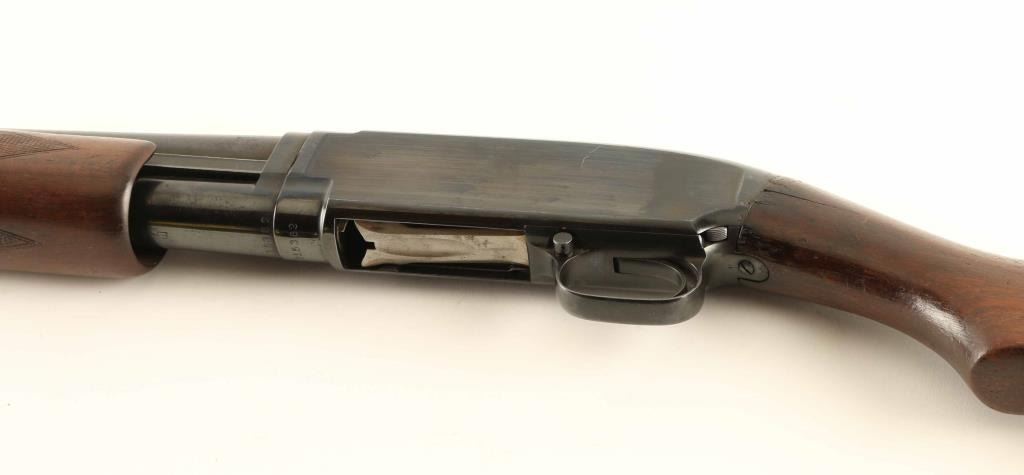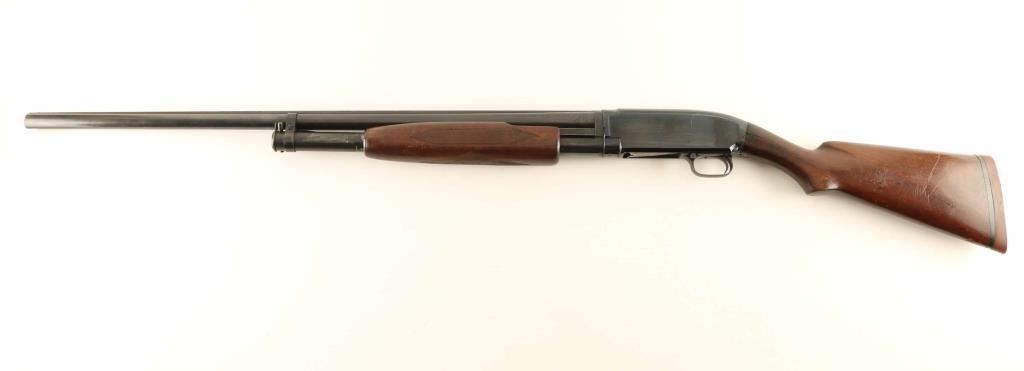 Vintage slide action repeating shotgun chambered for 2 3/4" 12 Gauge shells, manufactured in New Haven, CT circa 1940. Features a blued finish, take-down 30" full choked barrel with solid sighting rib, silver bead front sight, silver bead center sight, 2/3 length magazine tube, smooth trigger, concealed hammer, push button safety, steel receiver, walnut slide handle with point checkering, and smooth semi-pistol grip shoulder stock with factory recoil pad & 14" LOP. Serial numbers match on the receiver and receiver extension. Shotgun retains approximately 80% of its original blued finish (receiver appears as possibly re-blued) showing thinning, slide wear on the magazine tube & action bar, scratches to receiver sides, and scattered oxidation/pitting. Action is sound, the bore is pristine, and the wood stocks are near good with finish loss, wear, multiple scratches, & a 1.5” crack on the left side of the wrist. Condition in NRA Good. ***C&R Firearm***