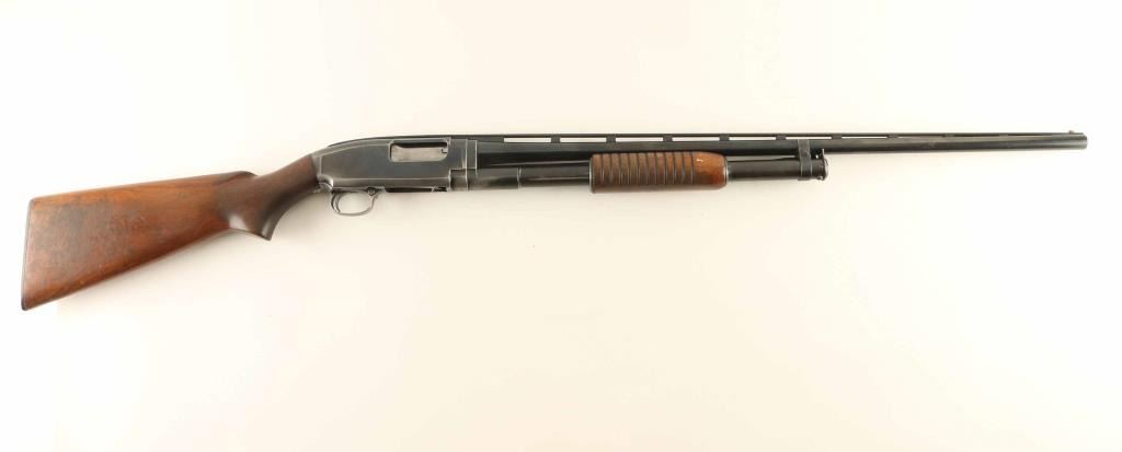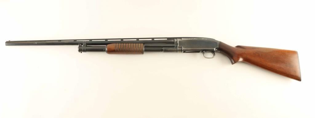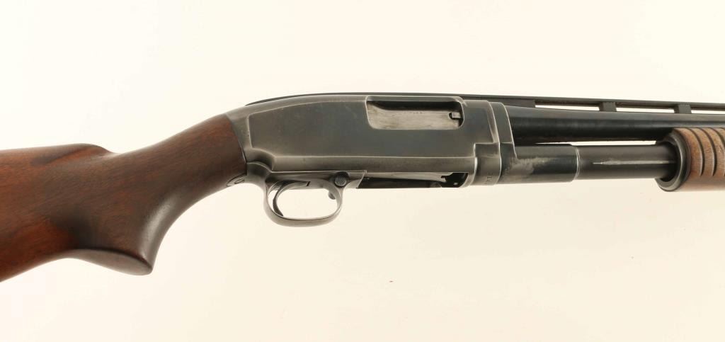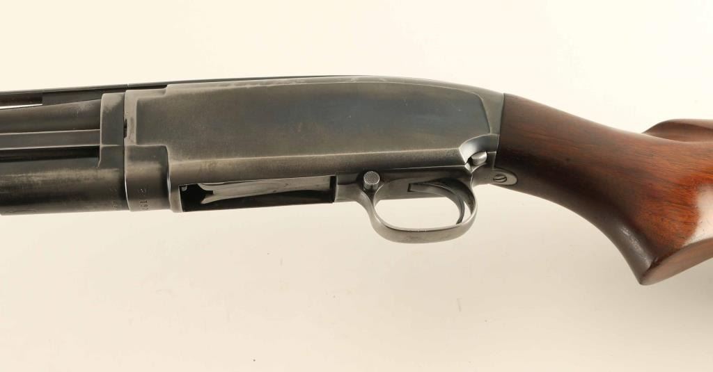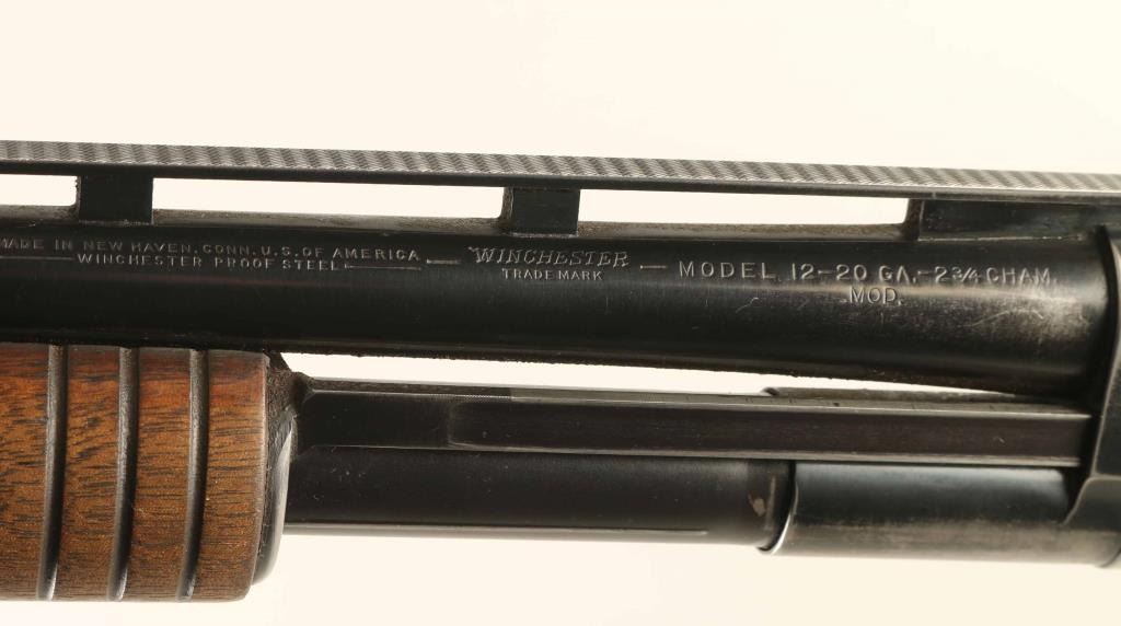 Pump action shotgun features 28" vent rib barrel, labeled "MOD", choke measures "IC" using a hand gauge, accepts 2-3/4" shells, Bradley style front bead with red color plastic insert, white polymer mid bead, blued finish, wood stock & pump handle, plastic buttplate, manual safety. Bore is very good condition. Retains 65% blue, with bare metal on mag tube, sharp edges, high spots, left side of receiver. Wood is good condition, serviceable, with scratches, dents, loss of finish and dryness. Condition is NRA Good+ *** C&R Firearm ***