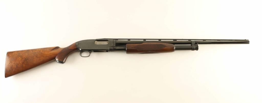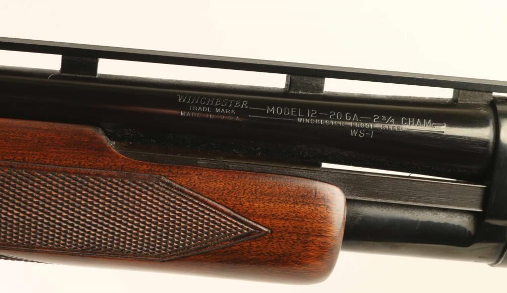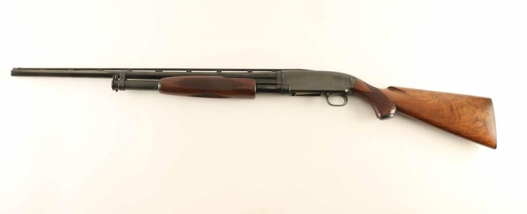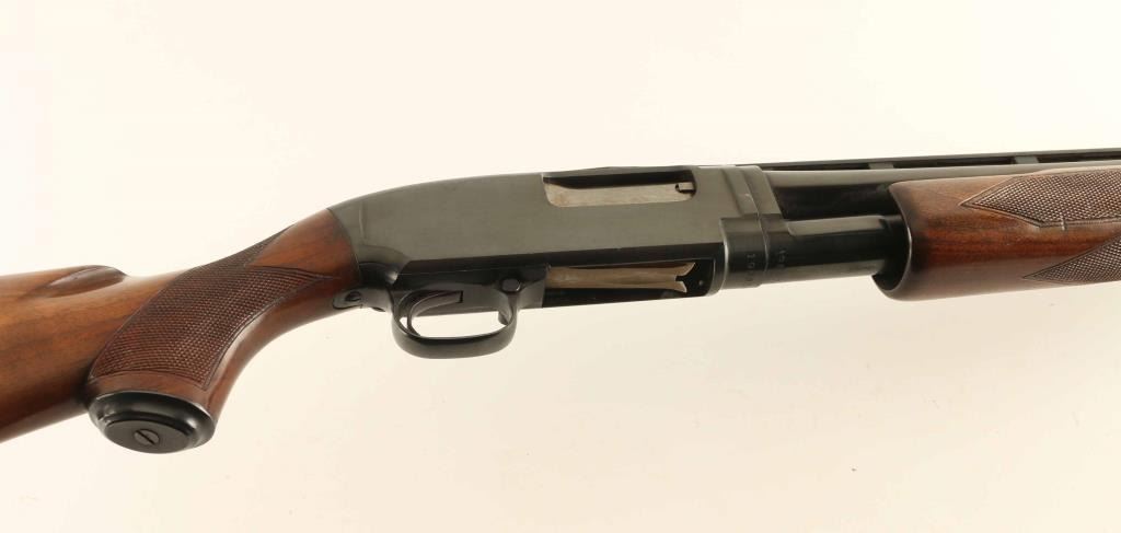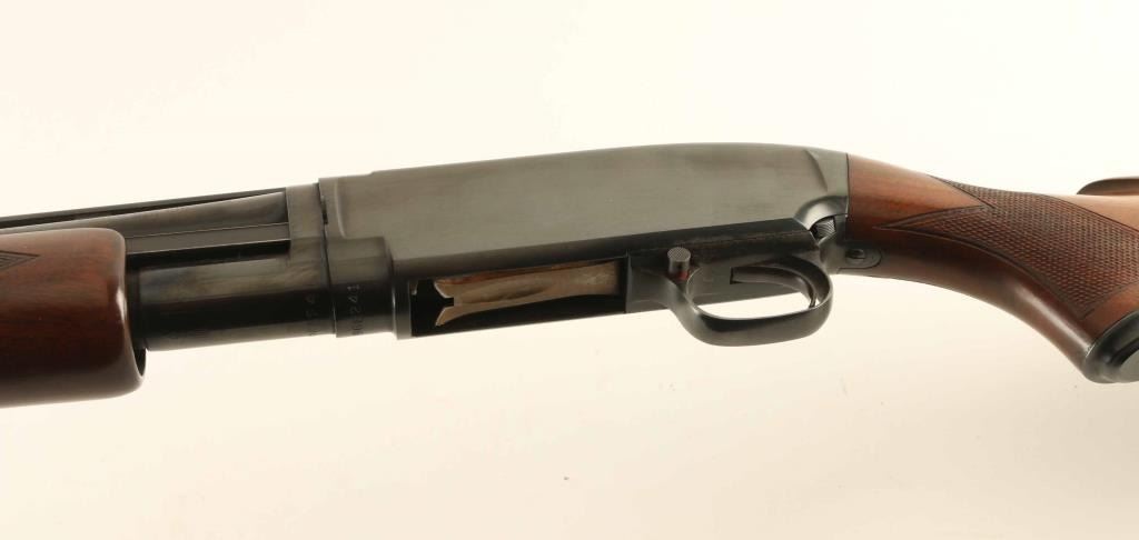 Pump action shotgun features 25.5" vent rib barrel, barrel labeled "WS-1", measures "CYL" with choke gauge, takes 2-3/4" shells, Bradley front bead with red plastic insert, brass mid bead, blued finish, checkered fancy figured deluxe wood stock & pump handle, plastic buttplate, manual safety. Bore is excellent condition. Retains 90% re-blue with signs of handling and use, rub marks on mag tube, scratches on top of receiver. Wood is close to excellent with signs of handling, some scratches. Condition is NRA Very Good+ (as restored) *** C&R Firearm ***