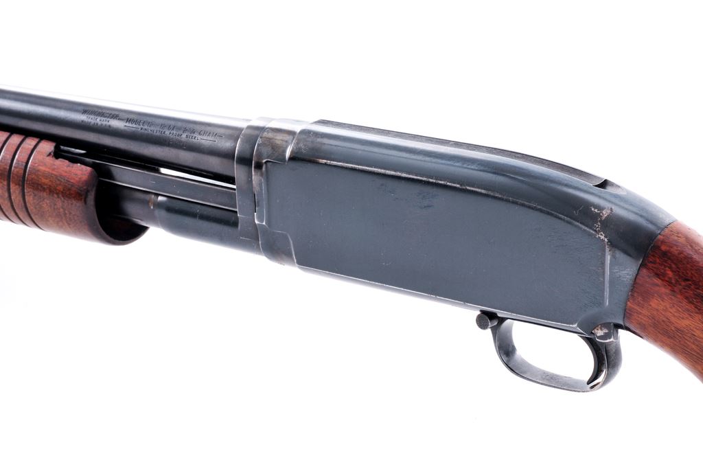 Winchester Model 12 Field Grade Slide-Action Shotgun, #1588488, 12 ga. 26'' plain barrel has 2-3/4'' chamber and is choked IC. Wood is Standard Grade walnut for the grooved forend and pistol-grip buttstock, which has no grip cap or checkering but does have a Winchester buttplate. Mfg' 1956. Condition is very good, with numerous small handling marks to buttstock and moderate edgewear to receiver. Action shows little use and could use a cleaning, but locks up tight; bore is bright. Est.: $450-$550. (C&R)