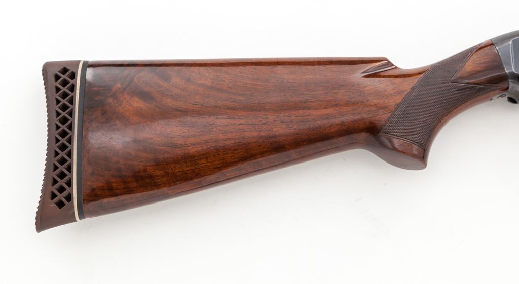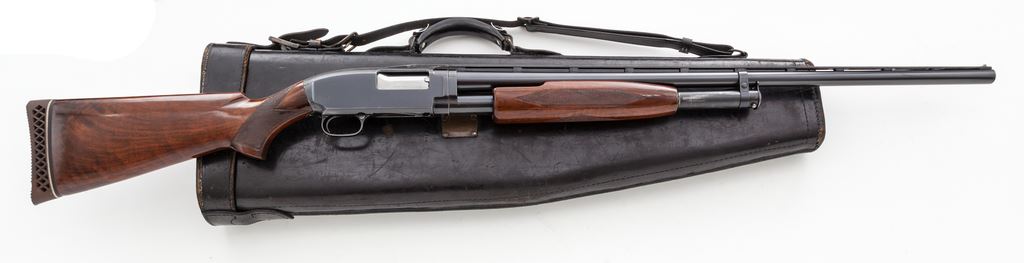 Winchester Model 12 Slide-Action Trap Gun, #852899. 12 ga. 30'' vent rib barrel is marked ''Model-12-Trap''; has target beads and a ''duck bill'' rib extension that protrudes 3.5'' onto the receiver top; 2-3/4'' chamber, and Full choked (appears opened to IM). The full forend and pistol-grip buttstock are of nice American walnut, with correct Winchester checkering, no grip cap, and Pachmayr Whiteline Trap recoil pad. Dimensions are 14-3/8''x1-1/4''x1-3/4''. Housed in a very good leg-o-mutton case. Mfg'd 1940. Condition is excellent and very original, with only a few handling marks to high-gloss wood, some edgewear to receiver, and a small repaired mark to the rib at 14'' from the muzzle. Action is quite smooth and functions correctly; bore is bright. Overall a very nice original Model 12 Trap gun. Est.: $800-$1,200. (C&R)