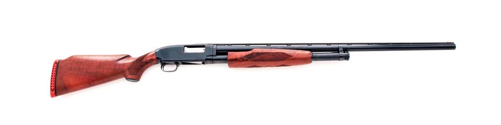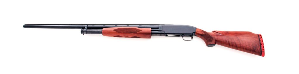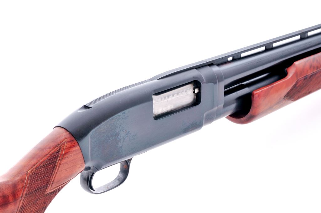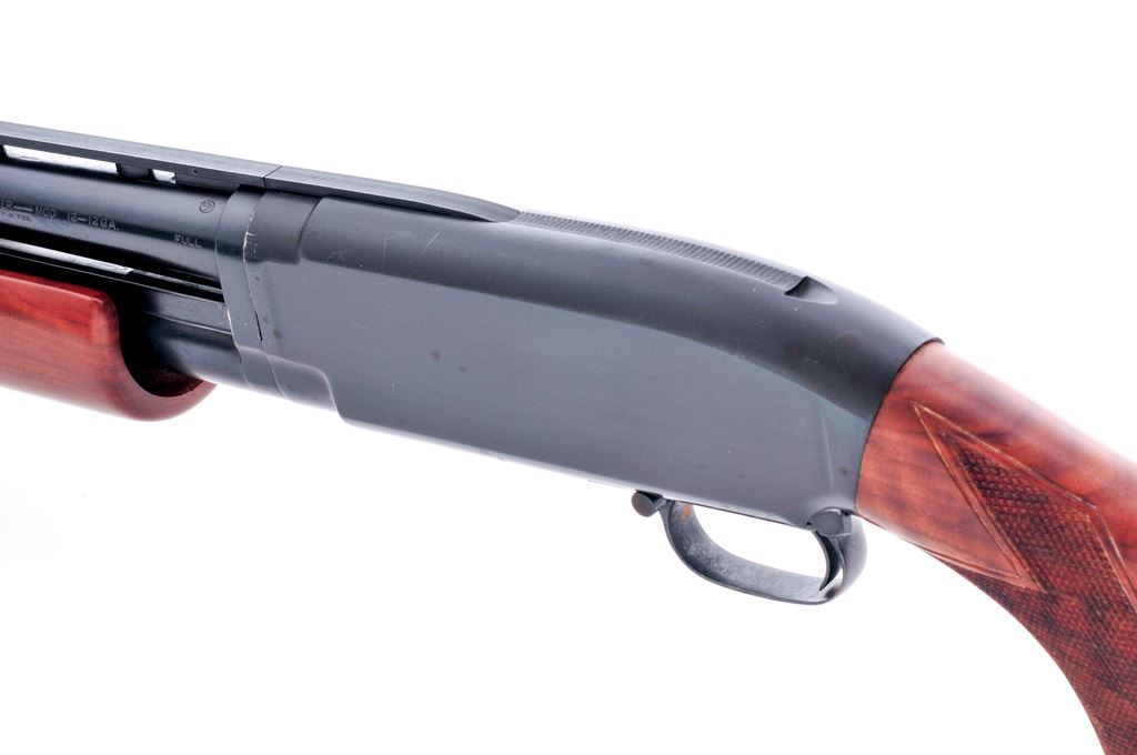 Winchester Model 12 Slide-Action Trap Shotgun, #294631. 12 ga. 30'' vent rib barrel has 2-1/2'' chamber and is choked Full. Barrel is marked ''Nickel Steel'', rib is marked ''Simons Gun Specialties, Inc., Olathe, Kansas'', and extends 3'' onto top of receiver. Loading lever and bolt are engine turned. Target forend and pistol-grip Monte Carlo buttstock are standard straight-grade walnut, with Winchester grip cap and butt pad. Mfg'd 1922. Condition is very good as restocked and probably reblued. Some freckling to finish, but action locks tight and functions correctly. Bore is bright. Est.: $350-$450. (C&R)