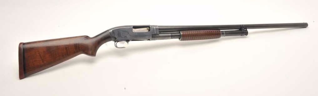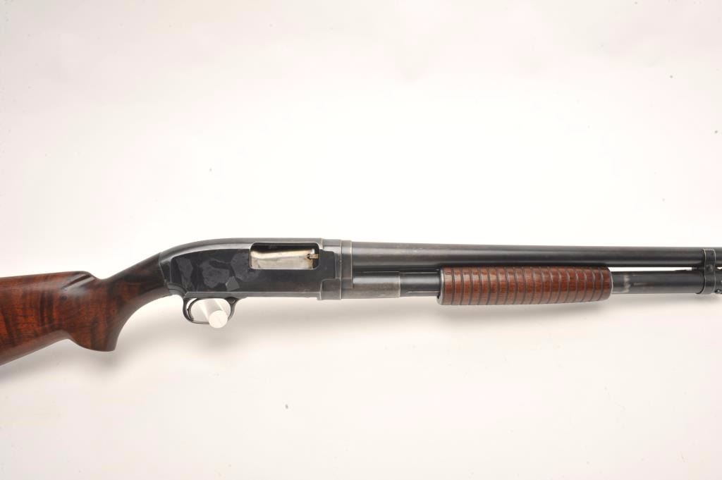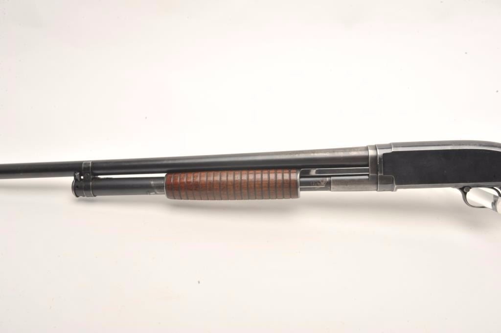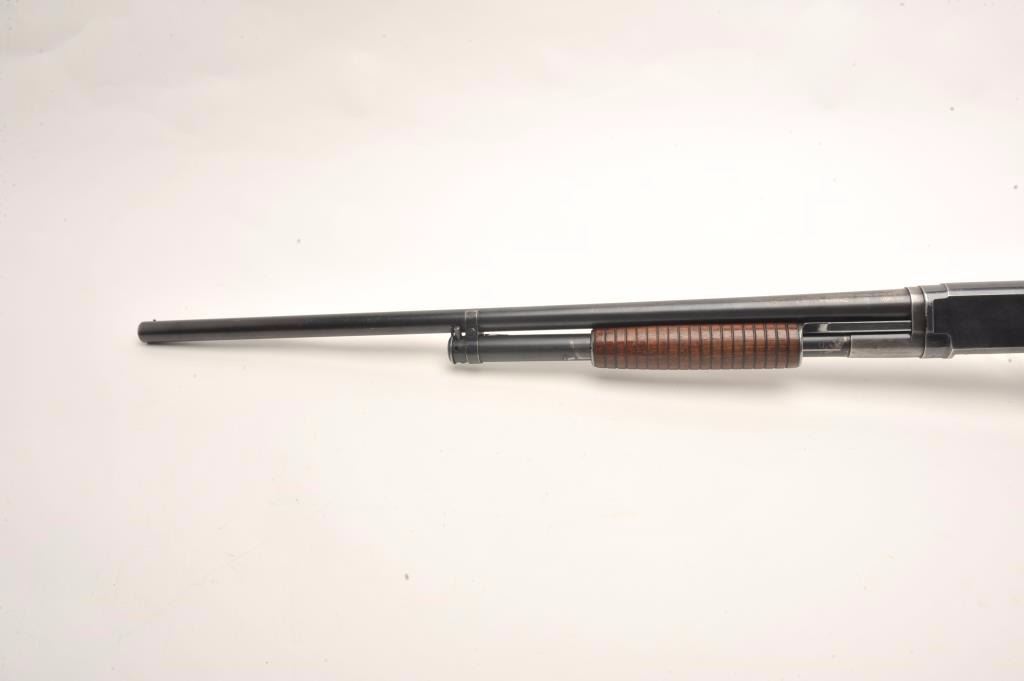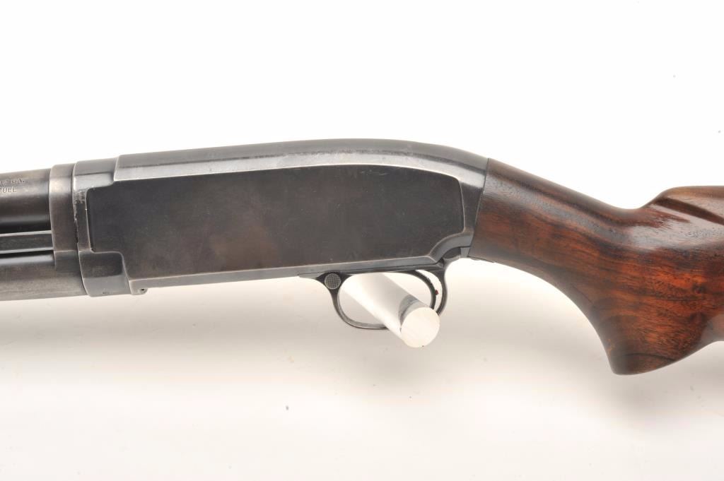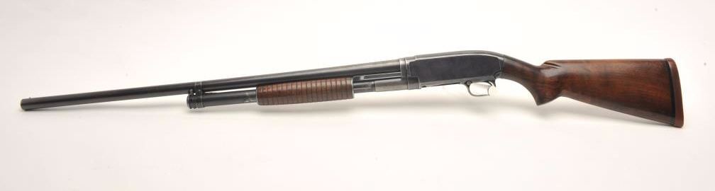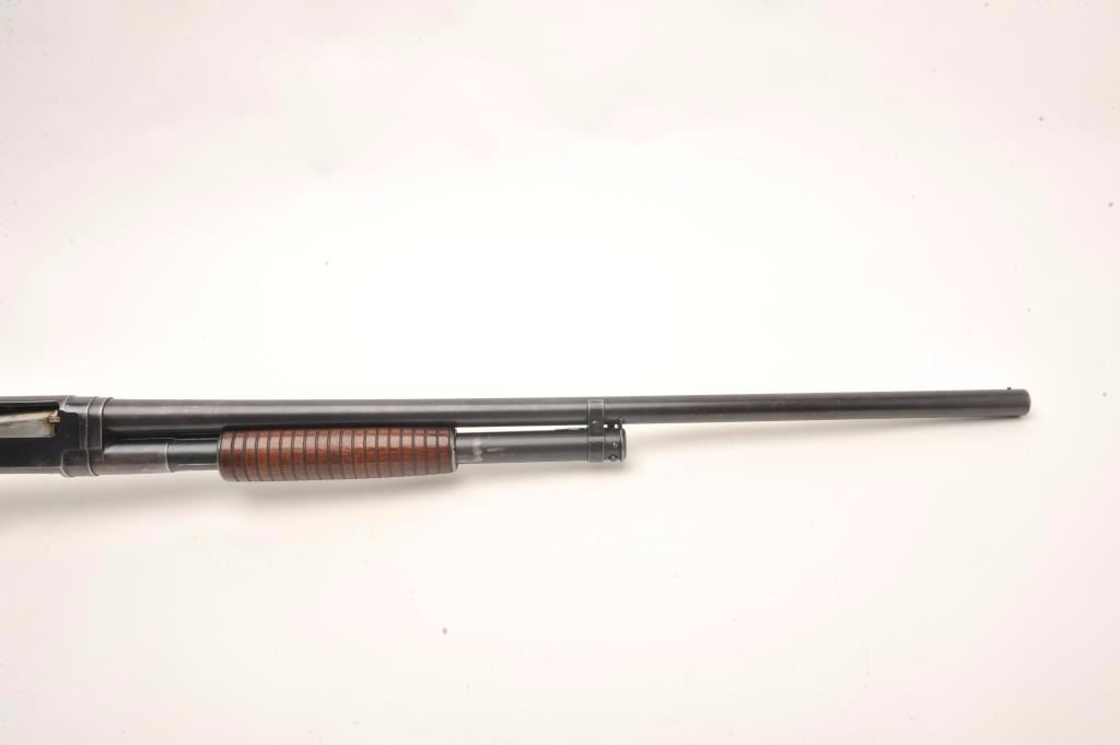 Winchester Model 12 pump action takedown shotgun, 12 gauge, 30” barrel, blued finish, wood stocks,