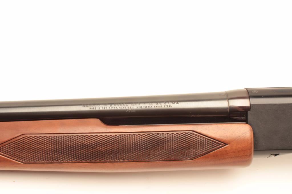 Winchester Model 1200 pump action shotgun, 12 gauge, 30” barrel, blued finish, checkered wood stock, S/N L949755, in overall very good to fine condition with majority of original finish remaining, fine bore, crisp action,sharp markings, very good + wood. (Modern). Est.: $150-$300.