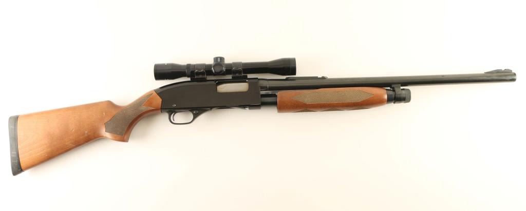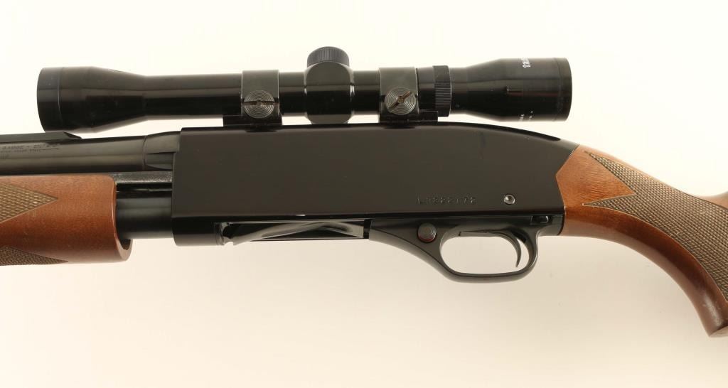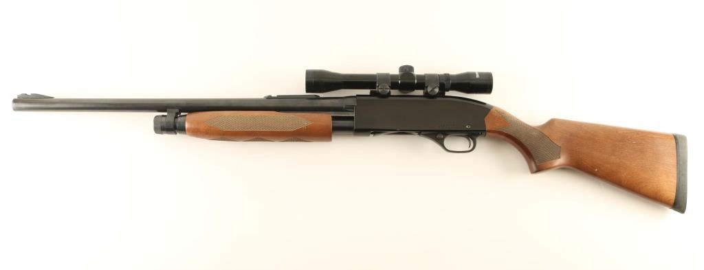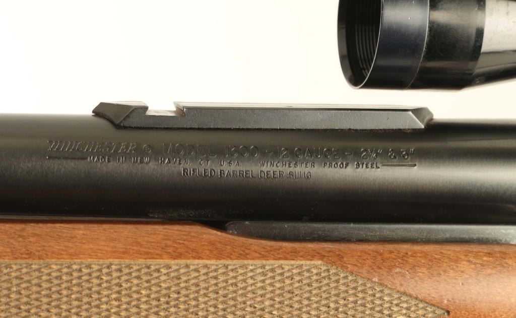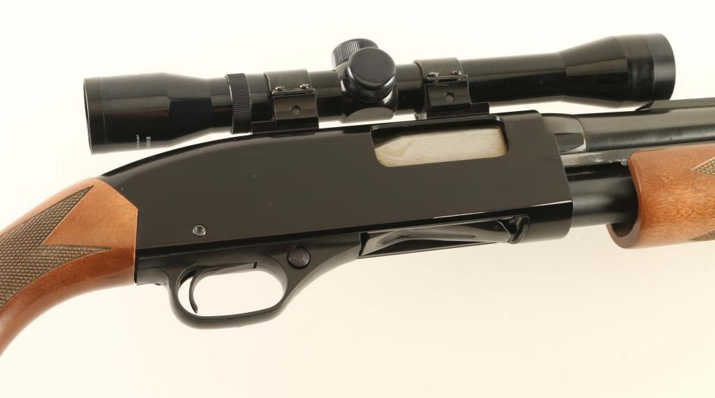 ‘Rifled Slug Gun’ Slide action repeating shotgun chambered for 2 3/4" & 3" 12 gauge shells, manufactured in New Haven, CT circa 1992-2006. Features a blued & black finish, 22" rifled barrel, 4 round tube magazine, installed sight bases with removed sights, Tasco 4x 32mm fixed power scope mounted on a two-piece scope rail, textured trigger, black polymer triggerguard, cross-bolt safety, dual action bars, alloy receiver, checkered wood slide handle and semi-pistol grip shoulder stock with factory recoil pad & 14" LOP. Shotgun retains approximately 90% of its original finish showing some scattered handling marks, slide wear on the magazine tube & action bars and thinning on the barrel. Action is smooth, bore is very good, the optics are clear with fine crosshair reticle and the wood stocks are very good with some blemishes. Condition is Very Good. ***Modern Firearm***