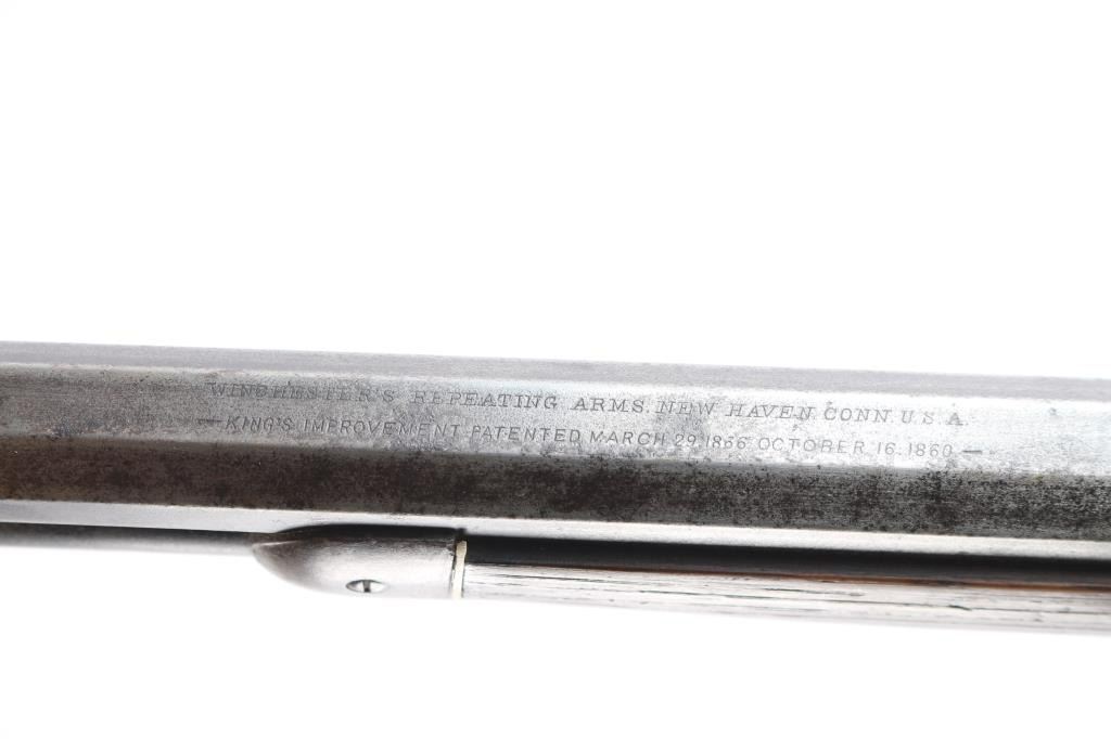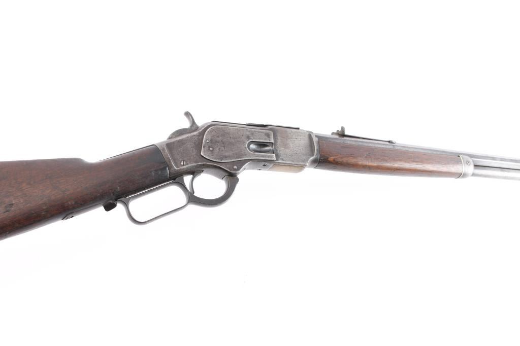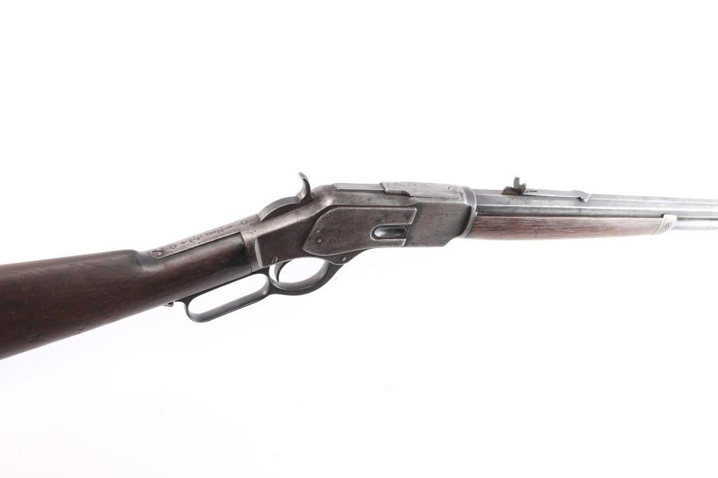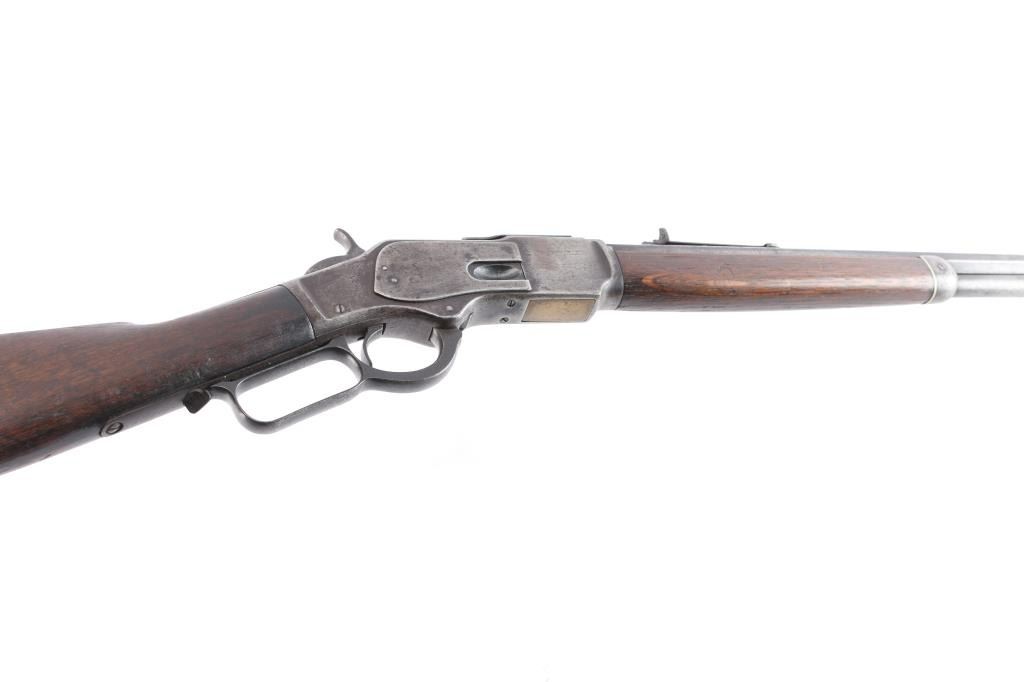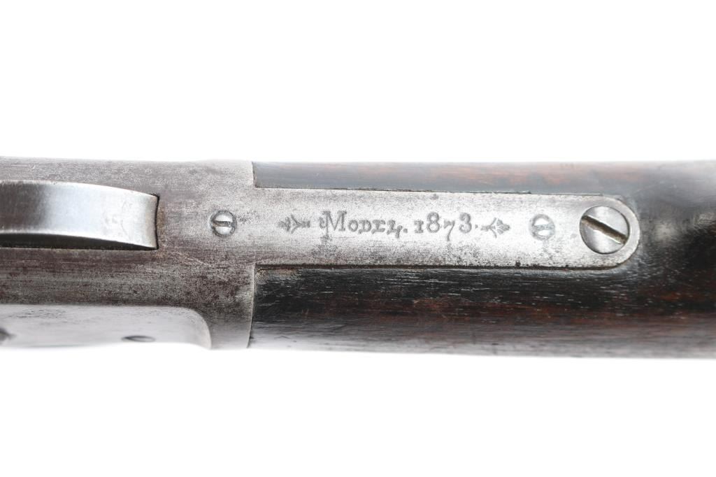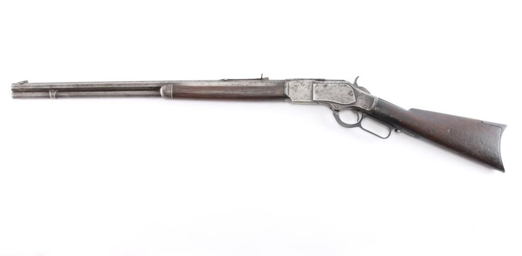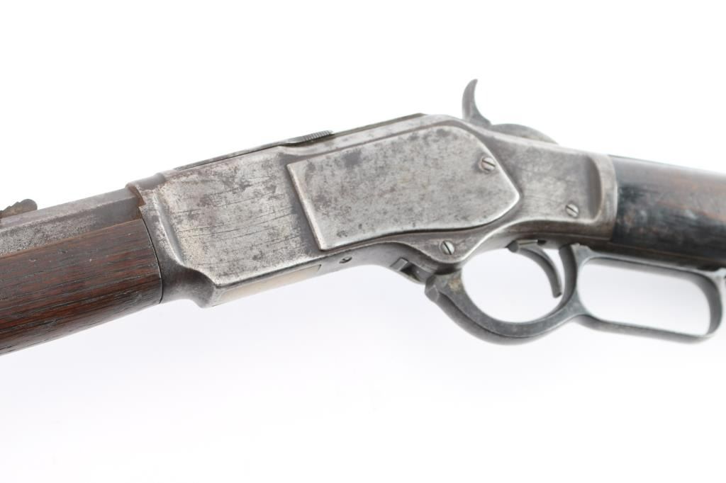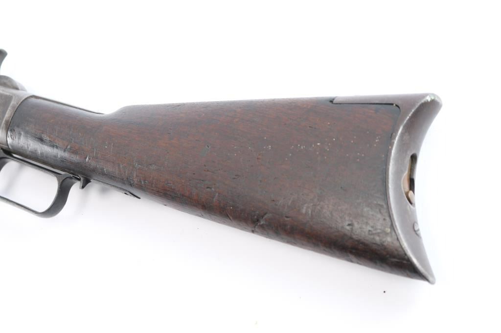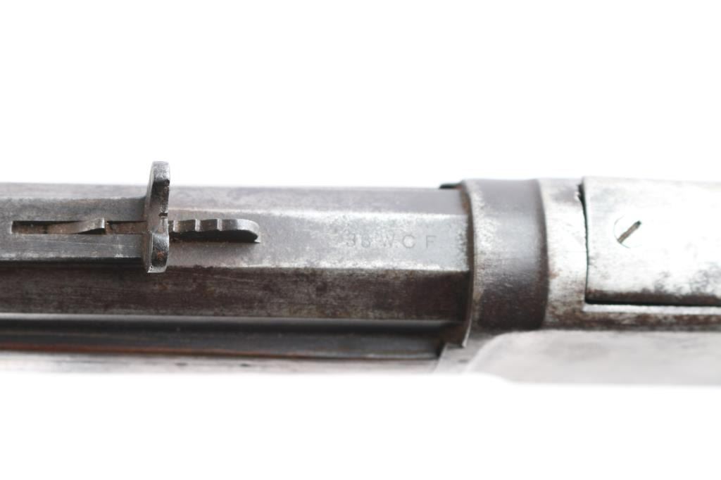 'Third Model' manufactured circa 1896. Features 24" octagonal barrel, full length magazine tube, German silver front sight, buckhorn rear sights, straight wrist, finger lever latch, smooth sliding dust cover with side rear serrations,steel crescent buttplate with compartment for cleaning gear. Bore is fair, with visible rifling, scattered light pitting. Metal surfaces show a molted dull gray patina, some scattered light pitting . Screw slots are generally good. Wood is overall very good/sound, with minor dents and scratches throughout. Butt has good fit to tang. Winchester markings are clear, readable except for the feint ".32 Cal." on the brass lifter.