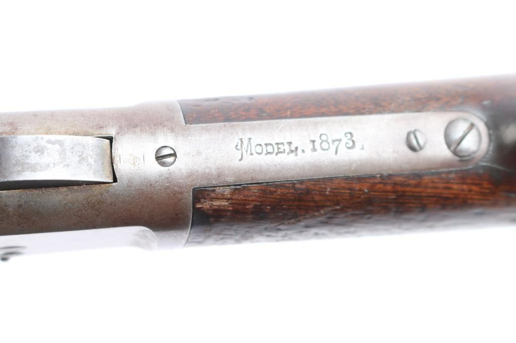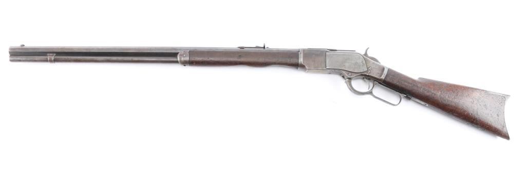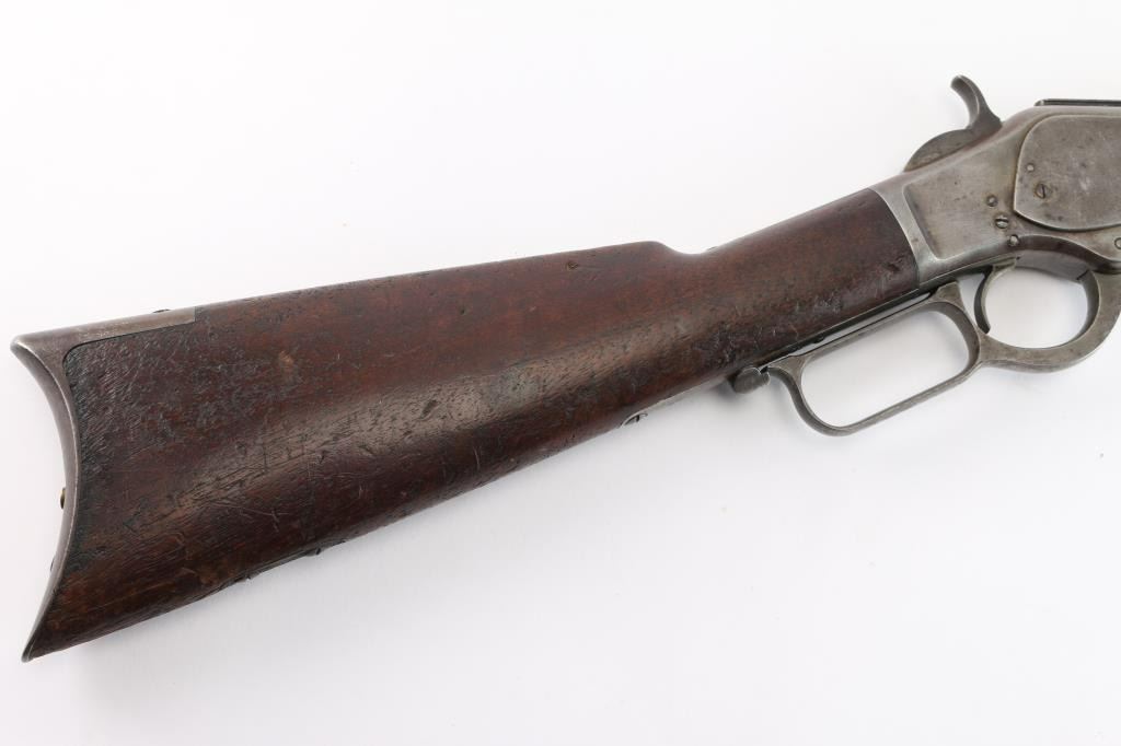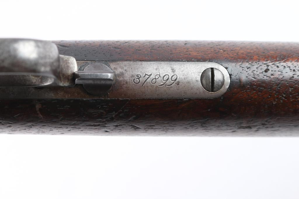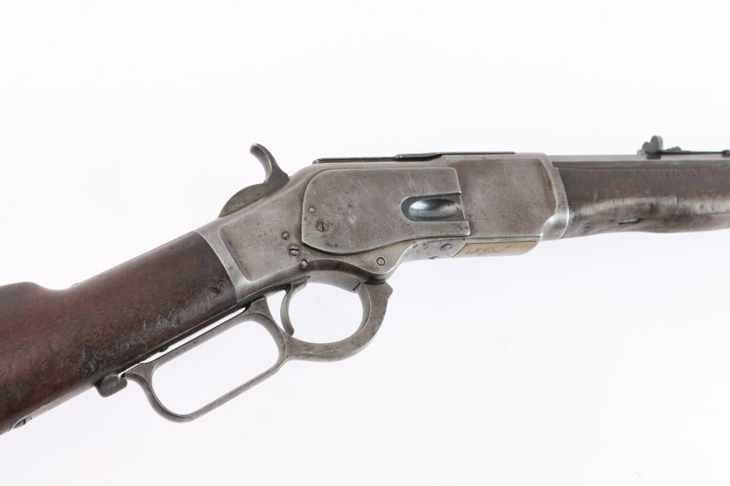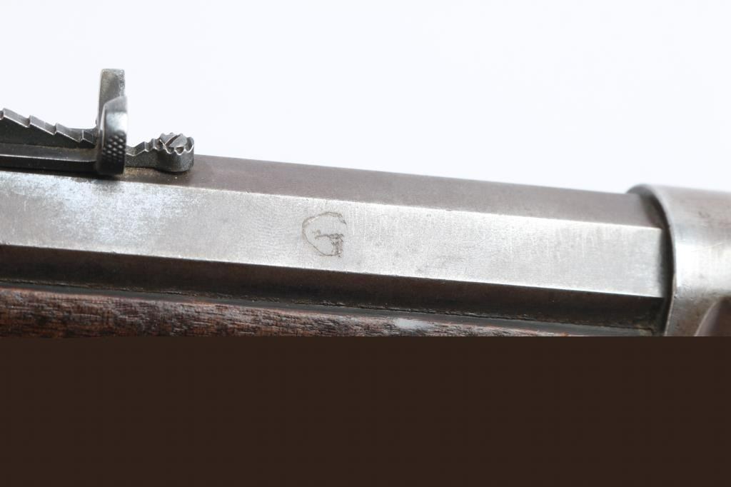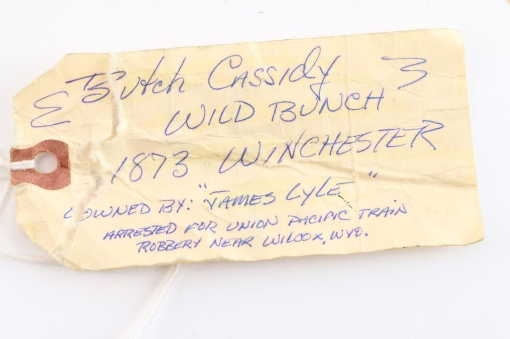 2nd Model c.1878 with lifter inscribed "J Lyle". Believed to be the property of J. C. Lyle, member of Butch Cassidy's gang who was arrested for the Union Pacific train robbery near Wilcox, Wyoming, June 2, 1899. Lyle was a member of the "Wild Bunch", a former Rough Rider and elusive train robber. He was also in the "Hole in the Wall" gang which was active at the turn of the century. Lyle was in Santa Fe, New Mexico, in 1898 when he enlisted in the Rough Riders. He was at San Juan Hill with Roosevelt and gave his home as Georgetown, Colorado upon enlisting. In 1899 he turned to crime as a member of Butch Cassidy's gang. Lyle served his time and lived quietly until his death in 1962 in Colorado. Papers state the rifle was bought from undisclosed family members by a collector. PHYSICAL DESCRIPTION: Fair to good overall condition, showing frontier wear, carry and use as well as exposure to the elements. The metal surfaces are a patina finish with faint traces of finish mixed in where protected. 26" octagon barrel, full mag, rifle butt with thumbprint dust cover (2nd model), No. 37899. Note: 26" are scarce in 2nd model. Good markings and fairly crisp edges. A number 2814025 is electric pencil engraved by the left top of frame (museum collection number?) The wood shows great "pommel wear" on the forend from being carried many years across the saddle. The butt stock is well worn with many imperfections from carry and use. The sling swivels have been removed and a piece of leather inlet into back swivel area. Action good and bore fairly shiny. From a major western history collection.