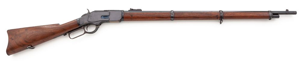 Winchester Model 1873 Lever Action Musket, #570485B, .44-40 cal., 30'' barrel, blue finish, walnut stock with full-length forend, factory musket sight. Mfg'd 1903. Many of these were sold to South American countries where they sat idle for many years, returning to the U.S. for commercial sale in the 1960s. Condition is fine retaining approx. 95%-97% original factory blue, with areas of light corrosion on top of barrel, to both sides of frame above trigger, right bottom forward edge of frame, as well as right side near muzzle. Bottom barrel bands with corrosion on the rear band being slightly heavier; spots on the frame have been cleaned bright. Approx. 80% case colors remain on the buttplate, lever, trigger and hammer. Stock with scattered shallow impressions and scratches; right side of forend near receiver with a larger pressure dent; buttstock appears to have been re-oiled. Bronze lifting block is sharp and clean. Action is crisp, bore is mirror bright. Dustcover slides flawlessly. Est.: $2,500-$4,000. (C&R)
