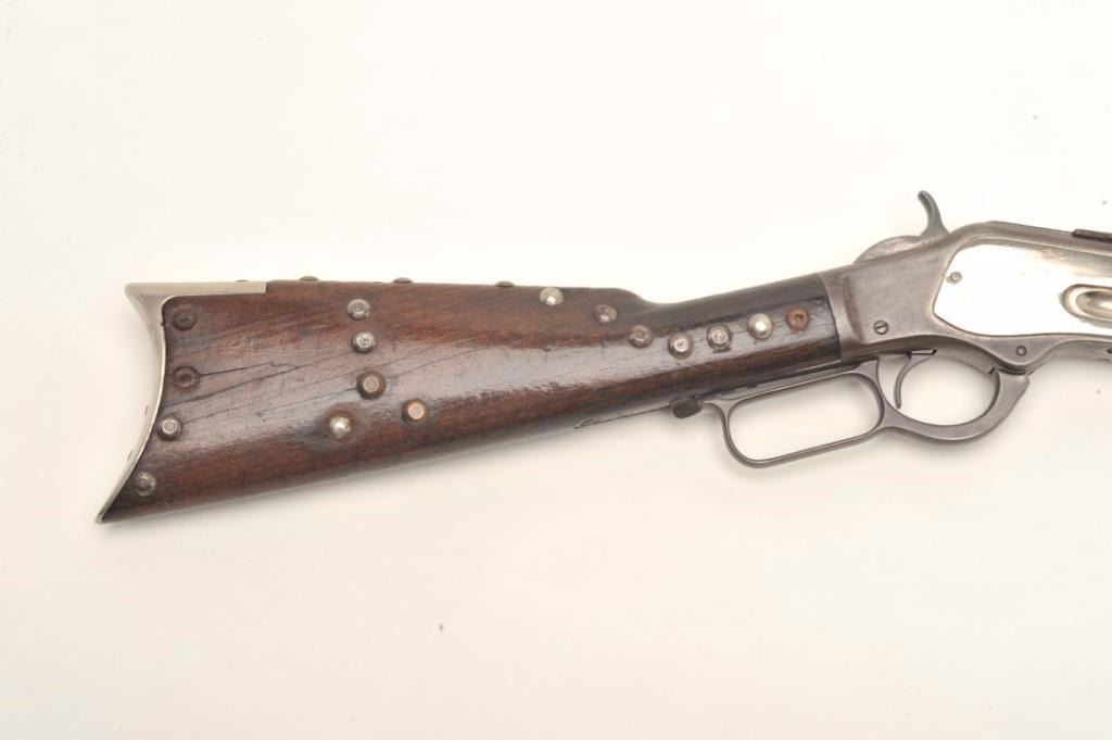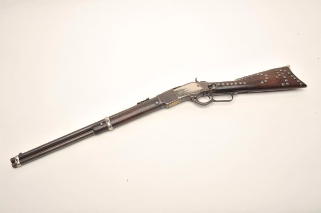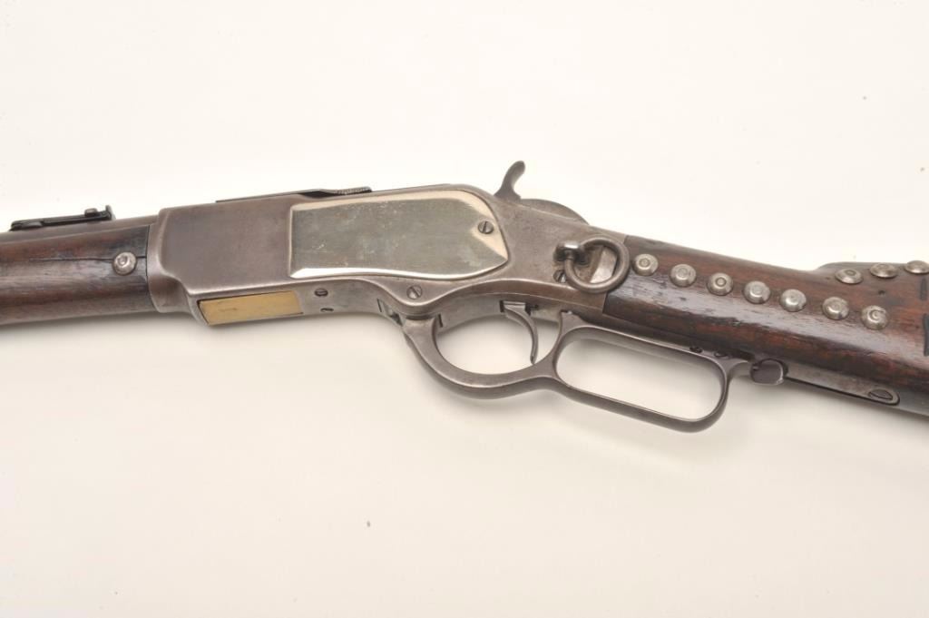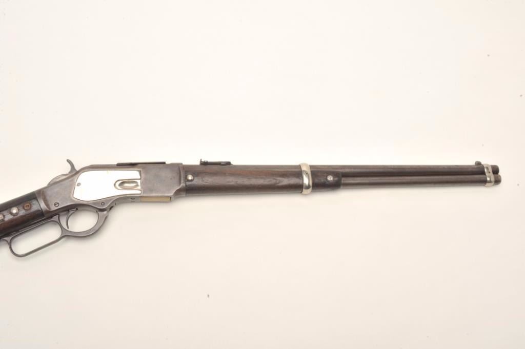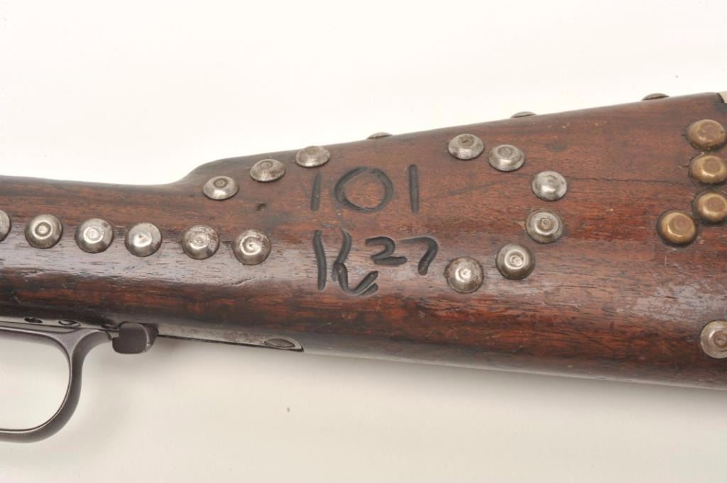 Winchester Model 1873 SRC, .44-40 caliber, 20” barrel, wood stocks, no visible S/N, in overall good condition with tacked wood stocks, old carving into left side of butt stock “101 R27” (101 Ranch), nickel platedside plates, barrel bands and butt plate; good action and bore; sold previously in the Brian Lebel 2009 Cody Old West Auction, Lot 240. (Antique). Est.: $1,500-$3,000.