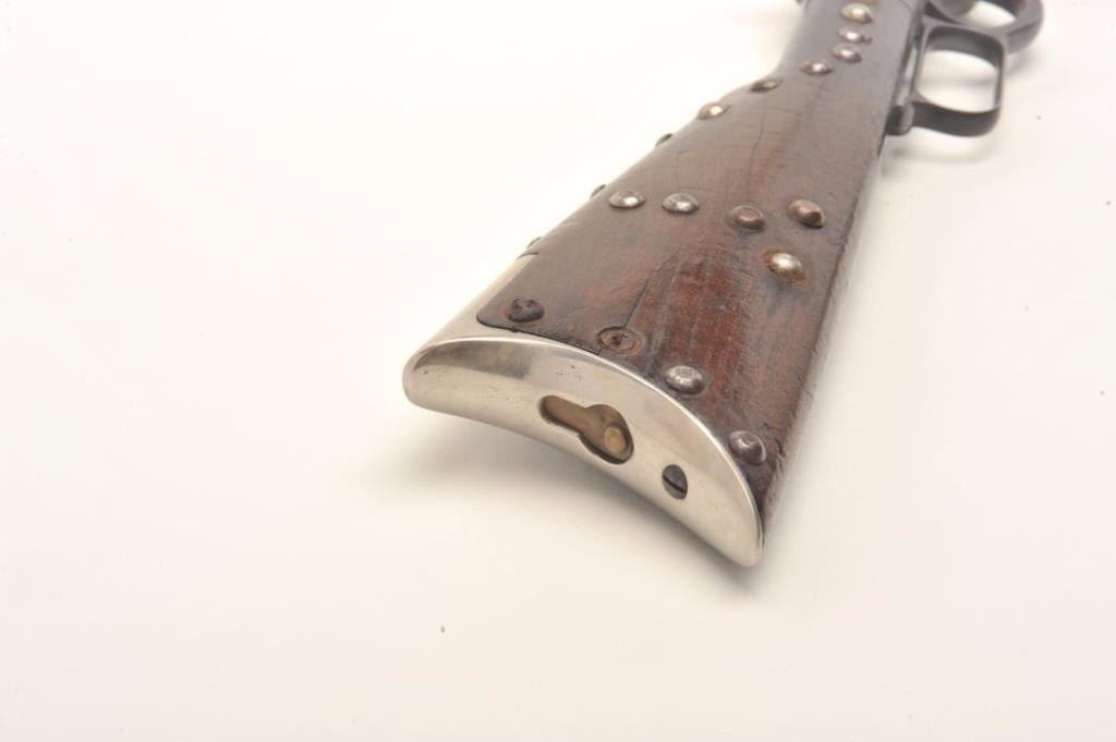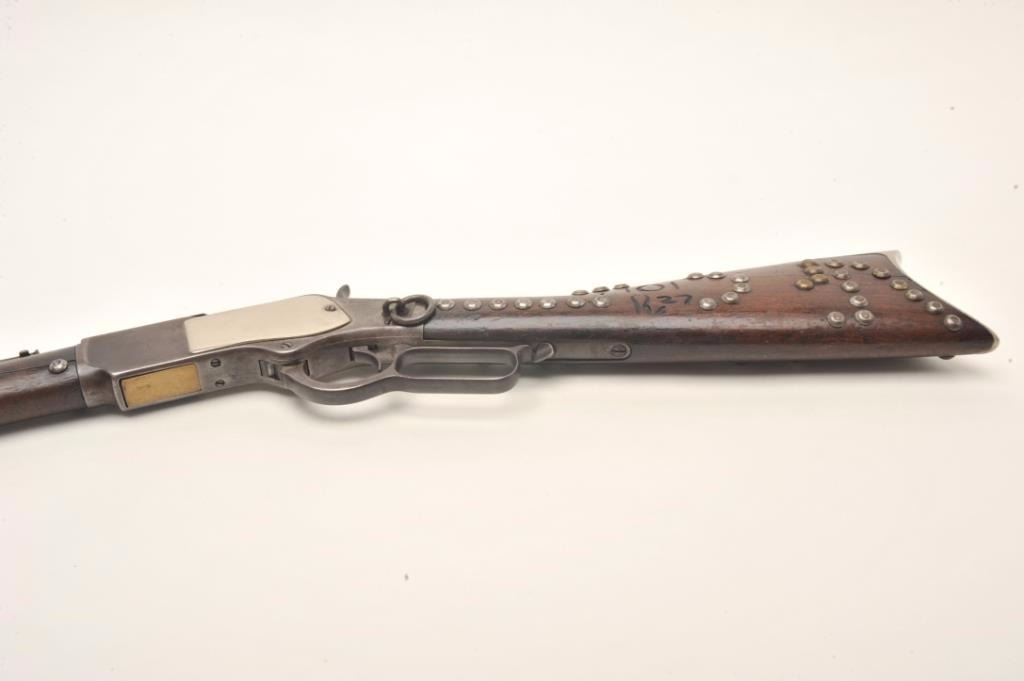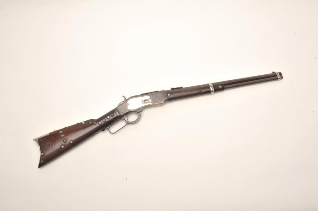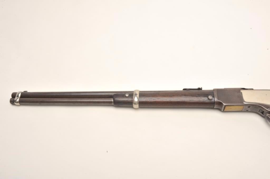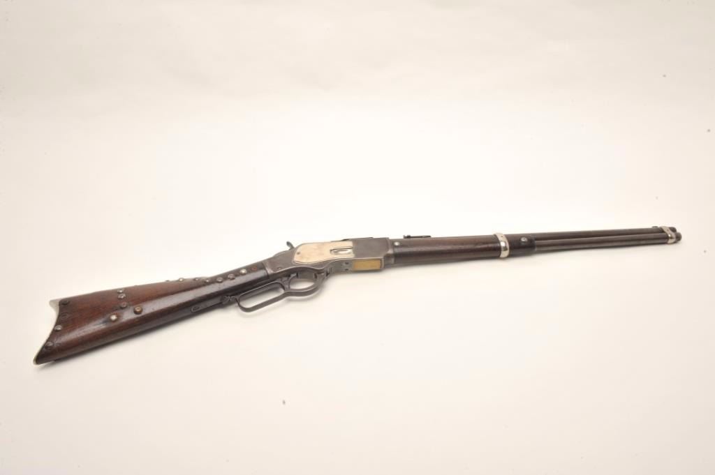 Winchester Model 1873 SRC, .44-40 caliber, 20” barrel, wood stocks, no visible S/N, in overall good condition with tacked wood stocks, old carving into left side of butt stock “101 R27” (101 Ranch), nickel platedside plates, barrel bands and butt plate; good action and bore; sold previously in the Brian Lebel 2009 Cody Old West Auction, Lot 240. (Antique). Est.: $1,500-$3,000.