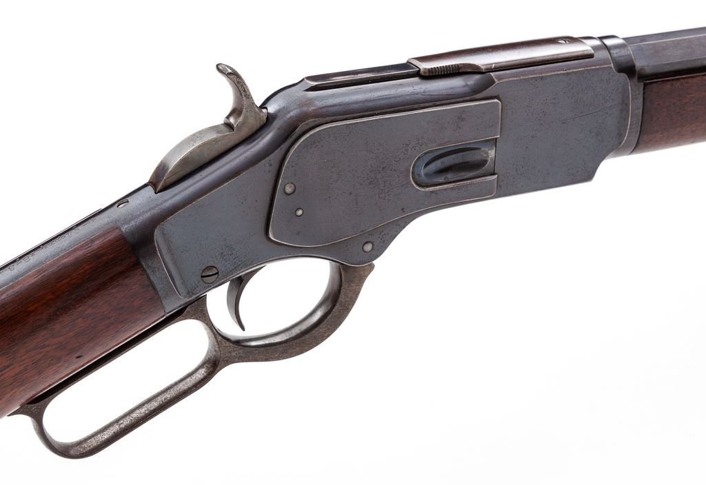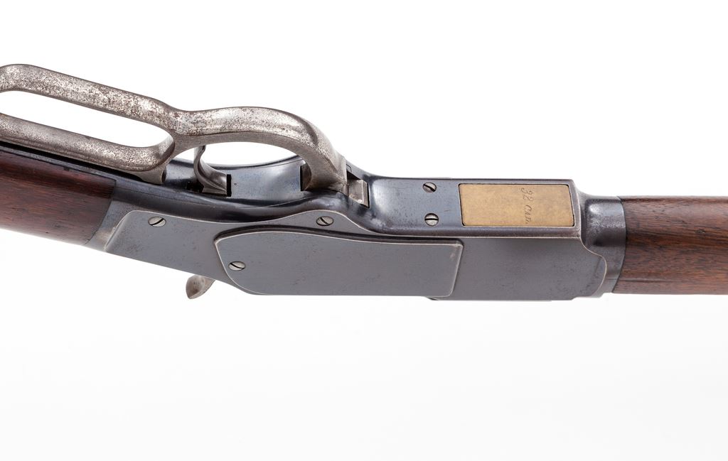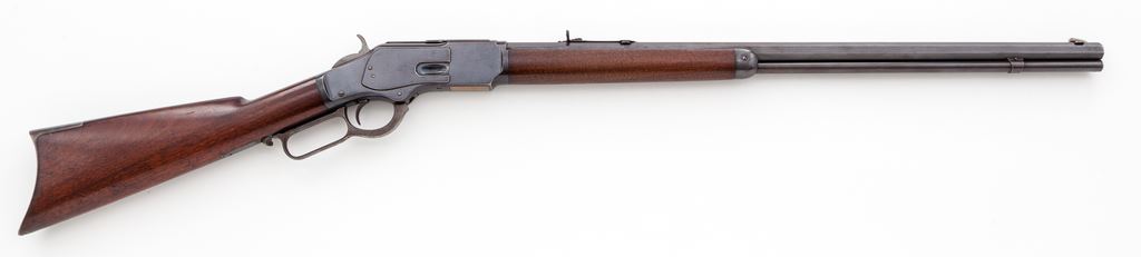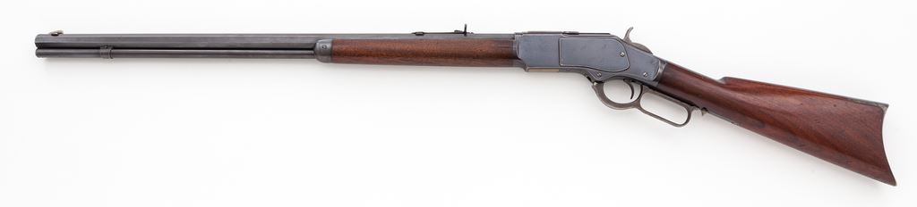 Winchester Model 1873 Third Model Lever Action Rifle, #335618, .32-20 cal., 26'' octagon barrel, blue finish, color case hardened lever and hammer, straight grip walnut stock, crescent steel buttplate, ''Rocky Mountain'' front sight with silver blade and semi-buckhorn rear sight. Upper tang is marked ''MODEL 1873'' with foliate design on each side. Barrel with two-line ''King's Improvement'' and ''October 16, 1860'' last patent date address. Mfg'd 1890. Rifle is in fine overall condition with approx. 60%-70% thinning and toning factory barrel blue, the balance with a light brown patina. Receiver retains approx. 85%-90% of a nice polished blue finish with tiny specks of reddish brown freckling and also shows light thinning and wear; areas of finish loss with a mellow brown patina. Dustcover has worn and toned to a light brown overall. All factory lettering is clean and clear. A very small amount of case color highlights can be found on the lever with specks of reddish brown oxidation in the handling areas. Hammer shows 75% lightly fading case colors. Buttplate has worn to a mostly silvery gray with cloudy dark spotting. Wood shows general small dings and scratches with a good tight fit at the upper and lower tang, etc. Forend with normal thinning to the finish from handling. Buttstock with what appears to be an older added coat of linseed oil type finish with a few spots of mild darkening near the metal. Action and bore are both fine with a smooth hammer and trigger; bore shows moderate wear to the lands but looks great for its age. Est.: $3,000-$5,000. (Antique)