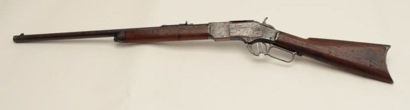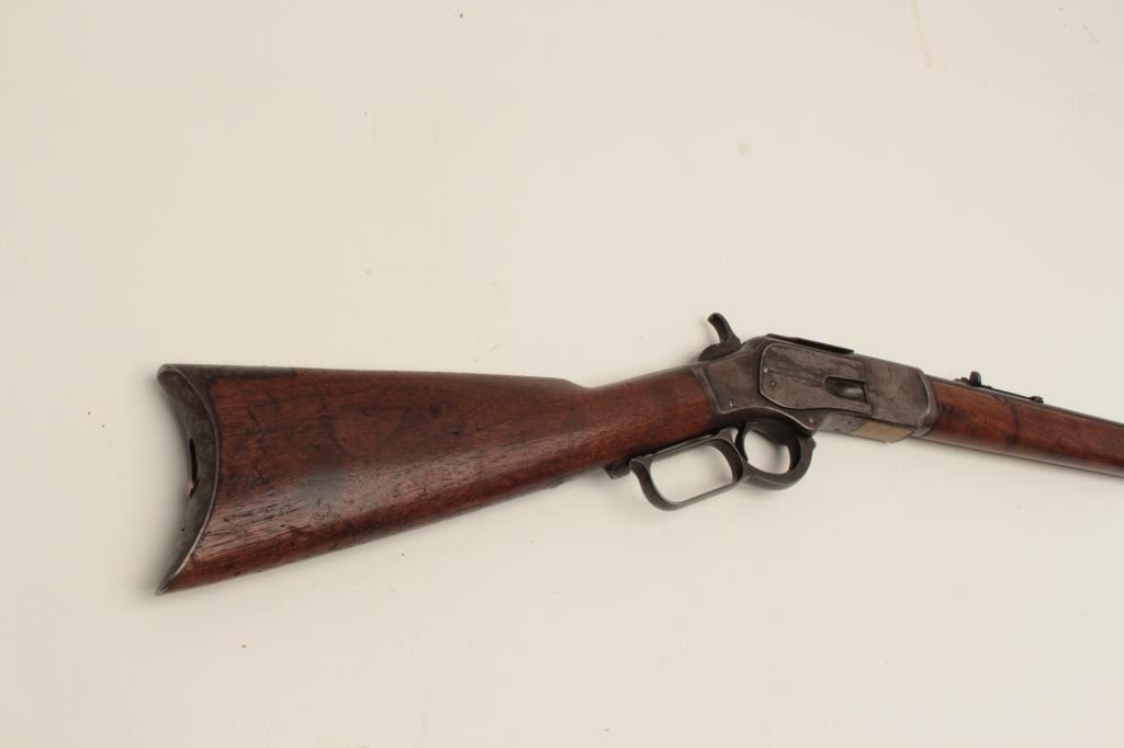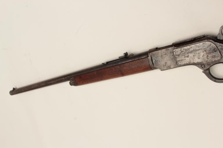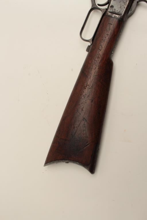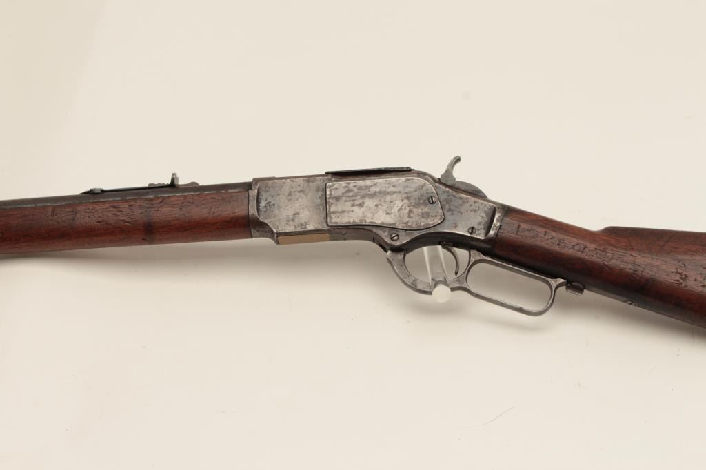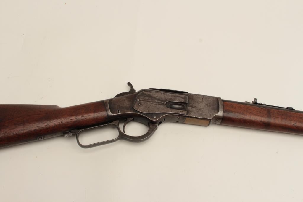 Winchester Model 1873 lever action rifle, half magazine, .44 caliber, 24” round barrel, blued finish, wood stocks, S/N 91345, in overall good + condition showing a dark patina to metal surfaces with scattered areas of erosion; some traces of original blue in protected areas of receiver, fair + bore, good action, overall good wood with scattered mars, dings and scratches from carry and storage plus some oil staining. Accompaniedby a factory letter confirming rifle, round barrel, plain trigger and half magazine; received in warehouse on Oct. 16, 1882 and shipped on the same date to Order number 35910. (Antique). Est.:$1,200-$2,400.