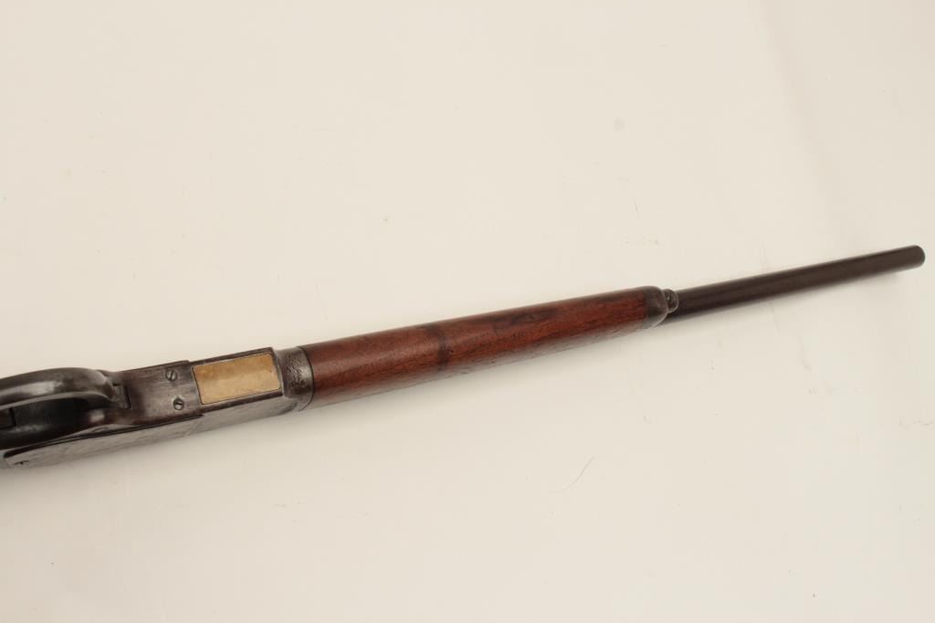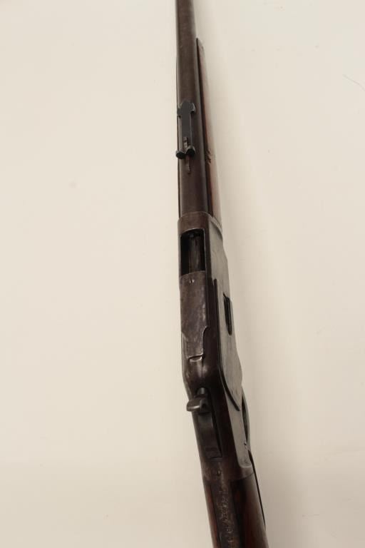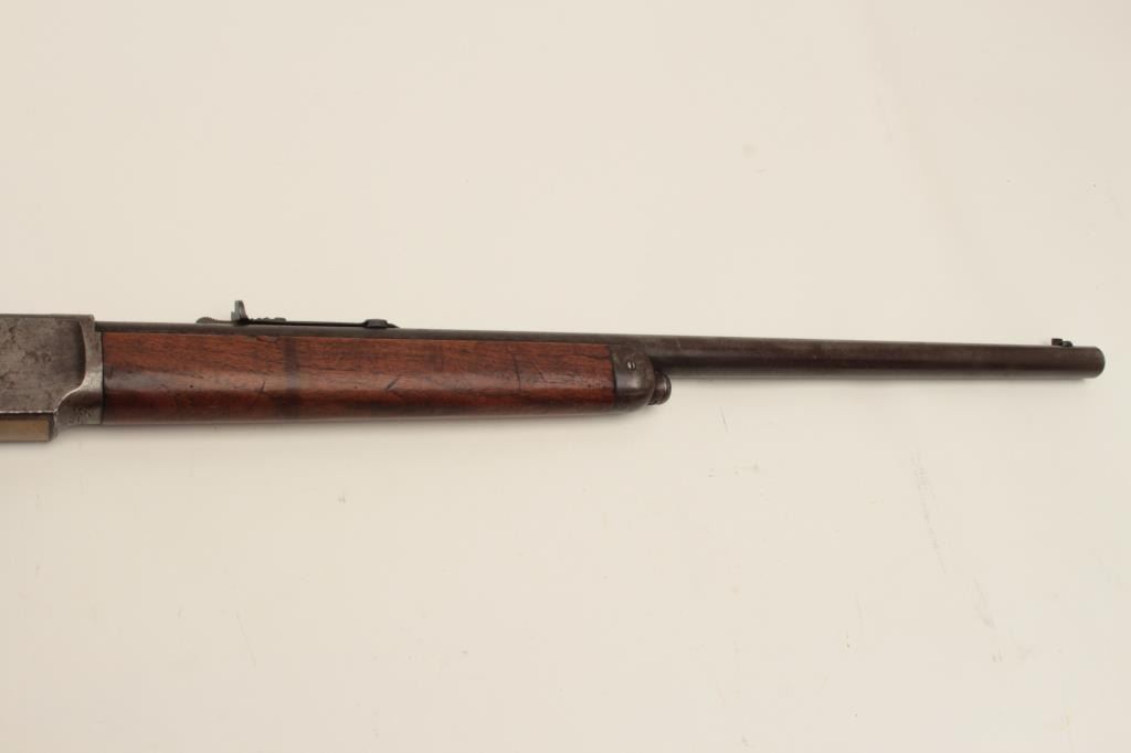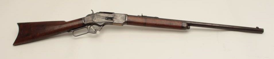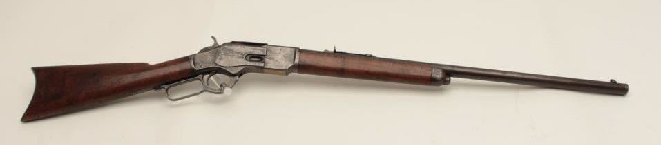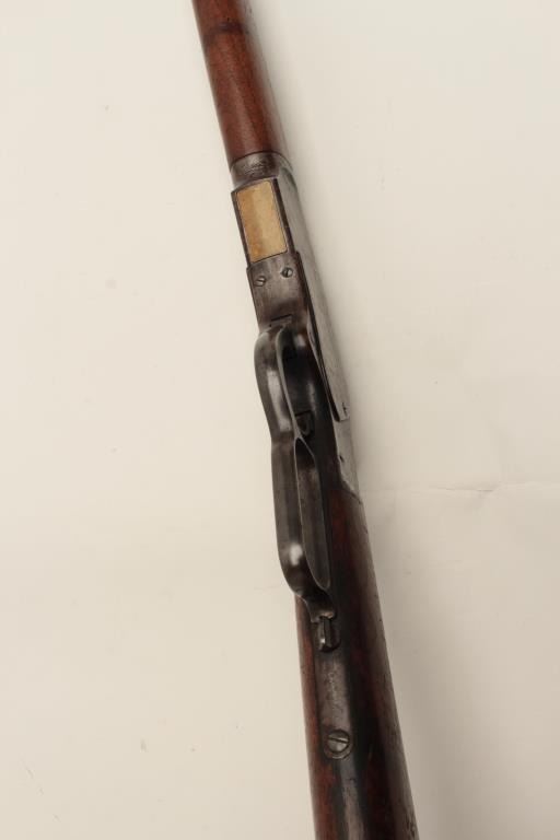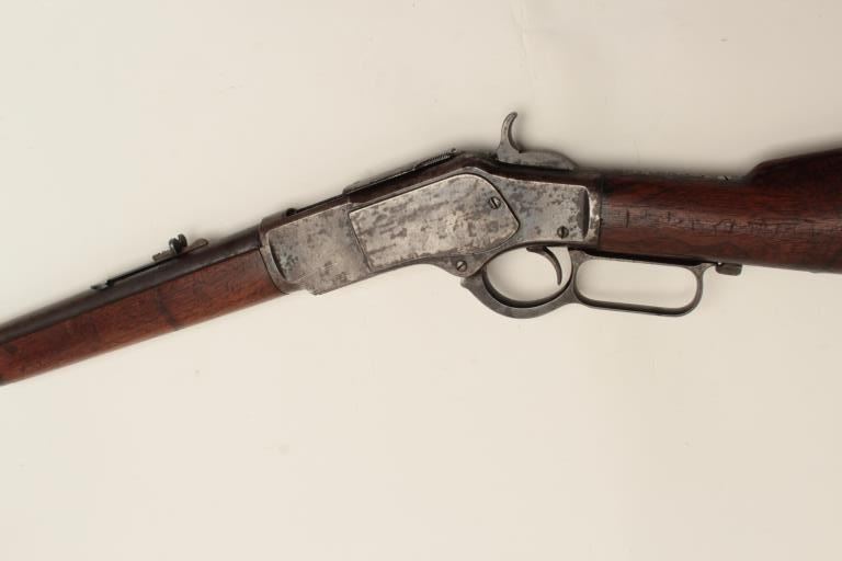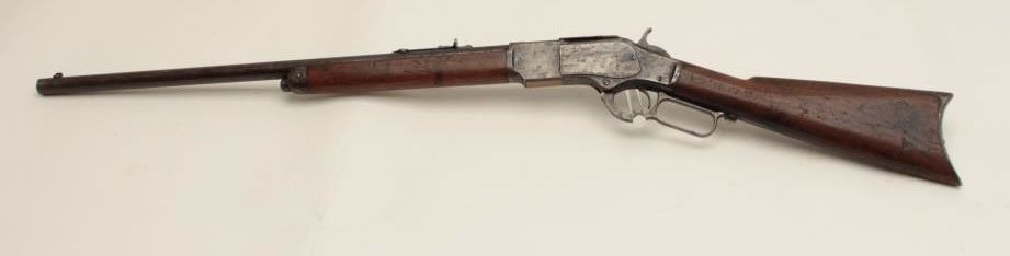 Winchester Model 1873 lever action rifle, half magazine, .44 caliber, 24” round barrel, blued finish, wood stocks, S/N 91345, in overall good + condition showing a dark patina to metal surfaces with scattered areas of erosion; some traces of original blue in protected areas of receiver, fair + bore, good action, overall good wood with scattered mars, dings and scratches from carry and storage plus some oil staining. Accompaniedby a factory letter confirming rifle, round barrel, plain trigger and half magazine; received in warehouse on Oct. 16, 1882 and shipped on the same date to Order number 35910. (Antique). Est.:$1,200-$2,400.