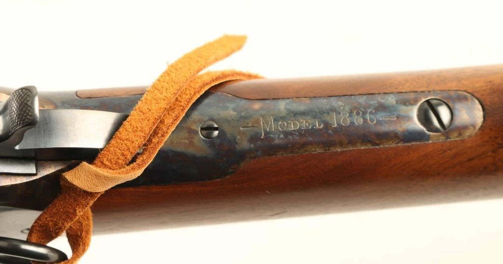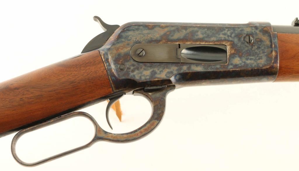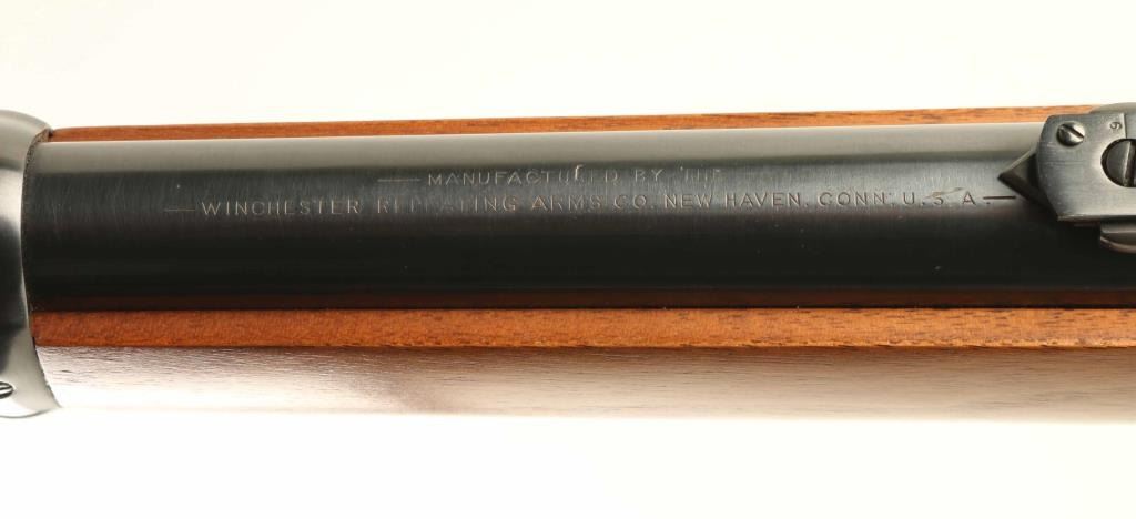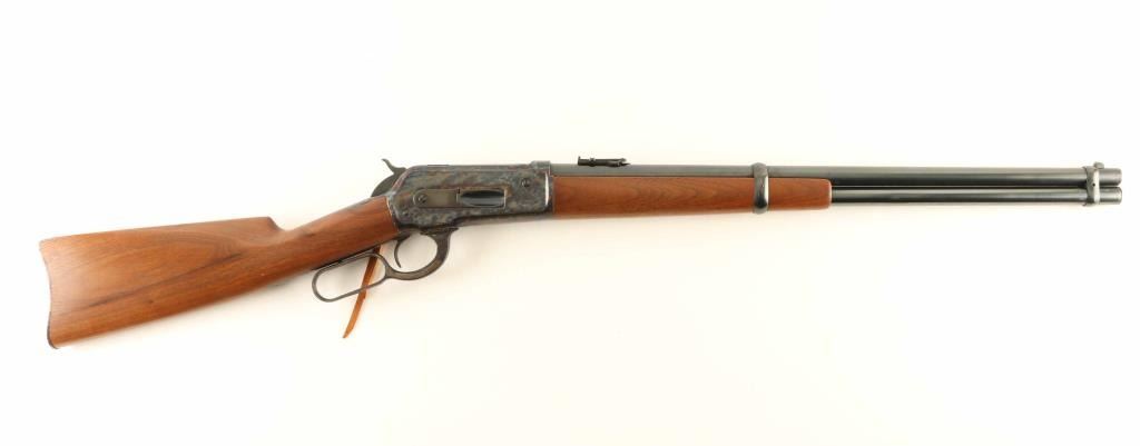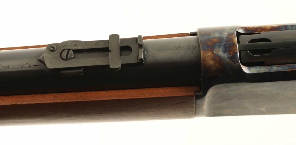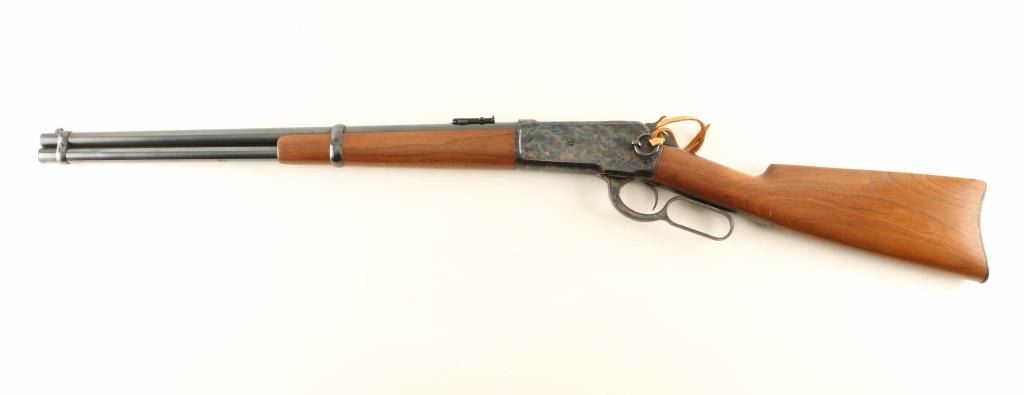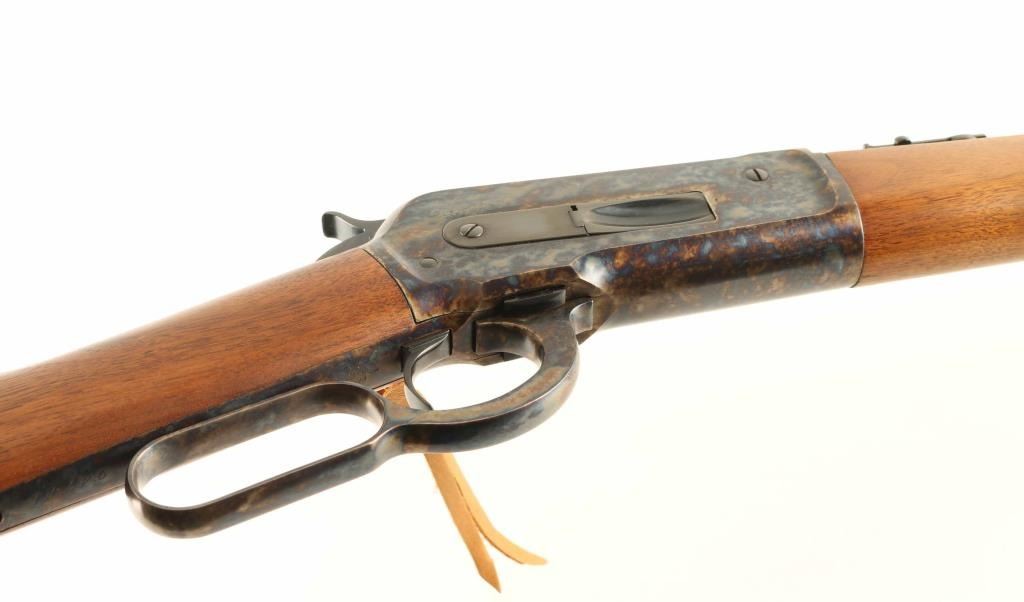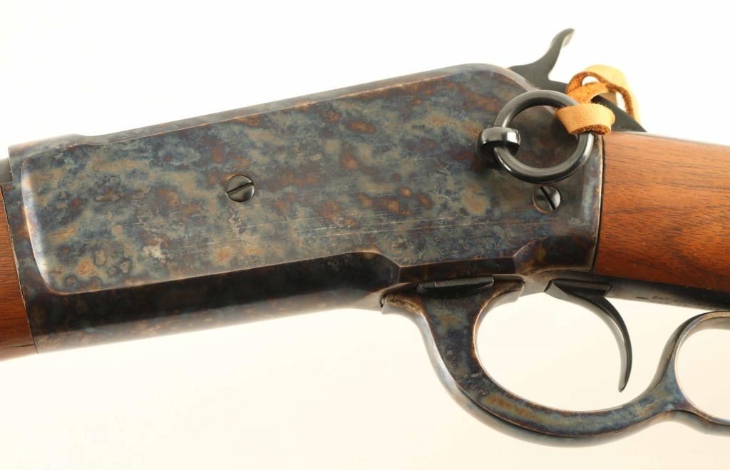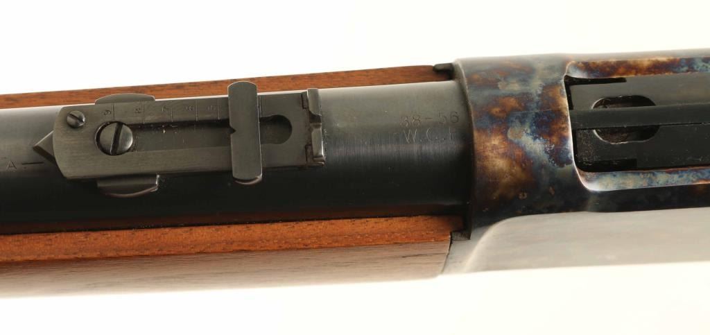 'Saddle Ring Carbine' manufactured circa 1895. Refinished - work attributed to Turnbull Restorations. Features 22" round barrel, full length magazine tube, blade front & folding ladder rear sights, straight wrist, curved steel buttplate, saddle ring. Bore is very good condition. Barrel, bolt, bands & magazine tube retain 90% dark re-blue, with signs of use and handling. Action and buttplate display fiery bright case color, mottled bright blue & gold, very good to excellent condition. Wood is very good to excellent condition, with small scratches & dents, good fit to metal, buttplate toe is slightly proud of wood. Action is smooth. Two line barrel address is shallow, even & readable. Other markings are shallow but crisp. Condition is NRA Excellent - as restored *** Antique Firearm ***