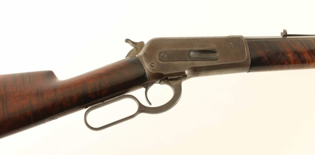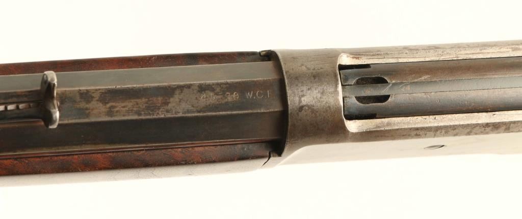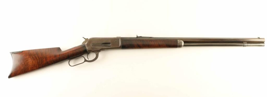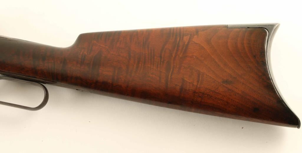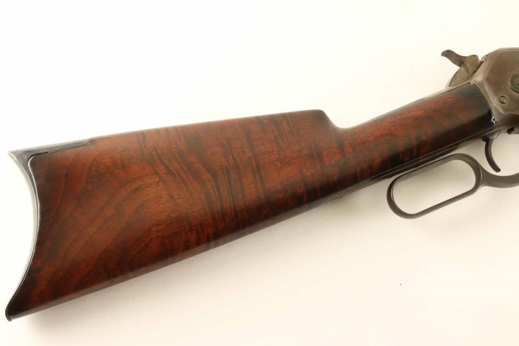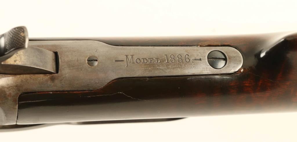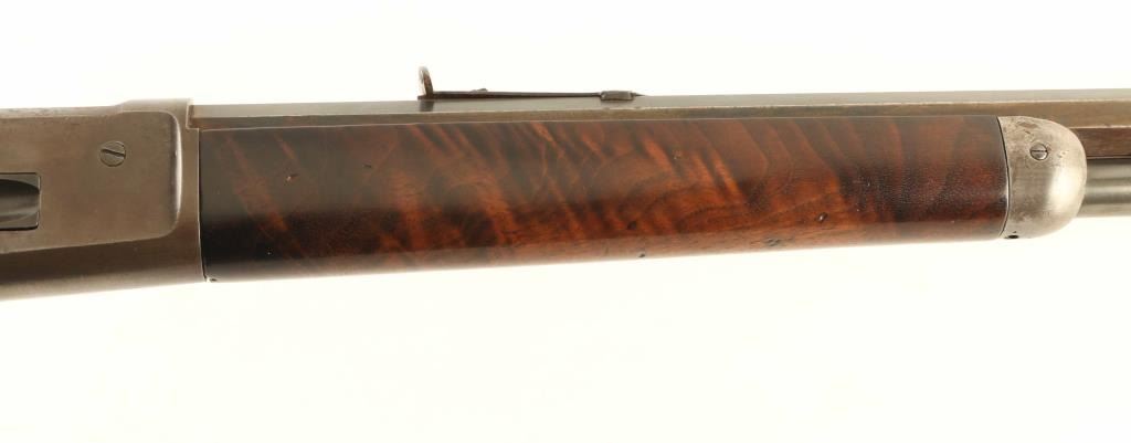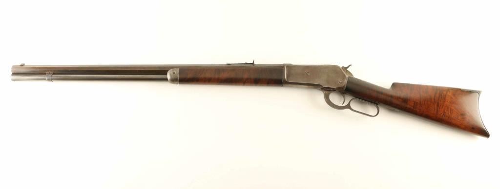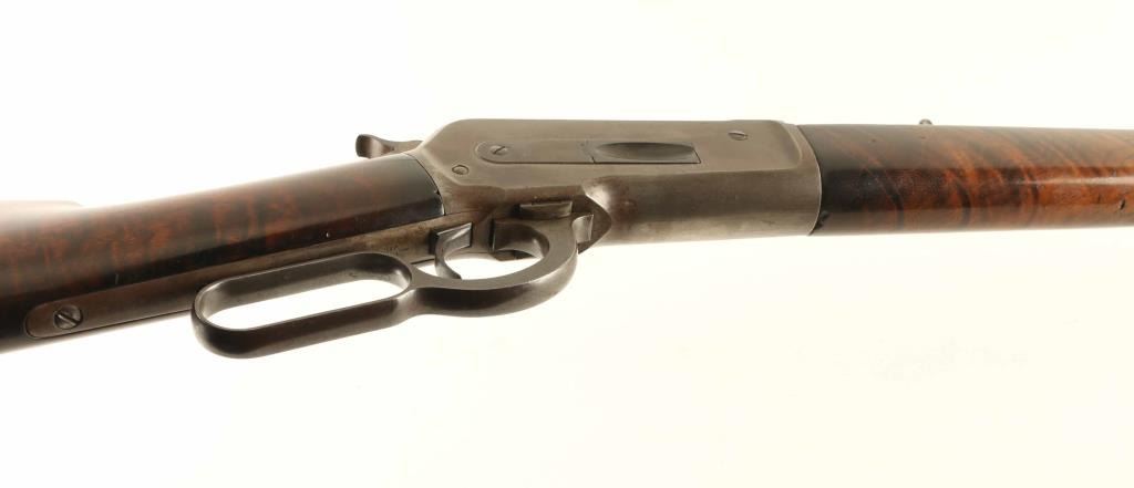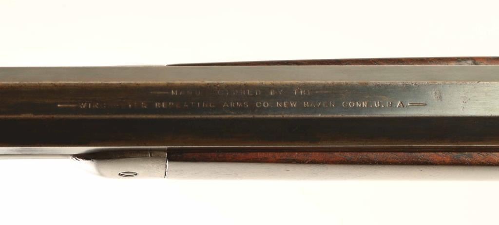'Sporting Rifle' manufactured circa 1891. Features 26" octagon barrel, full length magazine tube, buckhorn sights, straight wrist, crescent buttplate, fancy figured walnut with fiddleback grain. Bore is good condition, frosted with tiny pits, strong rifling. Barrel retains 20% blue, mostly on flats, remaining metal fading to brown and thinning, especially at edges. Magazine tube retains 60% thinning blue, turning to gray. Action displays a grayish color with brown flecks, small areas of pitting, scratches and dents, brighter almost bare metal on top tang and bottom of receiver.. Buttplate is reblued over previous light pitting. Wood is very good condition, many small scratches & dents, good fit to metal. Action is smooth. Two line barrel address is readable, slightly dished across middle. Serial number is shallow, readable, even depth. Model marking on top tang is crisp, with light patina across letters. Condition is NRA Very Good *** Antique Firearm ***