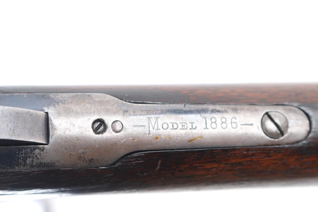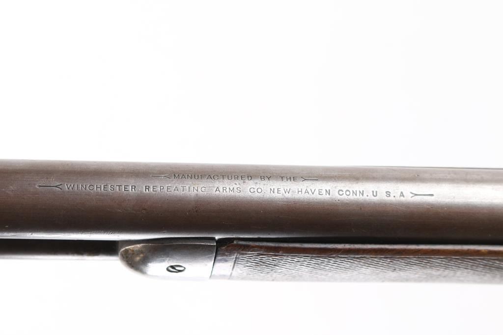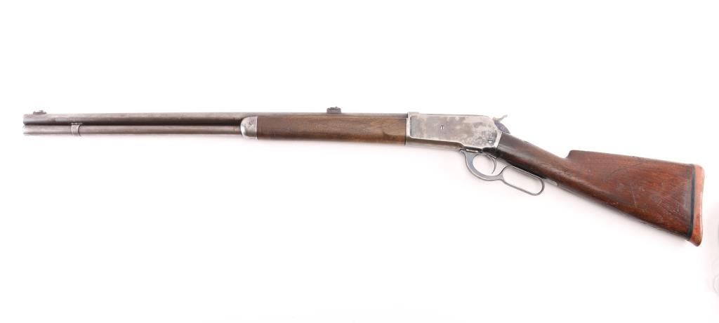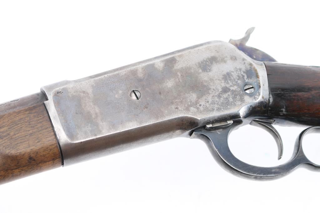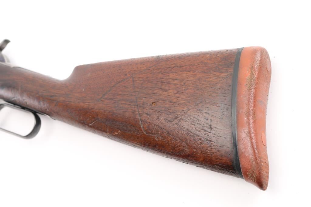 British proofed American lever action rifle, with British Gun Maker mark on stock. Has been re-worked/repaired. Features blued & case color finish, 26" round barrel, blade front sight in raised dovetail block, express sight on barrel with one standing and one falling leaf, full length magazine tube, early type latch on left side of lever, checkered walnut forend with thicker step contour to rear, smooth walnut stock with straight wrist & shotgun butt, solid rubber recoil pad. Repair evident on right side of hammer. Small divot machined into underside of finger lever. Bore is good condition, bright with strong rifling, showing very light frosting. Retains 10% original finish, barrel and mag tube have faded to a dull dark gray color, some bare metal where cleaned, some patina spots. Receiver colors are now mottled dark & light gray, bare metal on edges & high spots. Wood is good condition with scratches and small dents, oil staining next to receiver. Checkering on forend shows smoothing, erosion to portions of pattern. Some tiny cracks visible behind tang. Markings are generally readable, with some thinning in barrel address. Bottom tang markings include patent dates, and hand stamped "111" (possibly three vertical punch marks, not numbers) and "770". Lower tang has been shortened, and stock inlet filled with a matching piece of wood. Stamp on stock behind bottom tang is oval shaped, stamped over top of repair, "EDWINSON GREEN / GUN MAKERS / CHELTENHAM", faint, most letters readable under magnification from a slight angle. A factory letter on this rifle could be possibly very interesting. Condition is NRA Good+ *** Antique Firearm ***