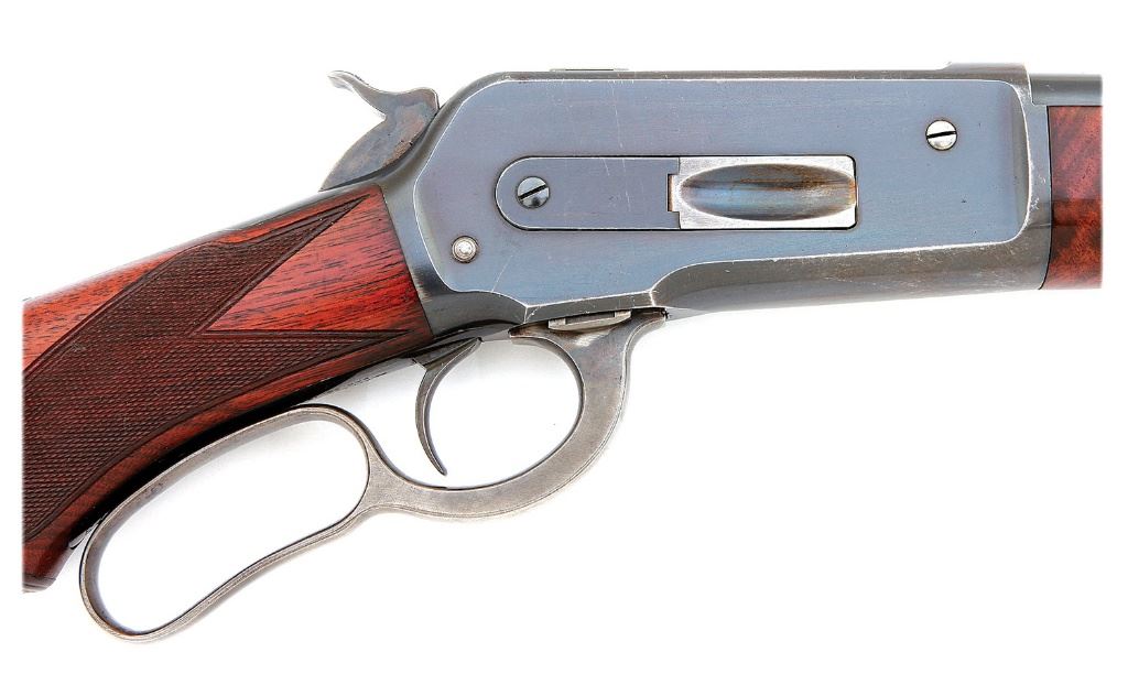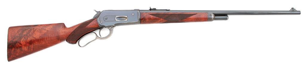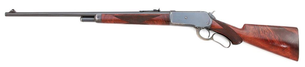 serial #136973, 33 WCF, 24" round barrel with half magazine and a bright excellent bore. This is a lovely '86. The barrel and magazine retain 95% original blue finish. The action retains about 90 - 95% original blue with loss being due to thinning on belly of action. Case color on hammer and lever is strong. The checkered pistolgrip walnut buttstock and forend are beautifully figured and rate excellent plus with sharp checkering and virtually all of their original finish. The original smooth steel shotgun buttplate retains about half of its original blue. Rifle features a beaded blade front sight mounted in ramp and a semi-buckhorn rear sight. Factory records list this as a rifle, 33 caliber, round barrel, plain trigger, 1/2 magazine, shotgun butt and with a ship date of December 9, 1905. The lower left tang is marked with assembly number "941 XX", this assembly number appears also in the top tang channel of stock. A very crisp, all original deluxe 1886 rifle. (1D11739-98) {C&R} (4000/6000)