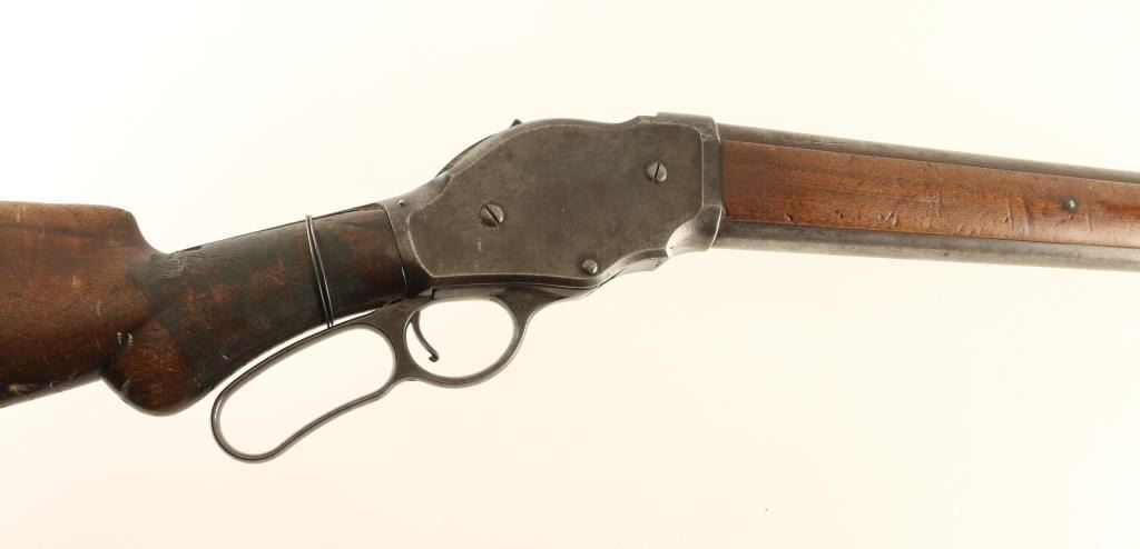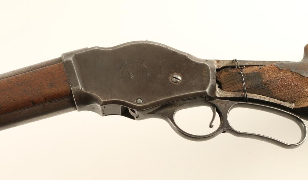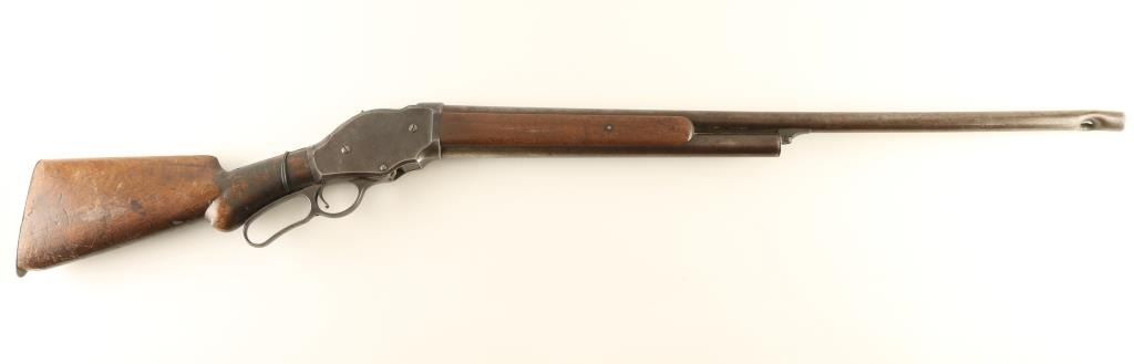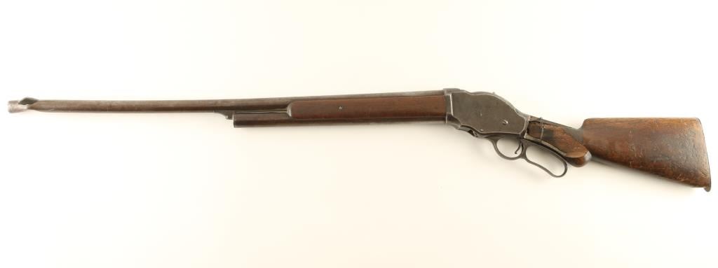 Shotgun. Lever Action. Produced 1887-1899. 30" round barrel. Fed from a 5 rd. tube magazine. Used by Law Enforcement, and Stagecoach companies. Blued finish has turned a brown patina. Winchester Repeating Arms Co. Logo on left side of receiver. Action works. Walnut stock has 4" chip on left side by tang. Also a chip by the lower stock by the butt plate. There is a bullet strike on the barrel, 1.5 " below the muzzle. Wall hanger condition. NRA Condition-Poor Antique Firearm.