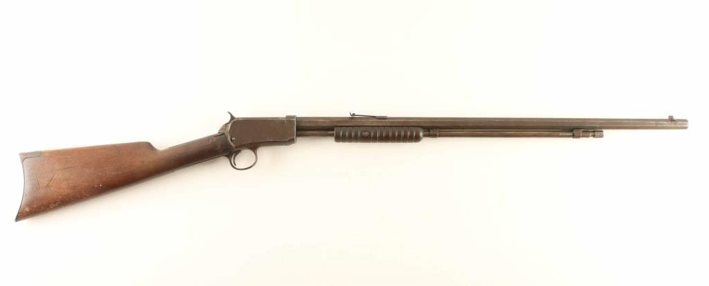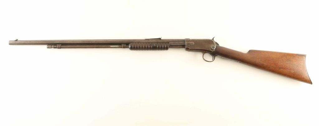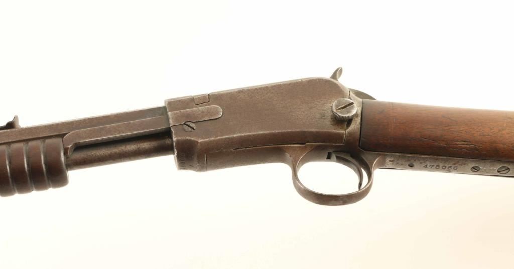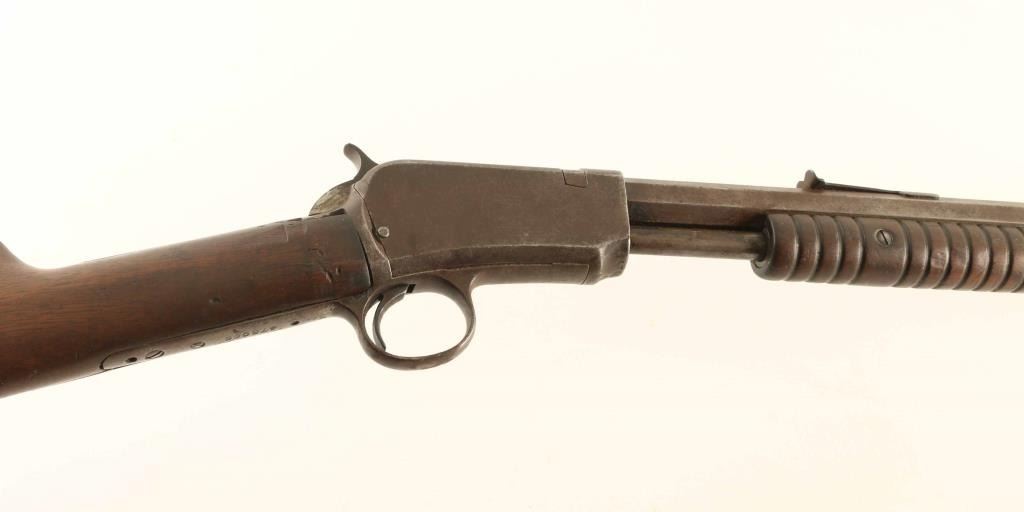 Pump action rimfire rifle manufactured circa 1913. Features 24" octagonal barrel, adjustable buckhorn style sights, magazine tube under barrel, exposed hammer, wood furniture, semi crescent buttplate. Bore is fair condition, visible rifling with frosted appearance, somewhat dark overall. Metal surfaces are uniformly dull brown or brownish gray color with light patina, bare metal on sharp edges. Wood is good condition with many scratches and dents, carved triangle approx 1" across on right butt. Condition is NRA Fair *** C&R Firearm ***
