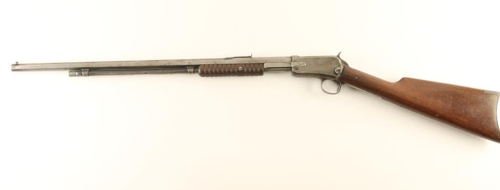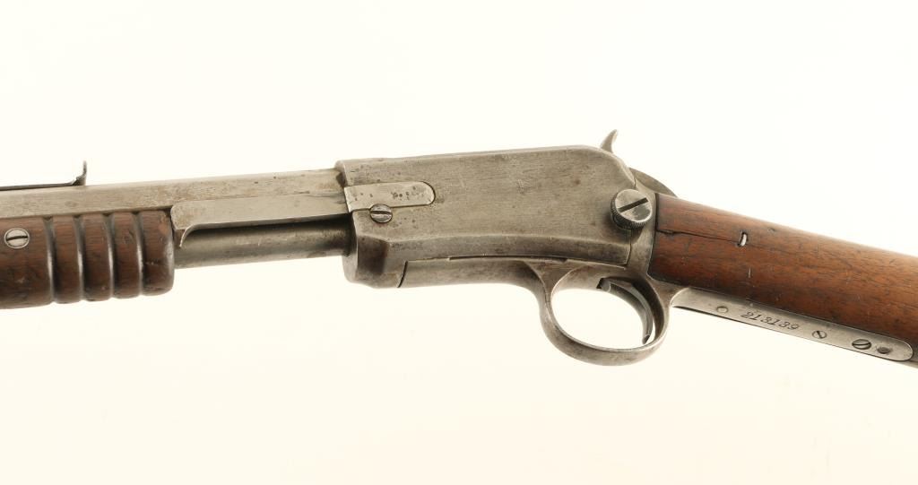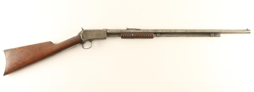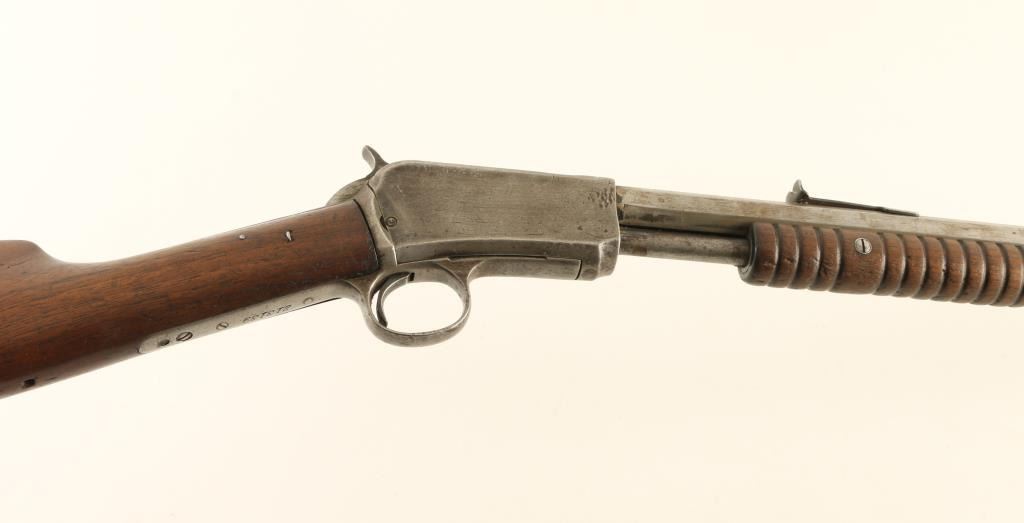 Rifle, Pump-Action. 3rd Model, manufactured in 1904. 24" octagonal barrel, with leaf sight. 18" tube magazine. Take-down bolt located on the left side of receiver. Bore appears to have some minor pitting. Metal finish is in the white, and has been cleaned/scrubbed. Markings are clear. Action is rough/sticks. Wood is ok, with a crack in the fore grip. The stock is cracked by the tang, and has been repaired with nails. The front tang screw is missing. NRA Condition-Fair. C&R Firearm.